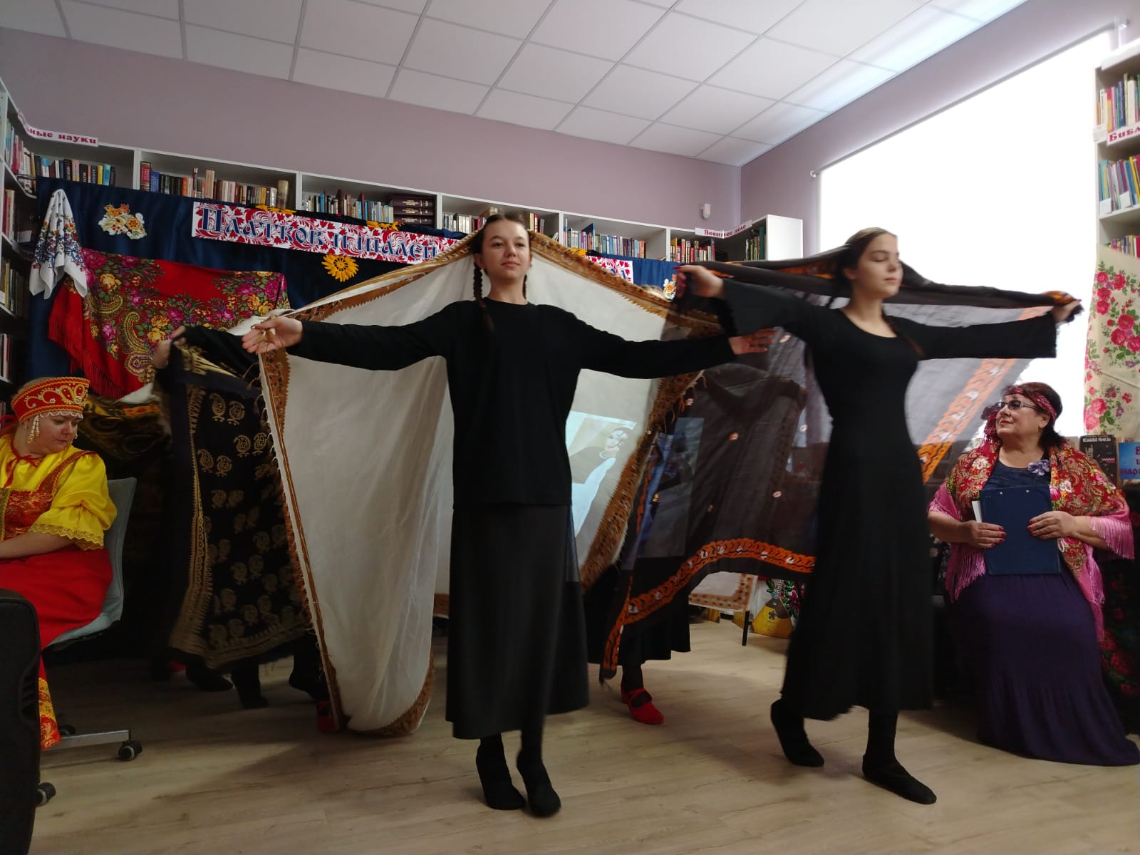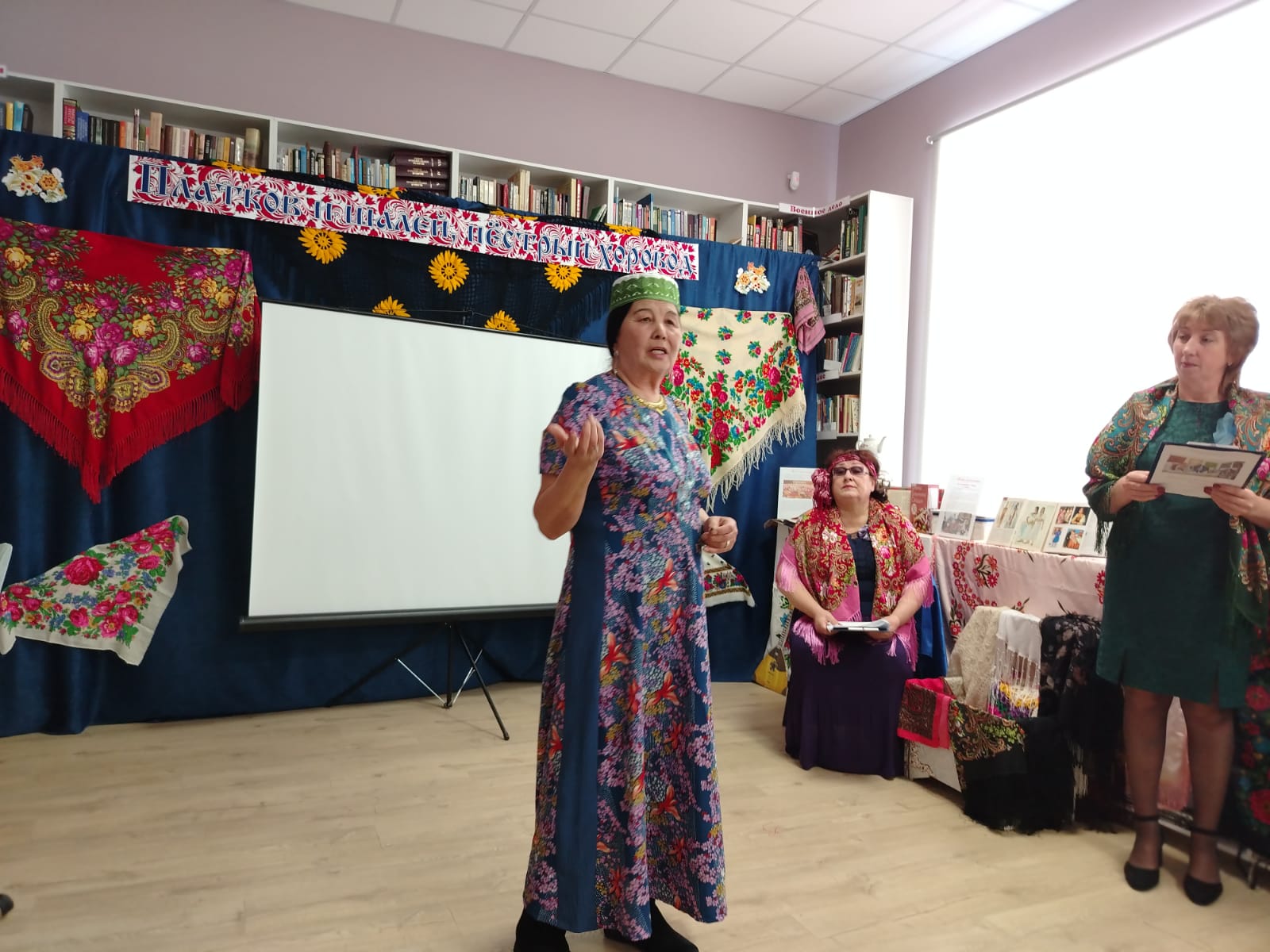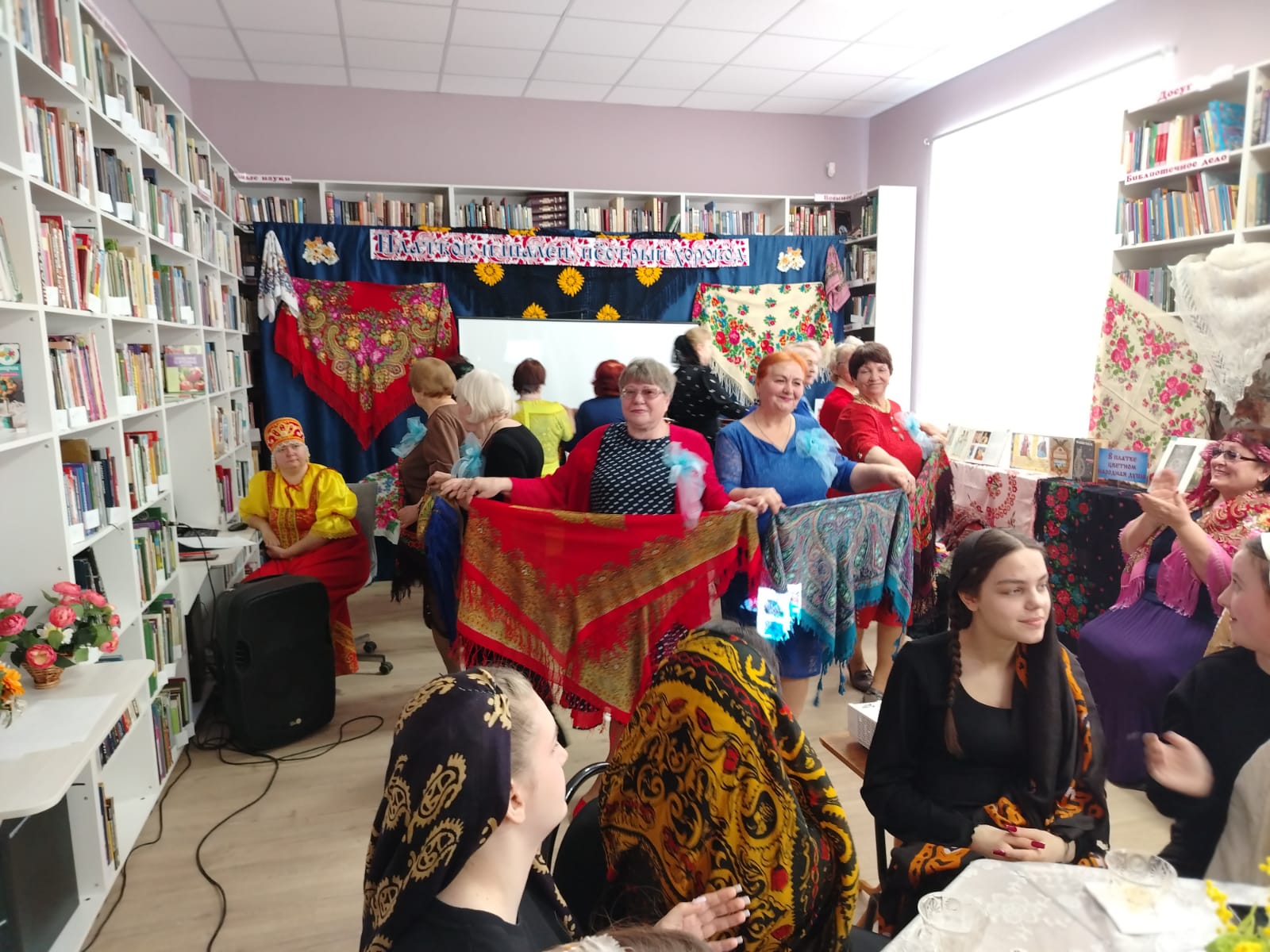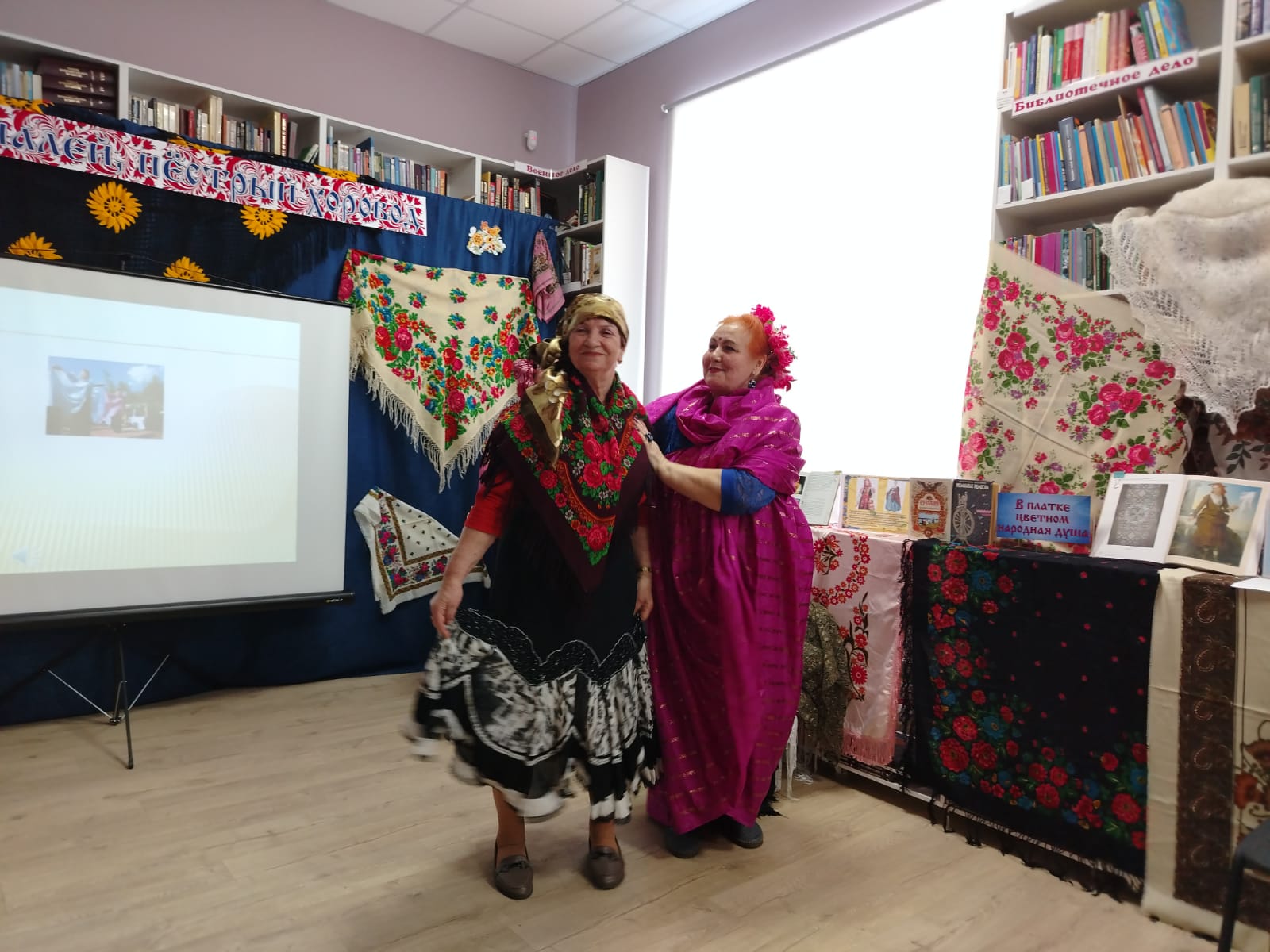 К мероприятию в библиотеке была оформлена выставка-инсталляция «В платке цветном народная душа» с красочными платками, шалями, книгами.