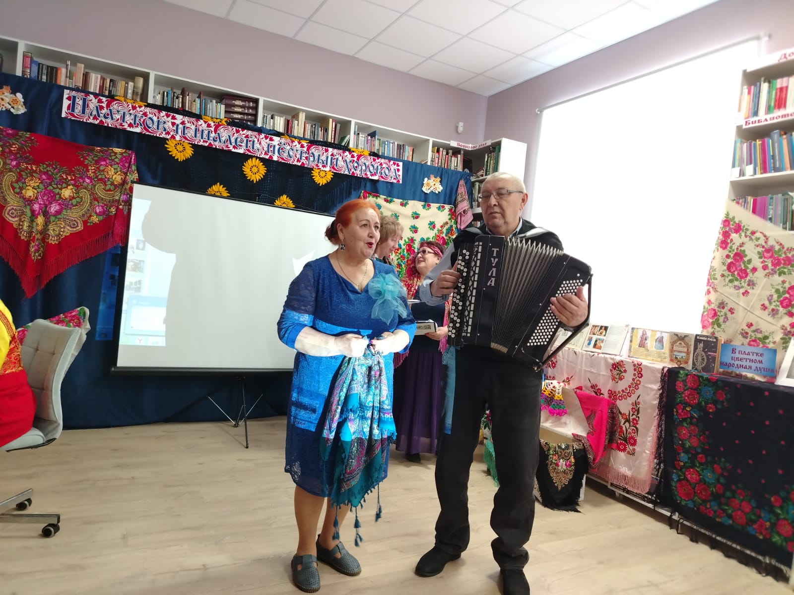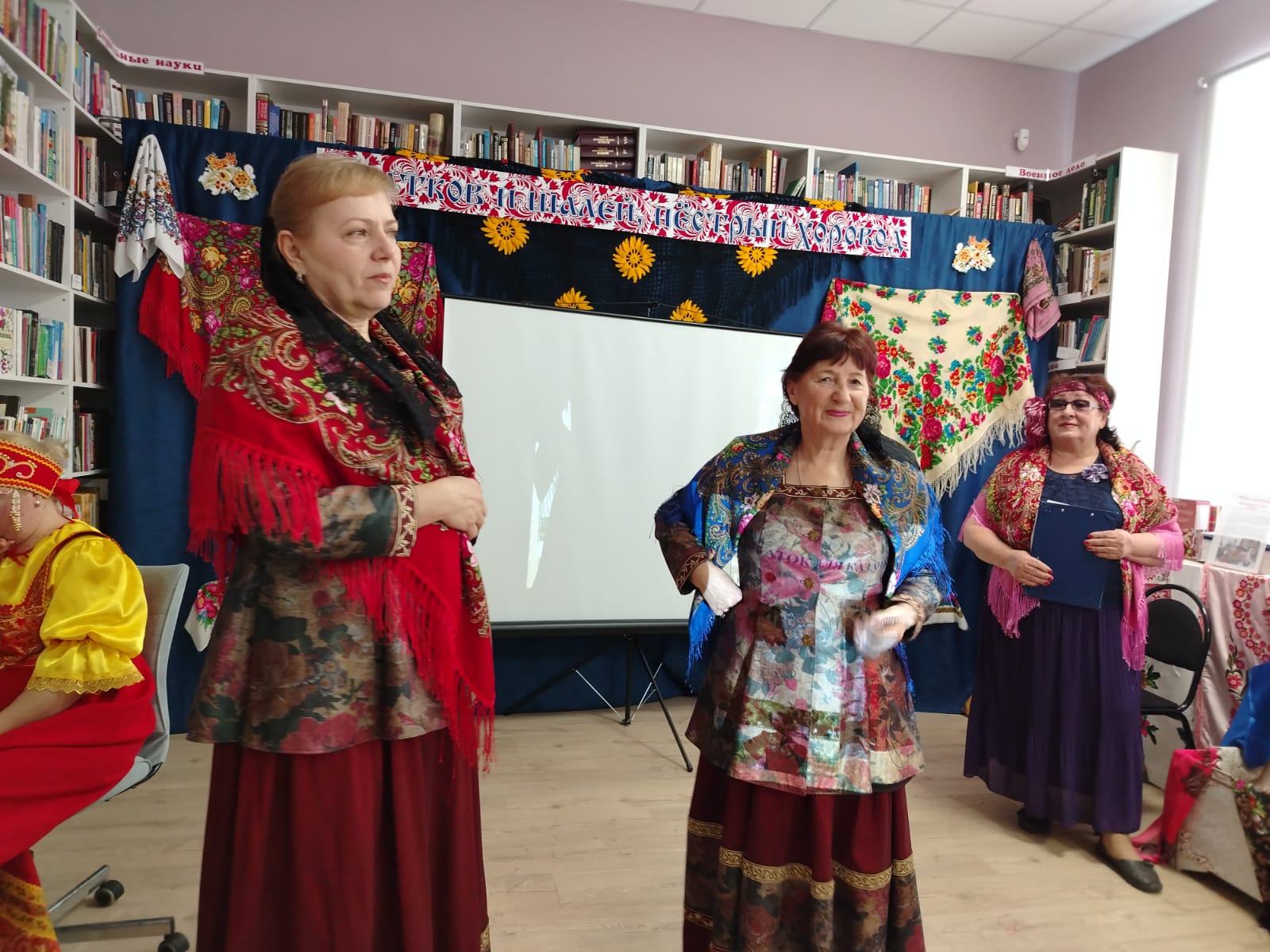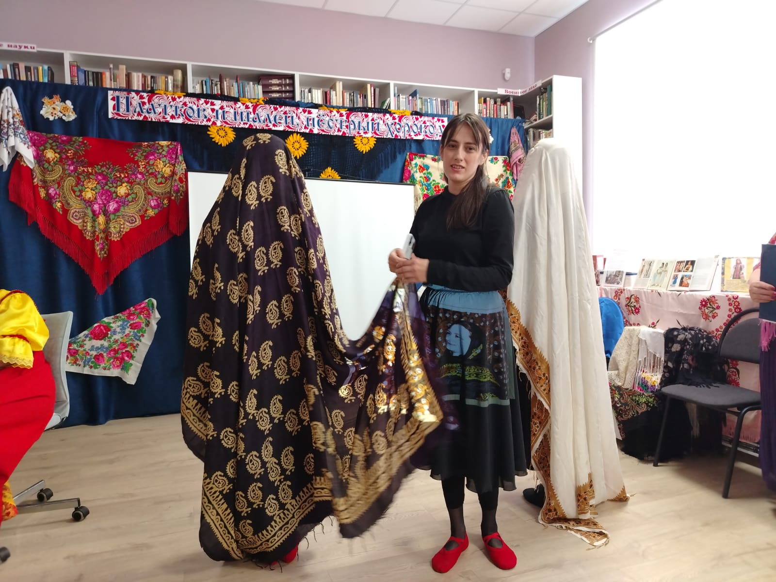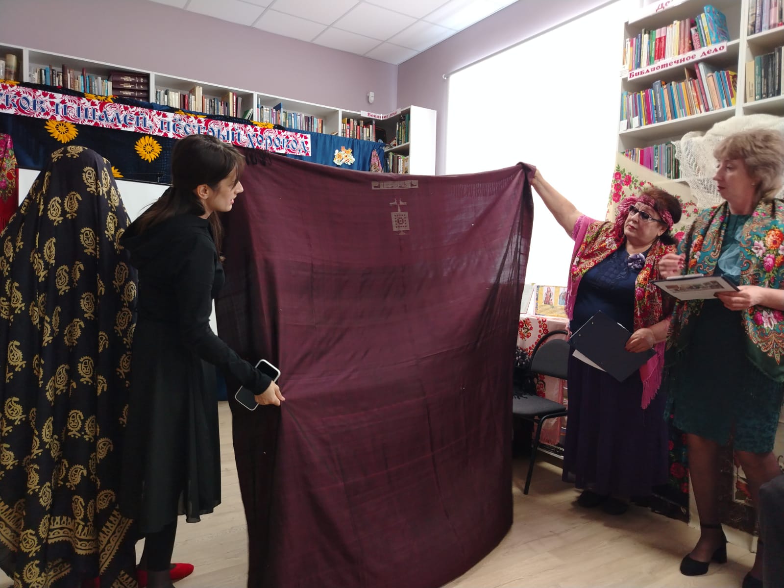 К мероприятию в библиотеке была оформлена выставка-инсталляция «В платке цветном народная душа» с красочными платками, шалями, книгами.