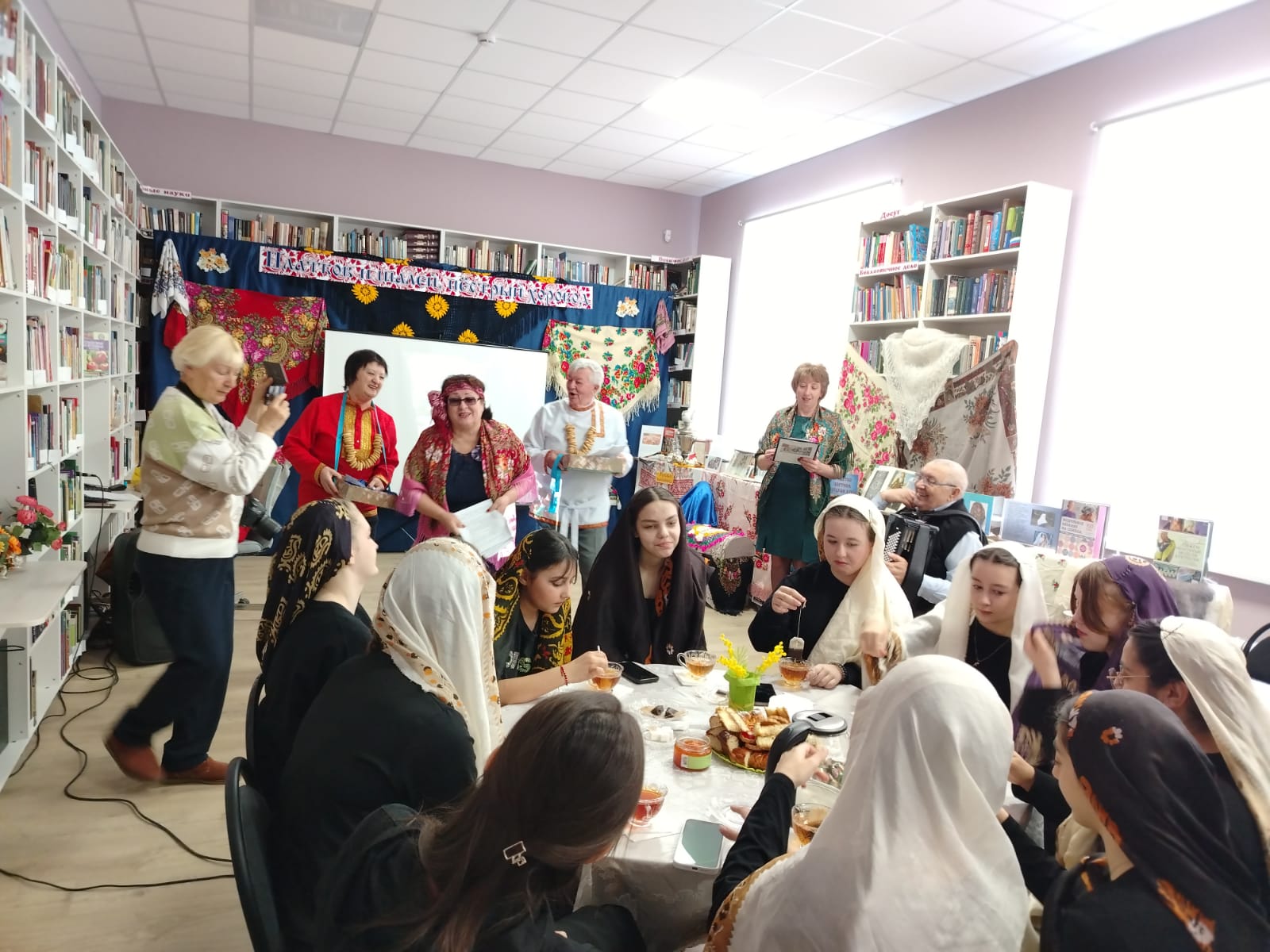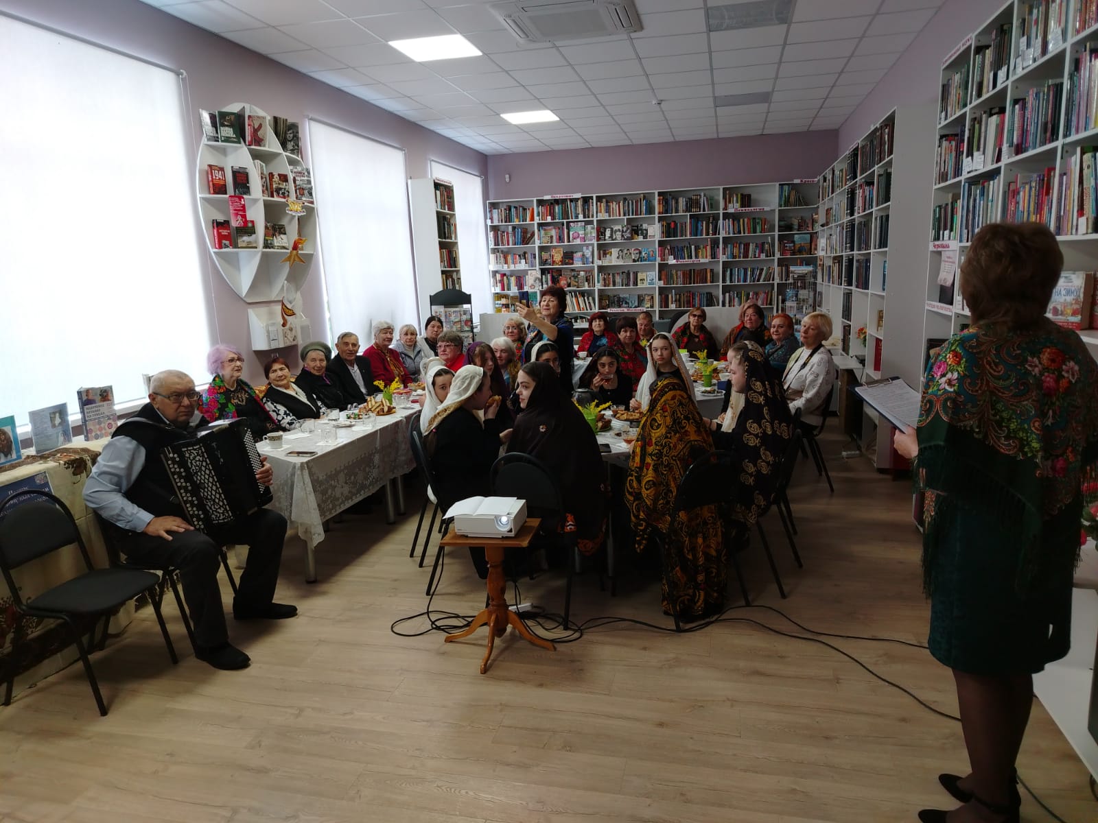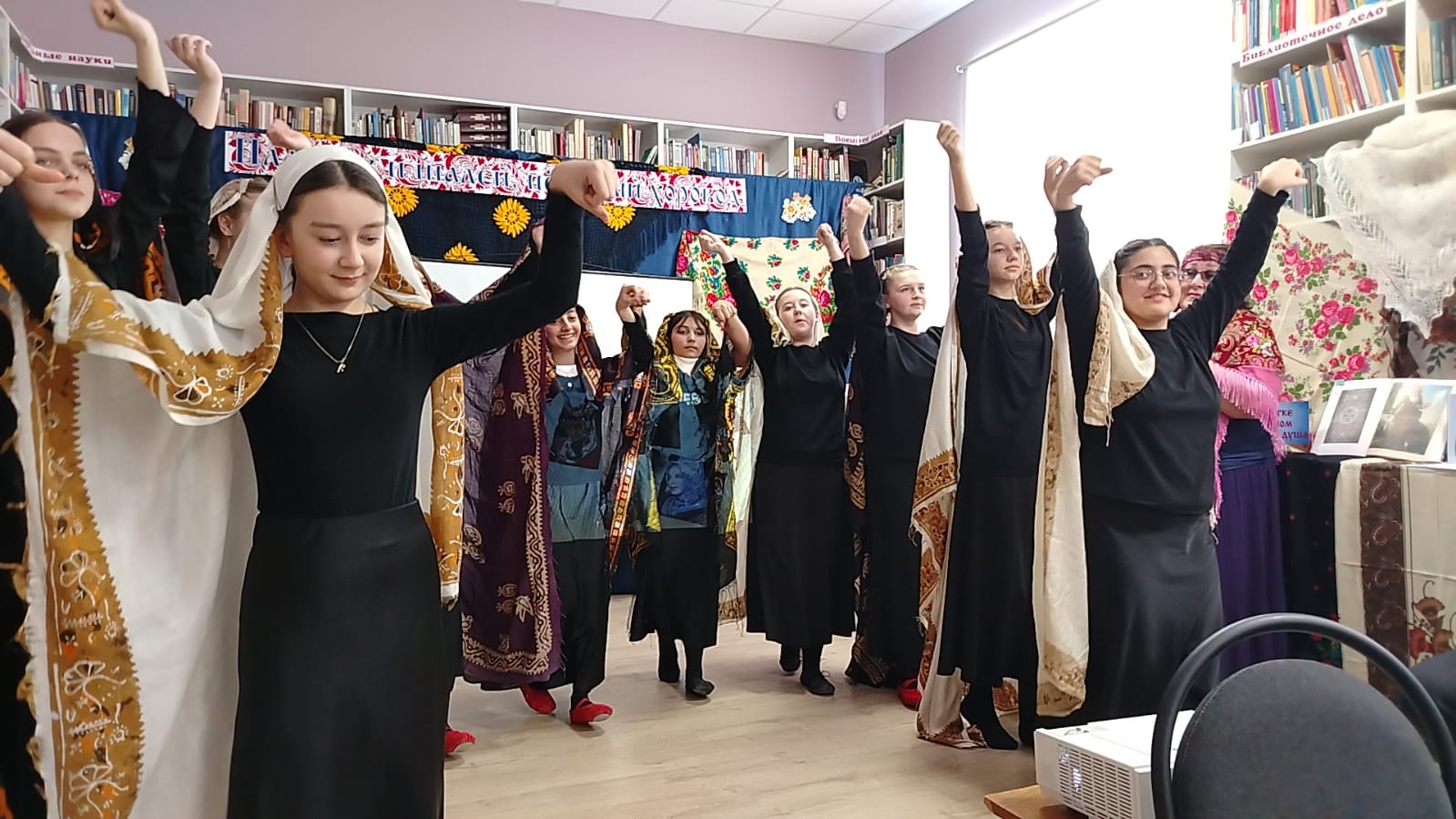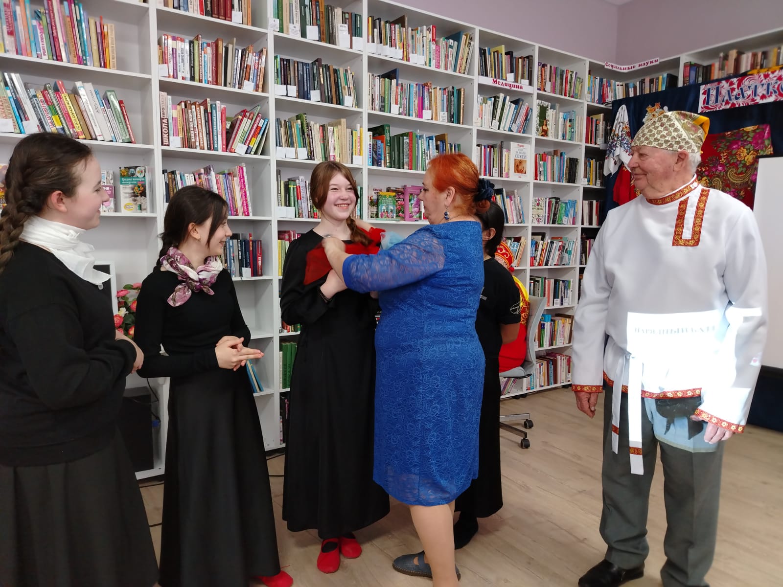 К мероприятию в библиотеке была оформлена выставка-инсталляция «В платке цветном народная душа» с красочными платками, шалями, книгами.