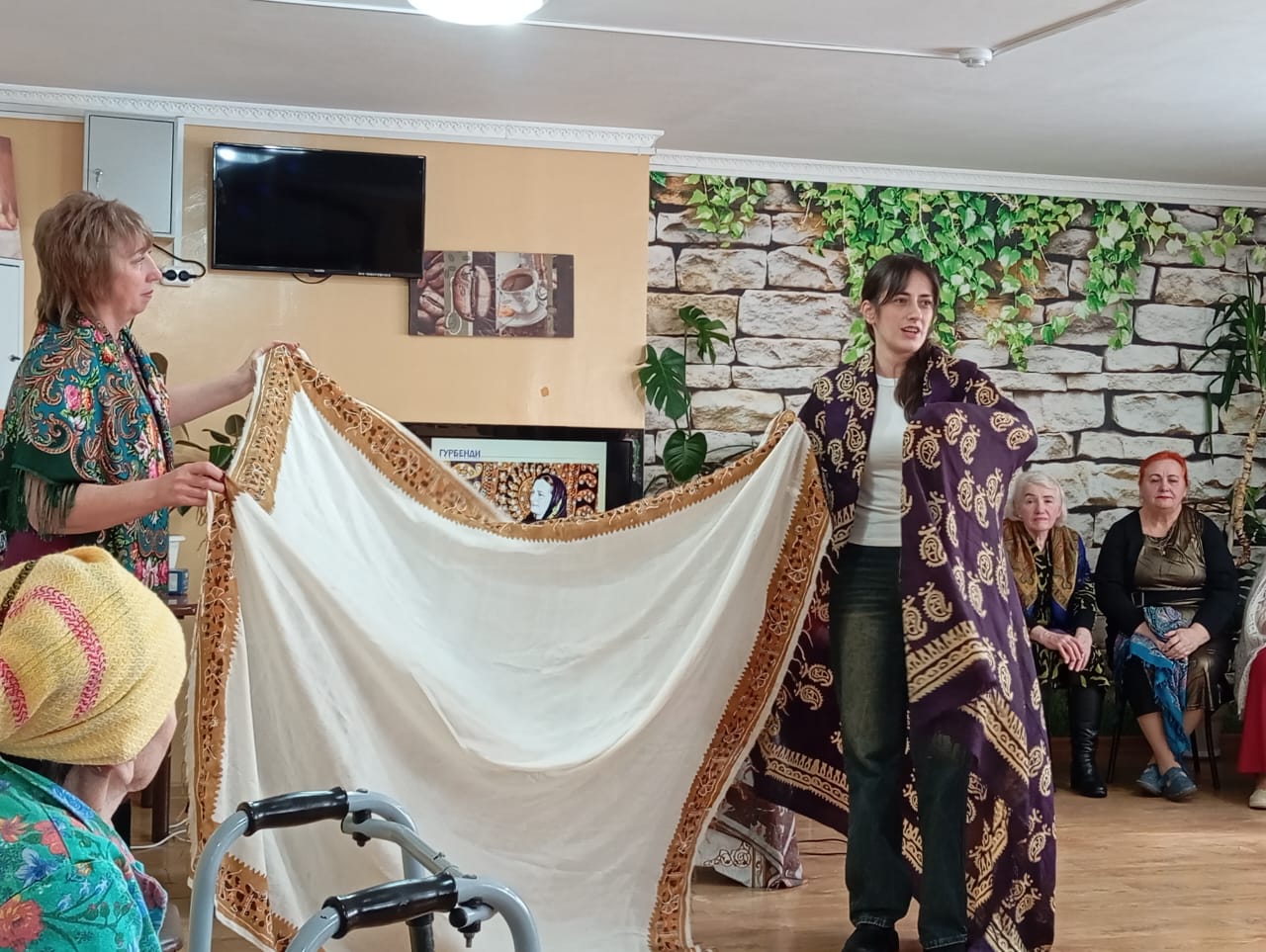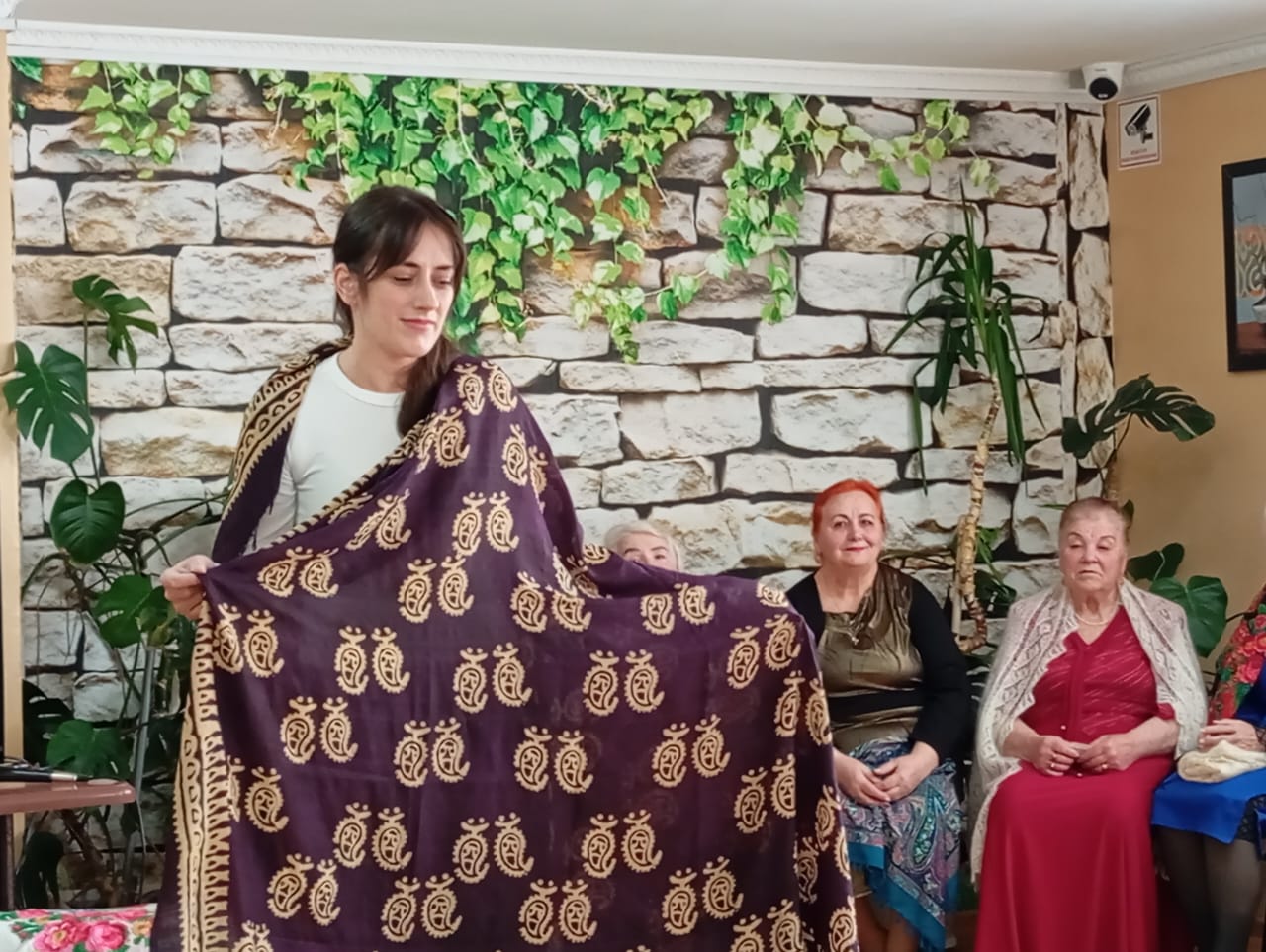 Очень понравились присутствующим рассказы о традициях и обрядах, ношения платка. О даргинском платке «гурбенди» рассказала Зухра Абдулаева, об индийском сари Светлана Фаюстова, о цыганском платке «дикло» Любовь Скрябина. Какие цветы распускаются на Павло-Посадских платках и какой смысл они несут поведали Лидия Подкопаева, Татьяна Куликова, Татьяна Олифиренко, о мировой известности этого платка гости смогли узнать из мини-сценки «Платочек из Посада» в исполнении Виктора Билько и Людмилы Немлей. А какое же имеет значение платок для казачки рассказали Татьяна Сдобнова и Лидия Шевченко.