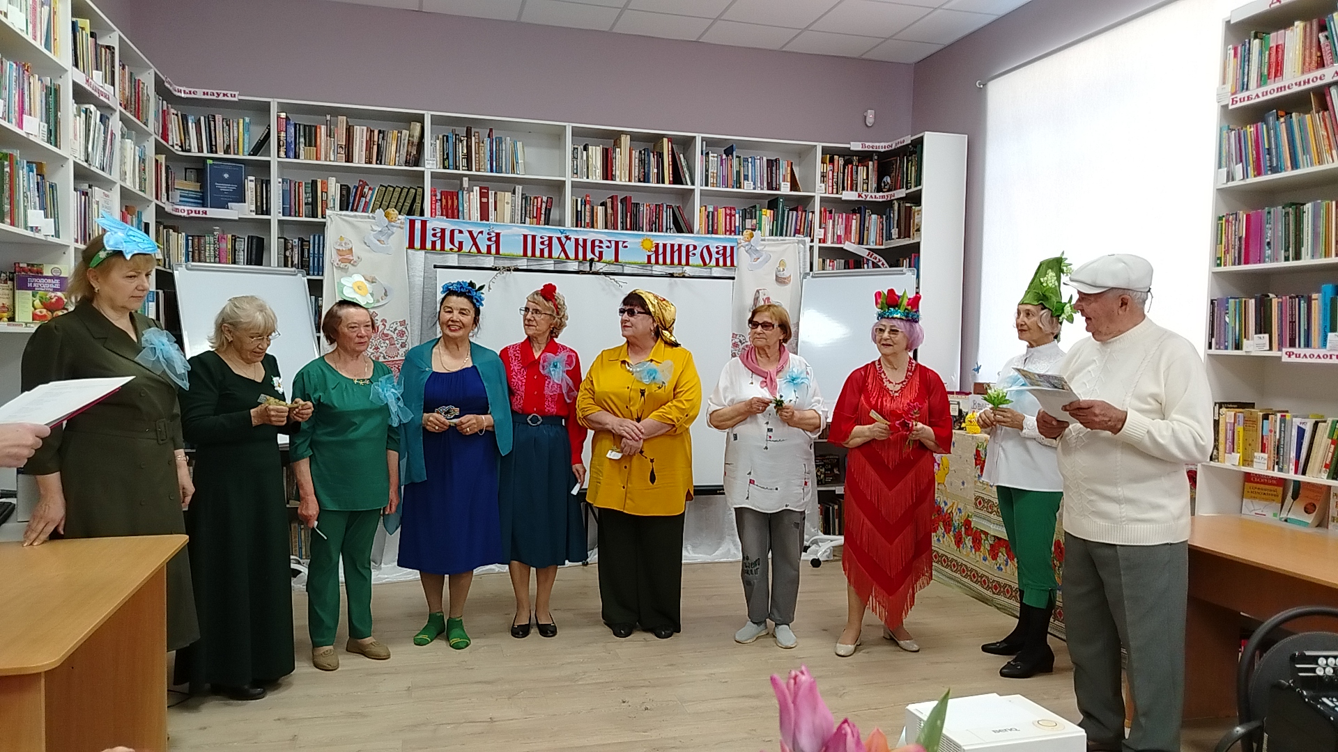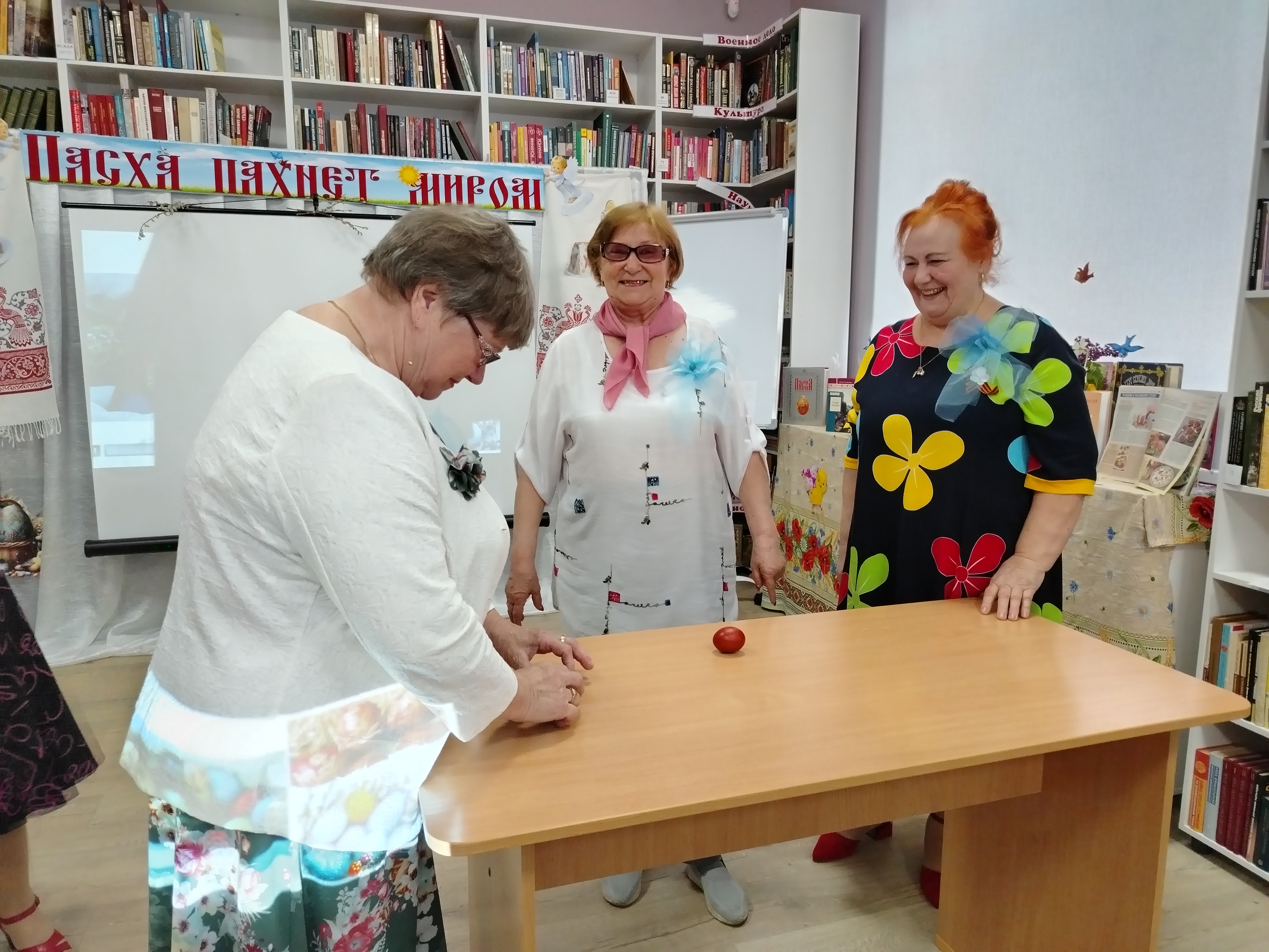 Хозяюшки поделились своими рецептами куличей и пасхальных блюд, рассказали, какие традиции соблюдаются в их семьях в пасхальные дни. Вспомнили, как отмечали этот праздник раньше, какие пели песни, какие устраивались народные гуляния, игры, хороводы. Ведущие решили не отступать от традиций и предложили им поиграть в игры, конкурсы: «Сосчитай», «Покрути яйцо», «Прокати яйцо», «Яичные игры», гости пасхальных посиделок с удовольствием и азартом приняли в них участие, а также читали стихи, посвященные светлому празднику, сыграли в сценке- экспромт «Воробей и цветы». Самые эрудированные, ловкие и внимательные участники клуба получили утешительные призы.