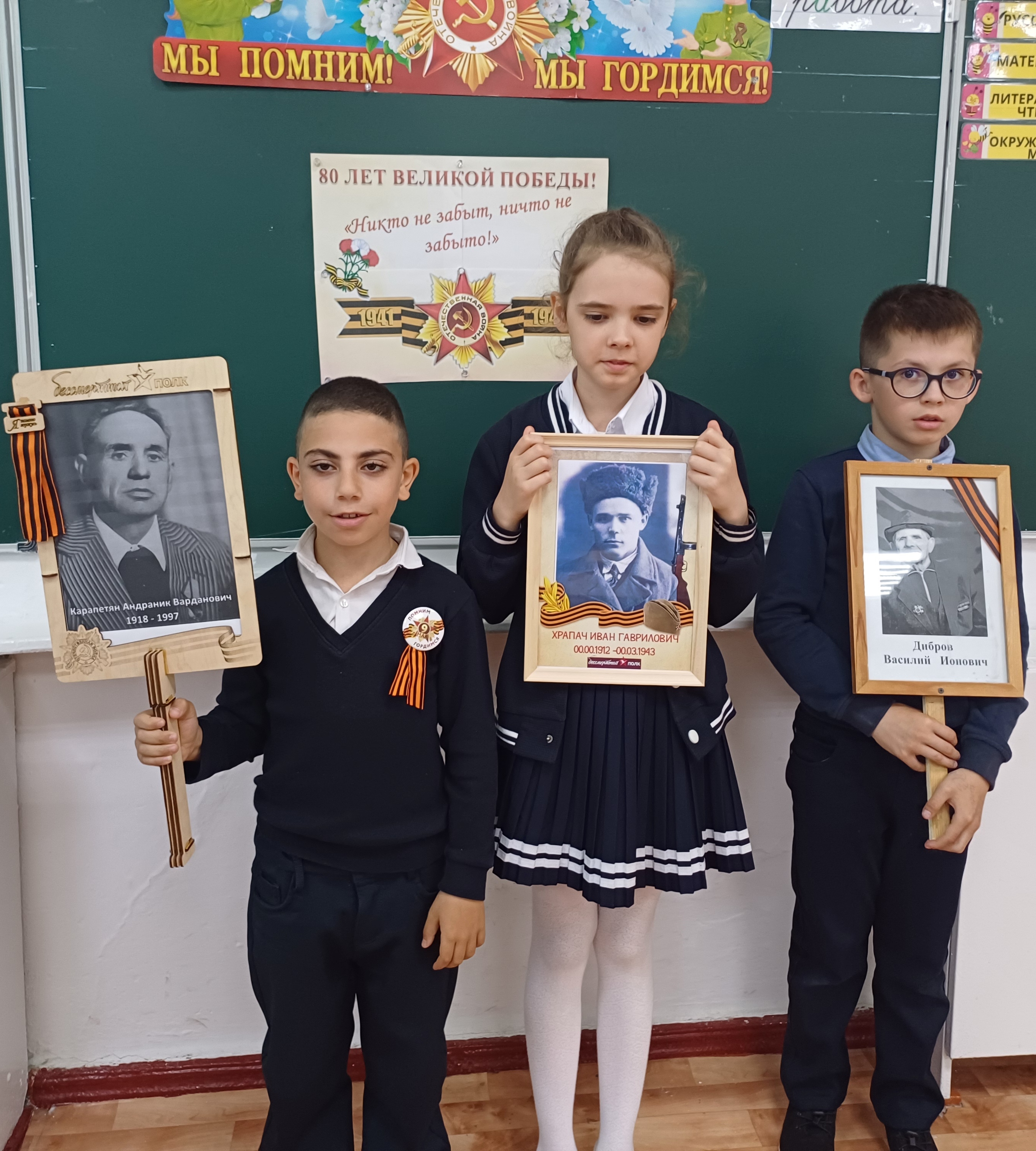 «Солдаты Великой Отечественной – наши земляки», так назывался час славы, который провели сотрудники библиотеки совместно с учащимися 3 класса (кл. руководитель Вакуленко С.И.). После вступительной части, дети рассказывали семейные истории о героях войны. Многие пришли на встречу с их портретами. Готовясь к мероприятию, дети подготовили стенд «Герои моей семьи». Затем ведущие рассказали о героях вознесеновцах, именами которых названы улицы нашего села, а так же о важном значении народного шествия «Бессмертный полк».