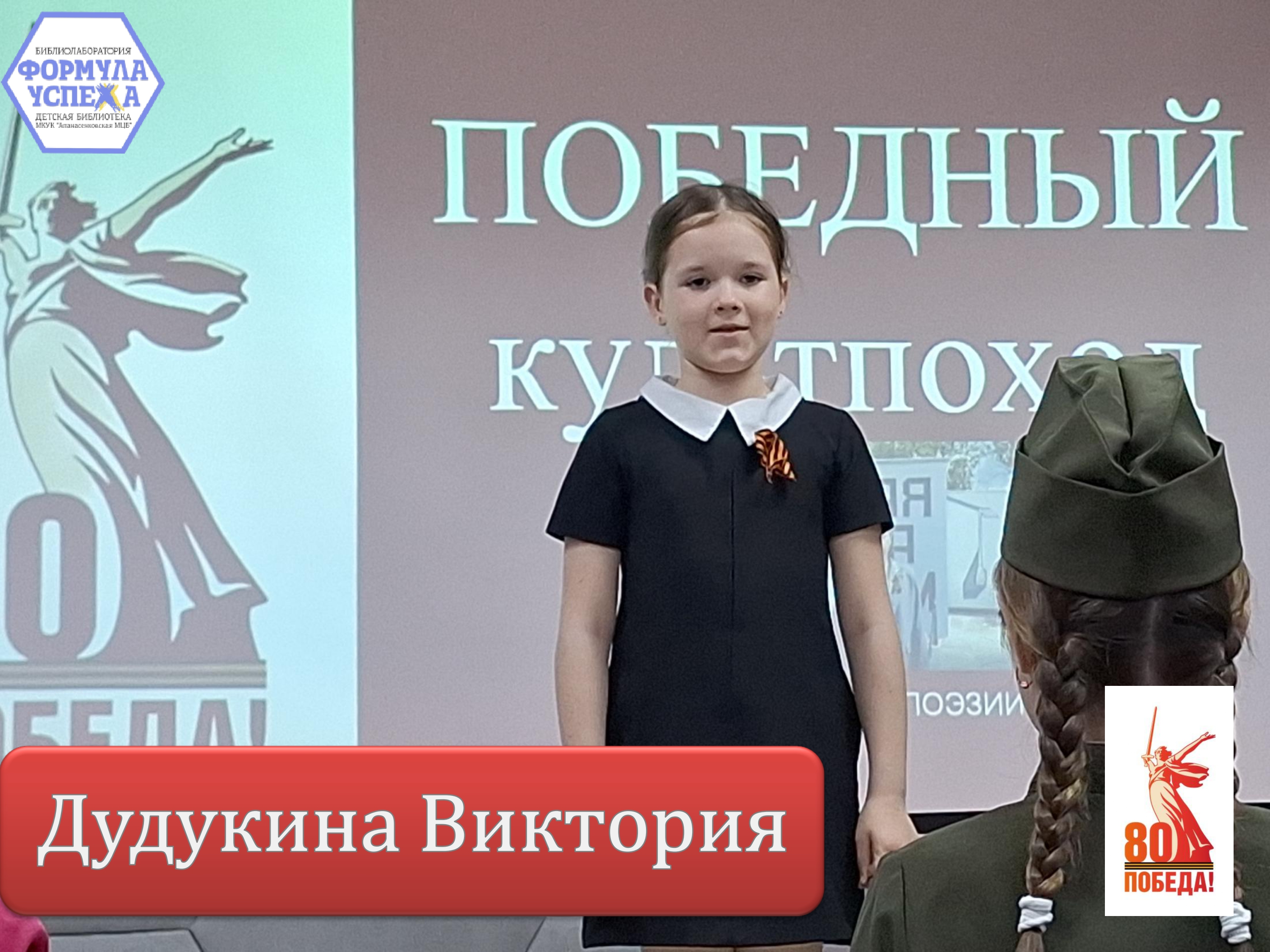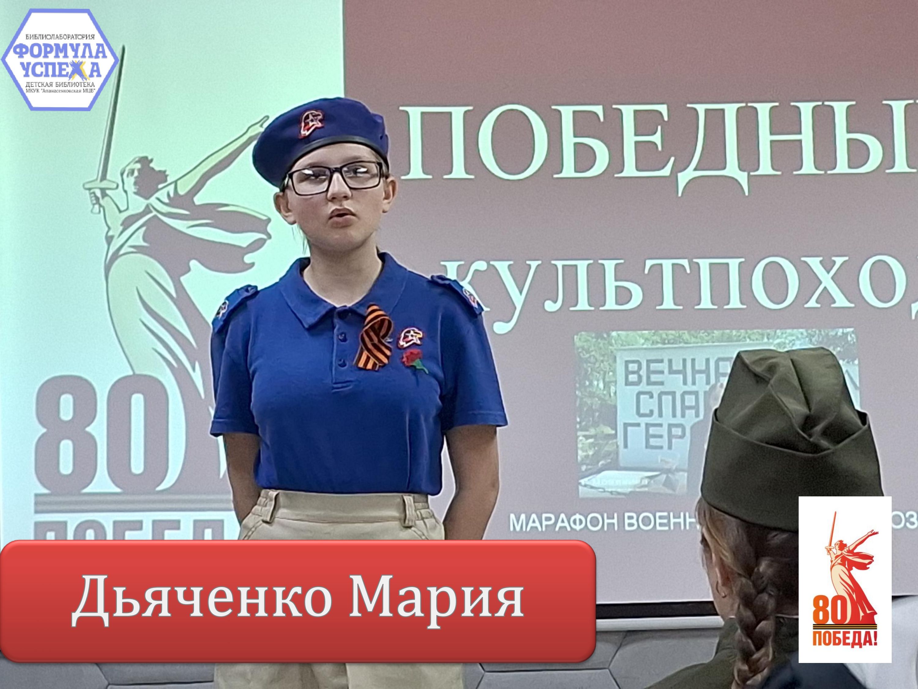 1 место. Дьяченко Мария (МКОУ СОШ №3, 7 «Б» класс)  стихотворение «В июне грянула война» О. Забусов.