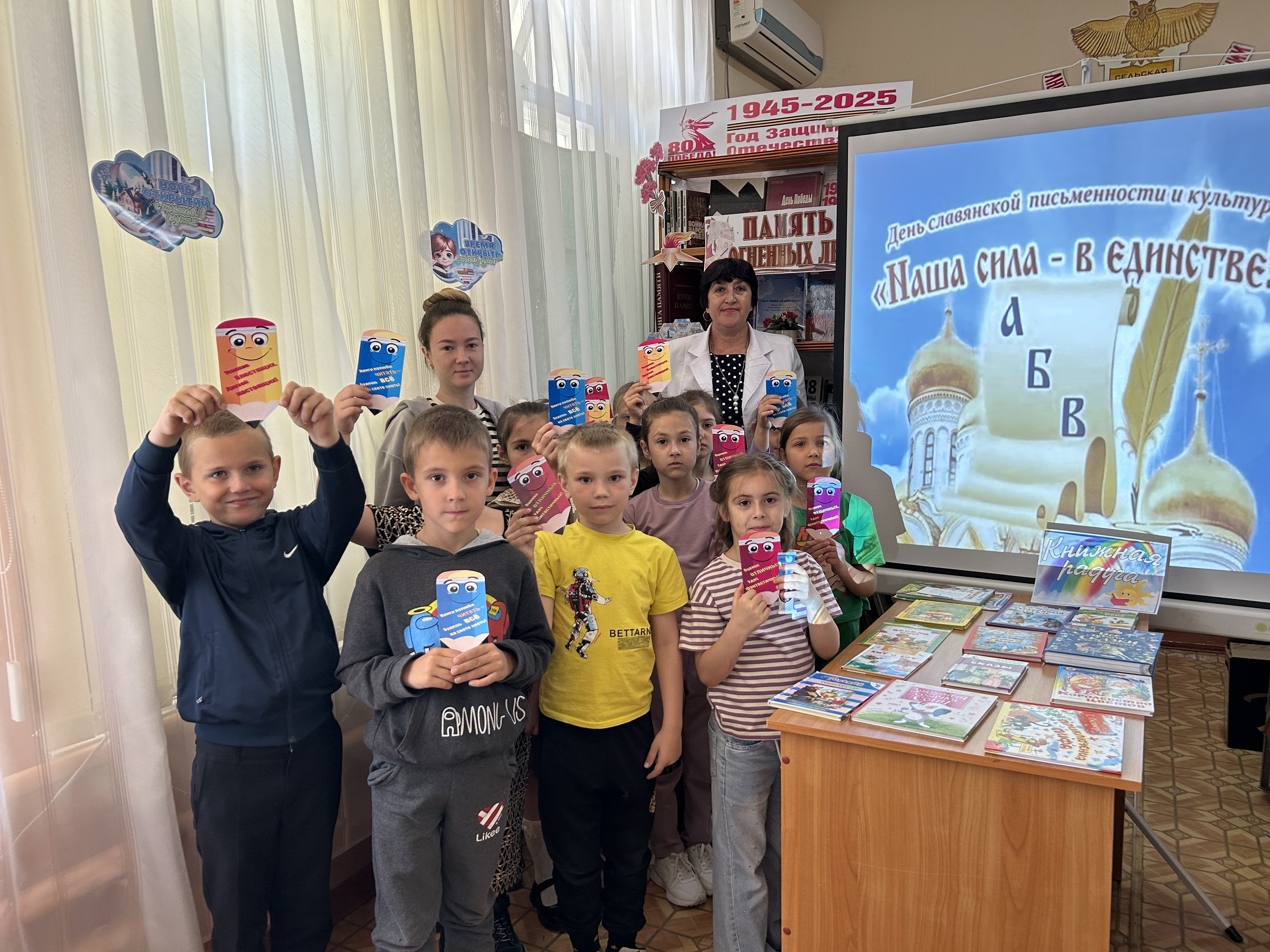 Ежегодно 24 мая отмечают День славянской письменности и культуры и торжественно прославляют создателей славянского алфавита святых Кирилла и Мефодия. День славянской письменности и культуры – это единственный в нашей стране церковно - государственный праздник. Необычное путешествие «Азбука не бука, а забава и наука» совершили учащиеся 1 класса МБОУСОШ №8 ,посетив Манычскую сельскую библиотеку. Путешествие началось с экскурсии в библиотеку , в историю, во время которого школьники узнали, откуда появилась письменность, и какие способы письма существовали в мире. Ребята проследили историю возникновения и развития письменности и книги. Далее дети познакомились с различными алфавитами и с их особенностями, с историей возникновения русского алфавита и с его создателями, славянскими просветителями братьями Кириллом и Мефодием. Святые братья не только дали славянскому народу азбуку, а заложили фундамент литературы, письменности и культуры в целом. В ходе путешествия ожили старинные буквы: Аз, буки, веди, добро, глаголь. Ребята называли слова, которые начинаются с этих букв, отгадывали загадки, принимали участие в игре «Собери пословицу». В завершение мероприятия дети получили в подарок замечательную закладку для книг, сделанную библиотекарем.