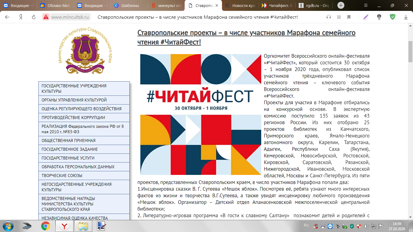 Детский отдел МКУК «Апанасенковская МЦБ» подготовил видео проект по творчеству В.Г. Сутеева, успешно прошедший все отборочные этапы, и 30 октября в 11.00 открывает этот марафон!