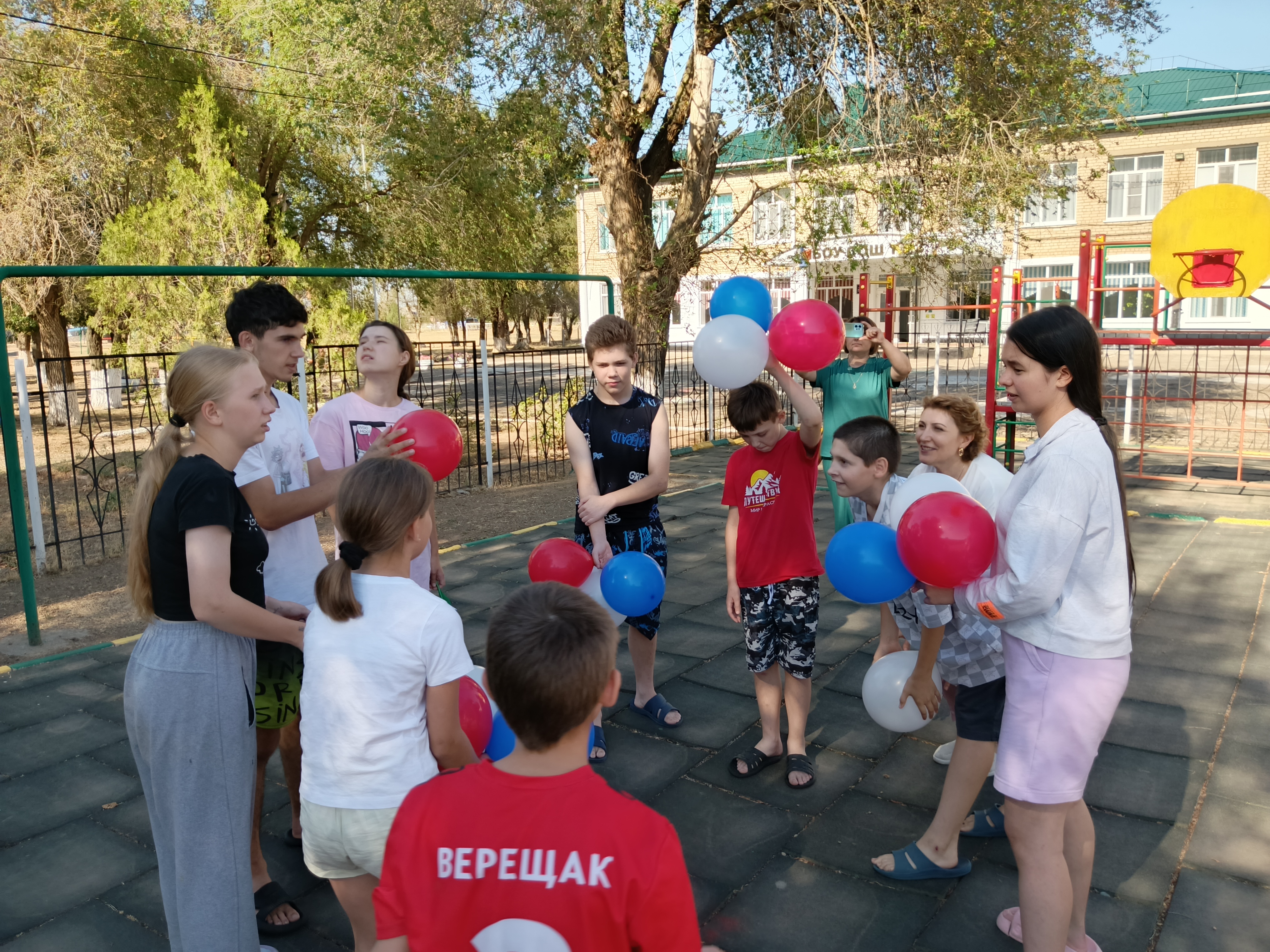 В конце мероприятия, встреча была запечатлена на общем фото. Ребята поблагодарили гостей за визит. И в честь праздника по традиции во дворе были запущены шары в цветах Российского флага.