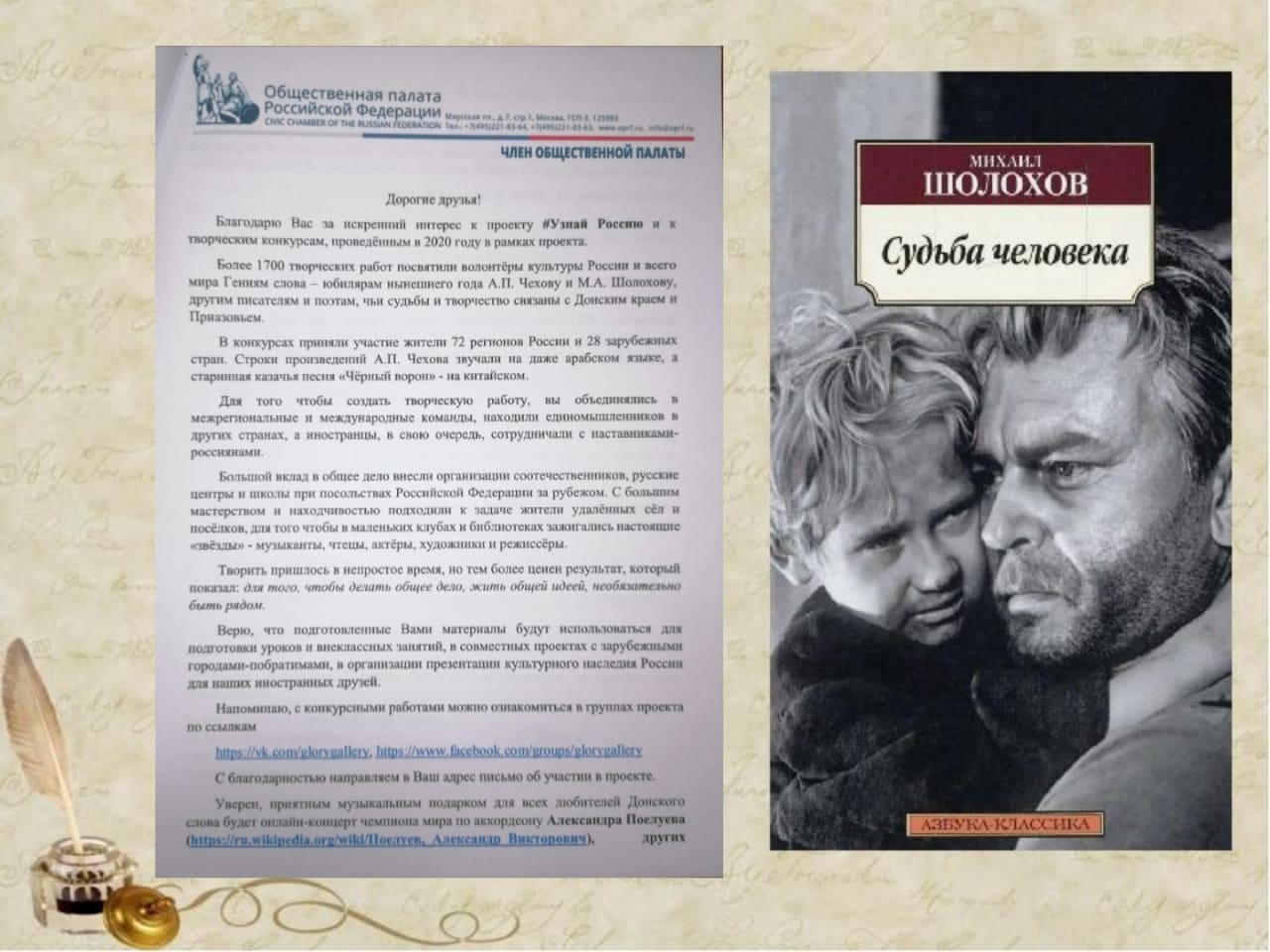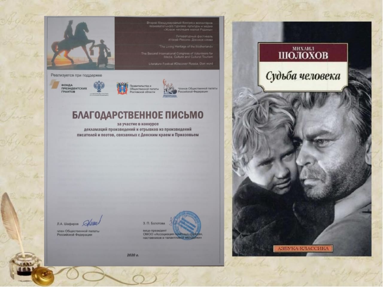 участие в конкурсе декламаций произведений и отрывков из произведений писателей и поэтов, связанных с Донским краем и Приазовьем. Не смотря на то, что итоги конкурса будут объявлены 15 и 16 января 2021 года, наши сотрудники были награждены Благодарственным письмом за участие в конкурсе.