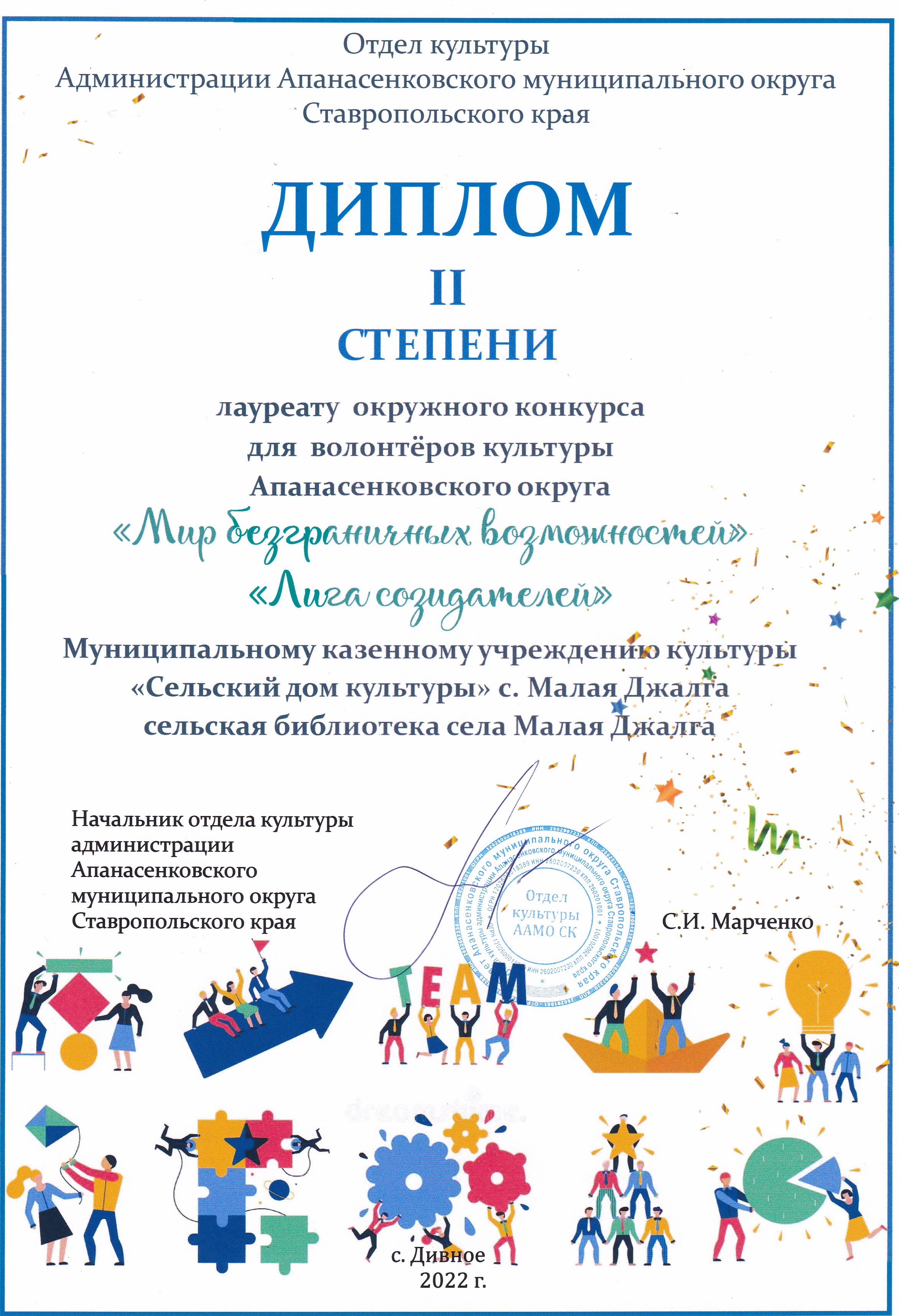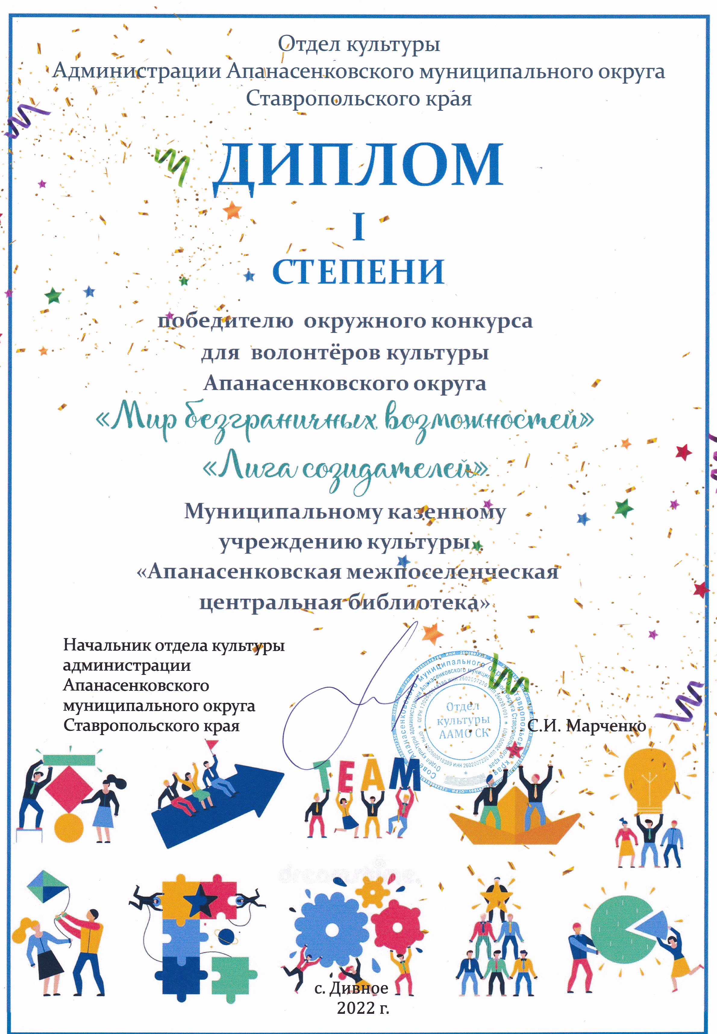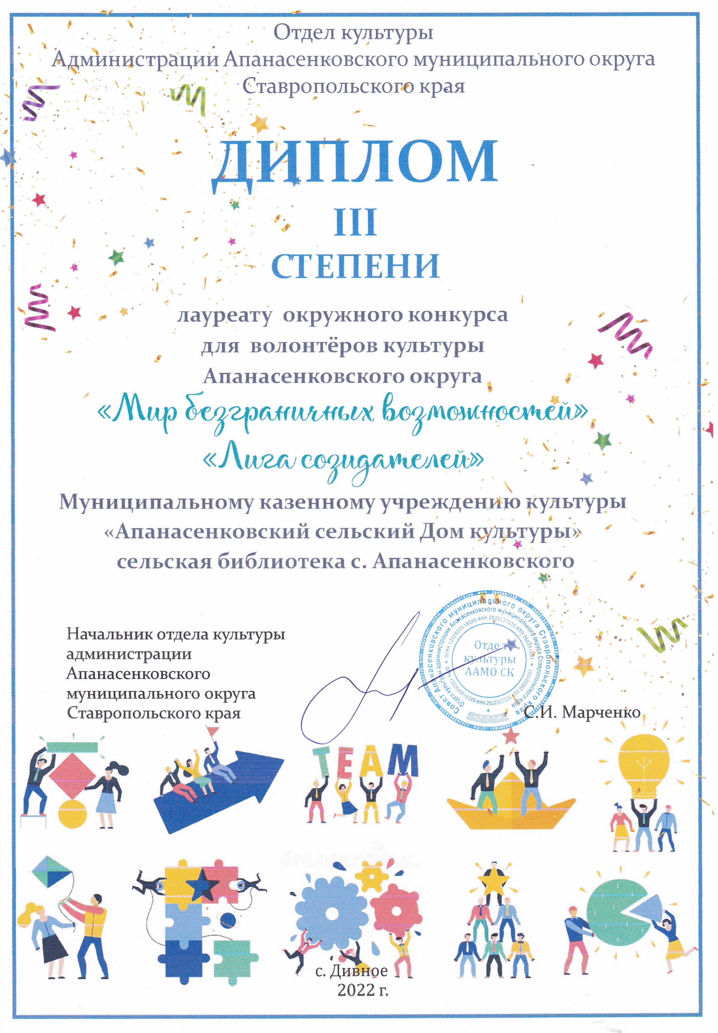 30 ноября были подведены итоги третьего окружного конкурса для волонтёров культуры Апанасенковского округа «Мир безграничных возможностей», тема 2022 года «Лига созидателей». На конкурс было представлено 11 конкурсных работ библиотек Апанасенковского муниципального округа. Оценивались концепции разноплановых мастер-классов от волонтеров культуры планируемых к реализации в 2023 году, библиотеки выступят организаторами и площадками проведения мастер-классов.