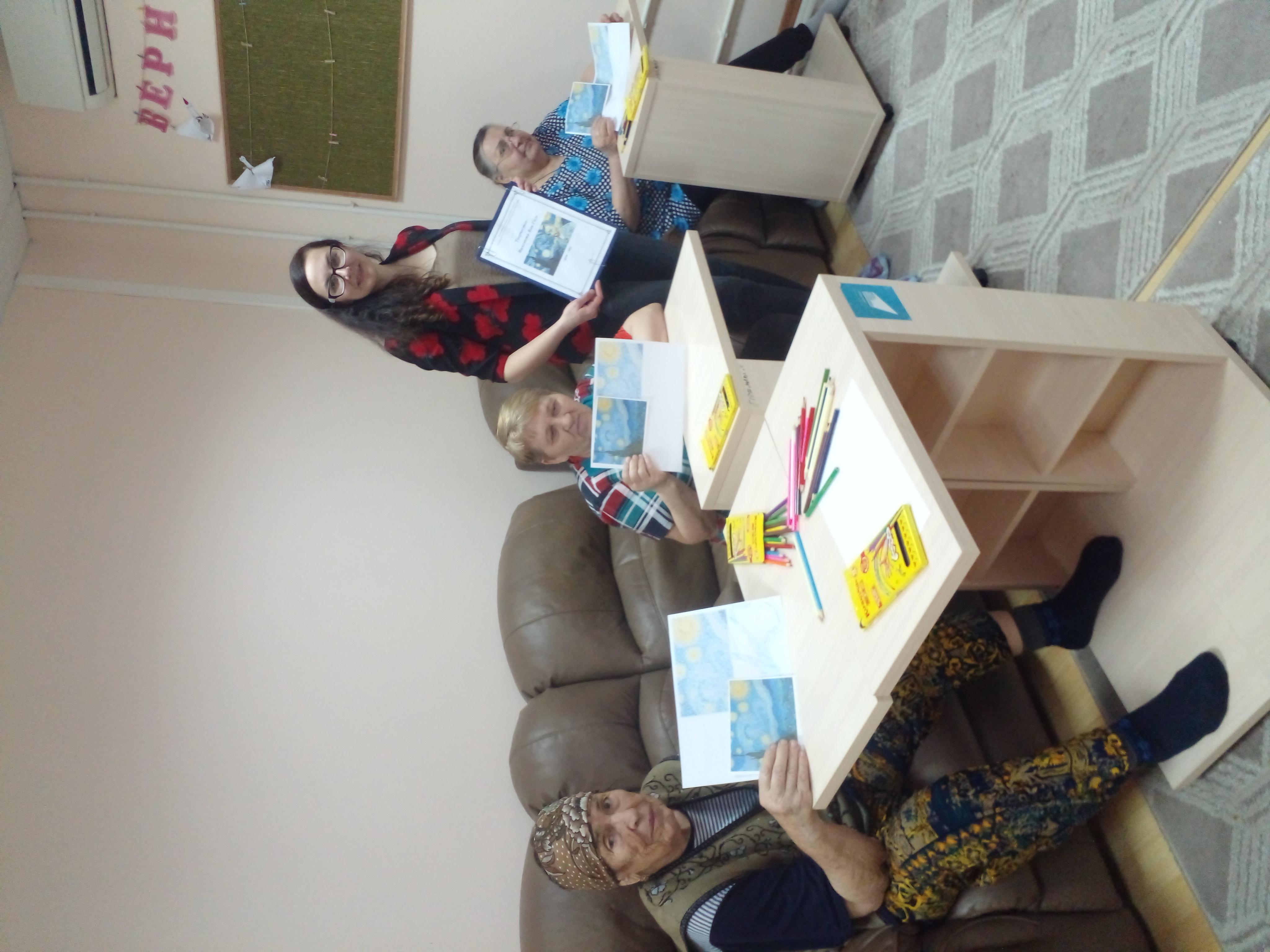 Познакомившись с жизнью и творчеством всемирно известного художника Винсента Ван Гога, присутствующие смогли почувствовать себя в роли художника и создать своё произведение. На подготовленных рисунках, полных узнаваемых вангоговских элементов (небо в спиралях рыжих звёзд, ирисы), участники встречи дополняли рисунки в стилистических особенностях художника, проявив собственную фантазию.