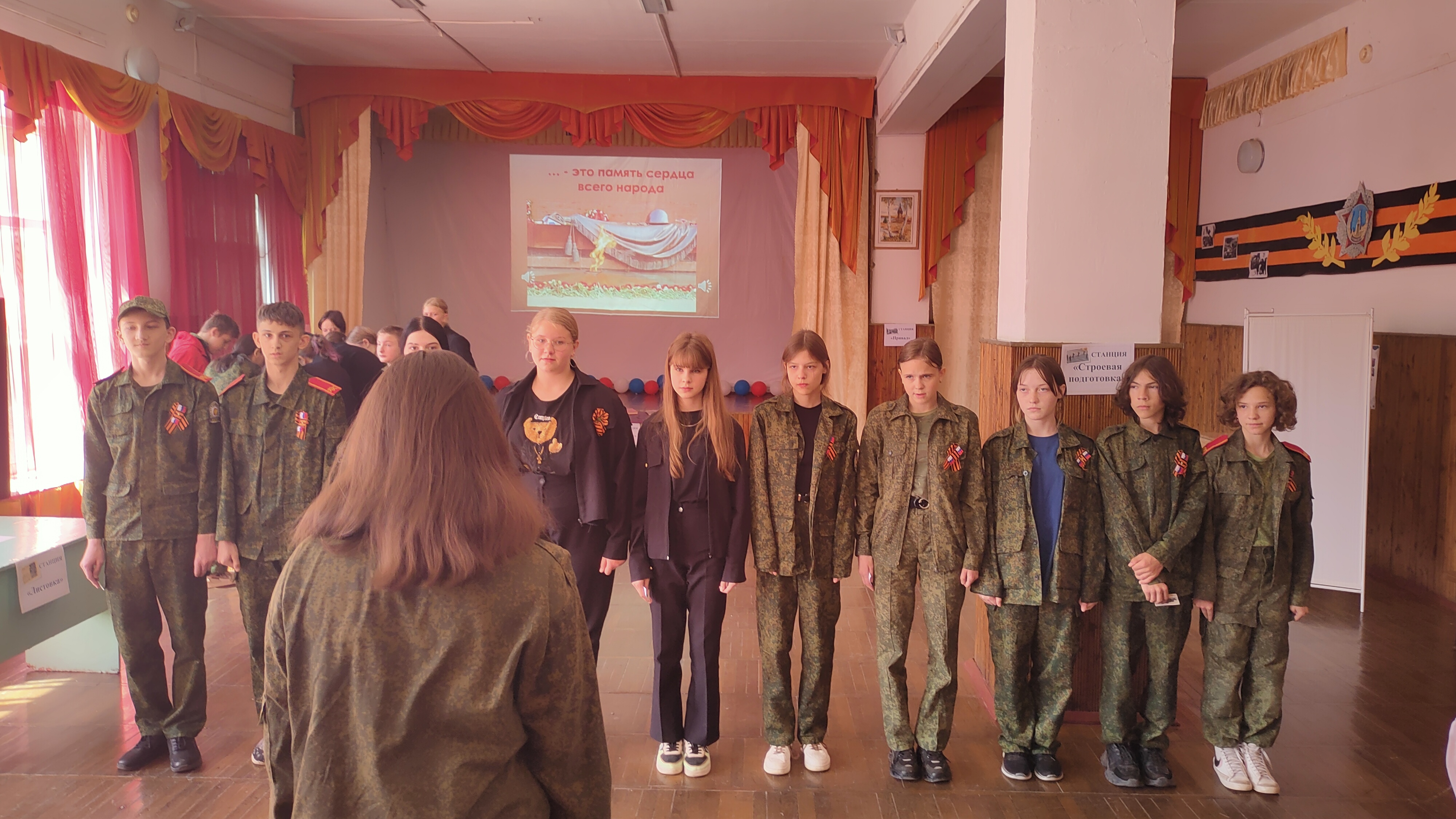 Под предводительством командиров отрядов соревновались две команды, перед ними стояла непростая задача - понять и осознать ситуацию, предлагаемую организаторами на каждой станции, вспомнив исторические факты, выполнить задания, предлагаемые на игровых локациях: «Строевая подготовка», «Союзники», «Техника ВОВ», «Листовка», «Города-герои», «Смекалка». Ребята с легкостью ответили на каверзные вопросы станции «Этих дней не смолкнет слава». «Полевая почта» – задание, на котором участники узнали о военных письмах – треугольниках, и сами написали, и сложили такие письма. На этапе «Солдатская» команды снаряжали солдата времён Великой Отечественной войны, а на станции «Медсанбат» участники оказали первую помощь раненным. Заключительным этапом для команд стала игровая локация «Привал», где участники отгадывали песни военных лет.