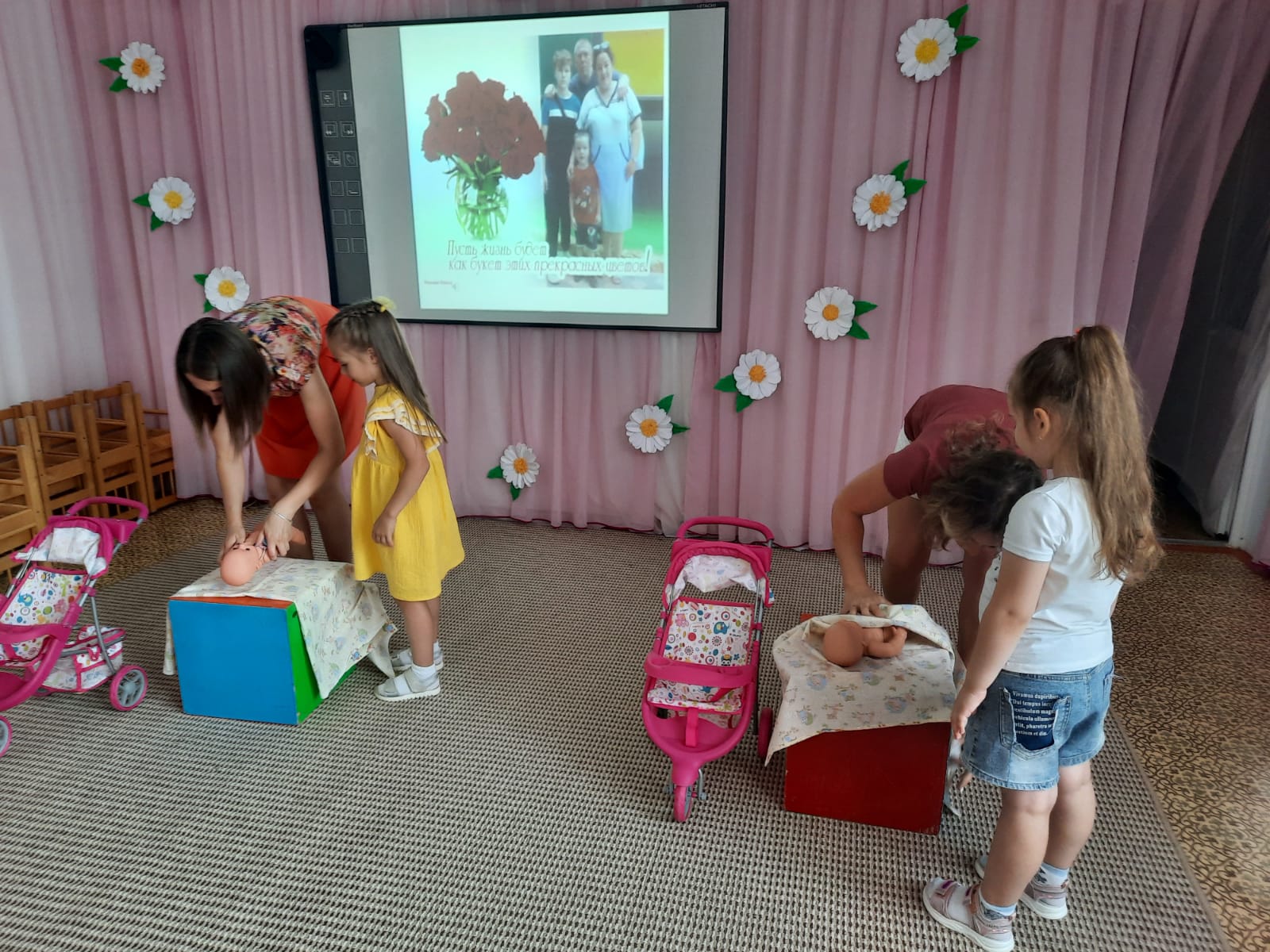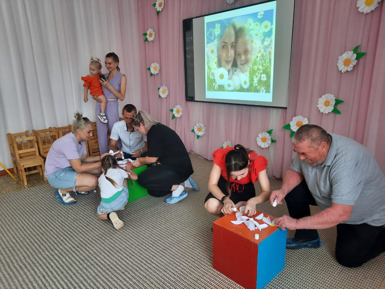 Ведущая познакомила присутствующих с историей возникновения праздника, поведав о любви князя Петра и простолюдинки Февронии (дочери пчеловода) – хранителях семьи и брака. Рассказала о том, что ромашка является символом этого праздника. Веселые игры и конкурсы для взрослых и детей создали всем радостное настроение. Участники встречи отвечали на вопросы о семье и семейных ценностях, составляли пословицы из слогов, разгадывали загадки, собирали ромашки из лепестков.