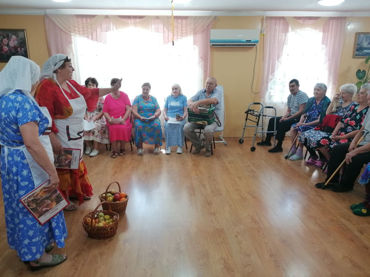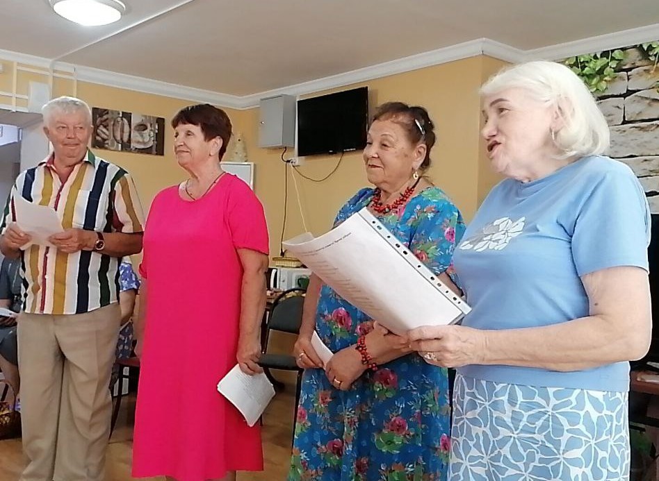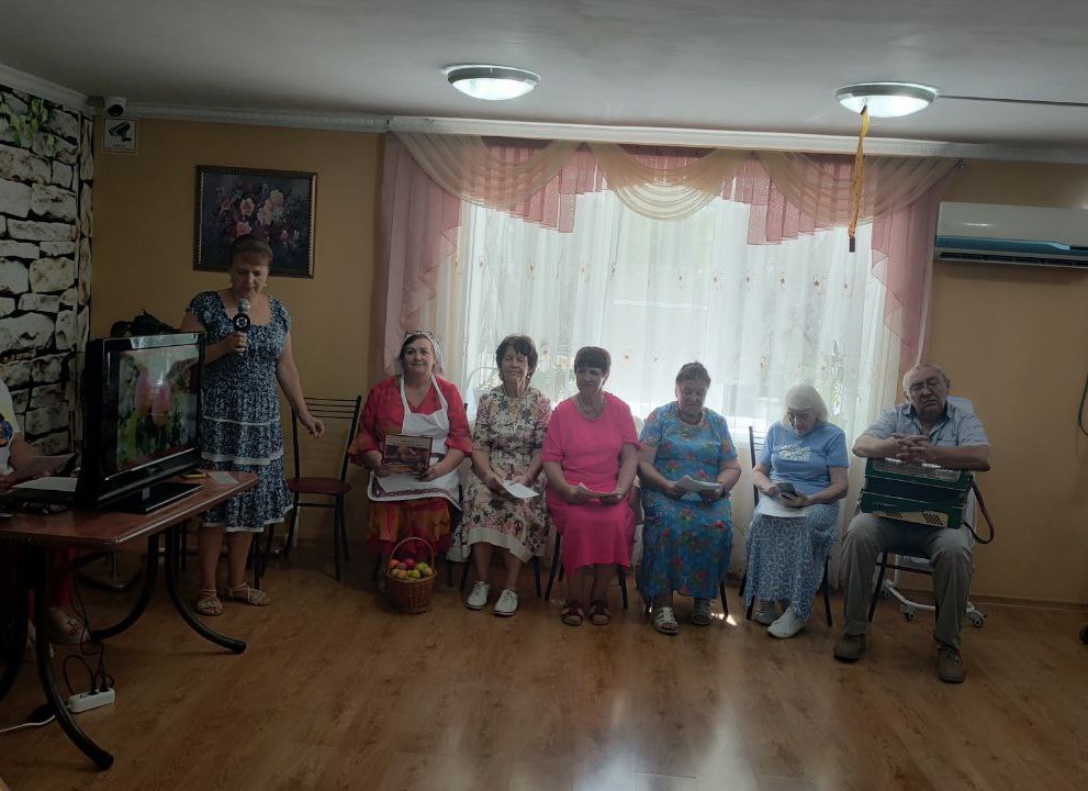 Присутствующие узнали, что означает слово «Спас», почему так названы праздники, какие существуют народные традиции и приметы. Поздравили всех присутствующих с Яблочным Спасом и рассказали какие сорта яблок бывают и какими витаминами они богаты. Яблокам посвящены стихи, частушки, которые звучали из уст участников клуба: Валентины Лизогубовой, Виктора Билько, Марии Шалайко, Татьяны Куликовой, Любови Скрябиной в музыкальном сопровождении Николая Беловицкого. Все вместе пели весёлые, лирические песни, известные и любимые всем «Яблони в цвету», «Лучше не ту того цвету», песня «Яблочко садовое» прозвучала в исполнении Татьяны Сдобновой.