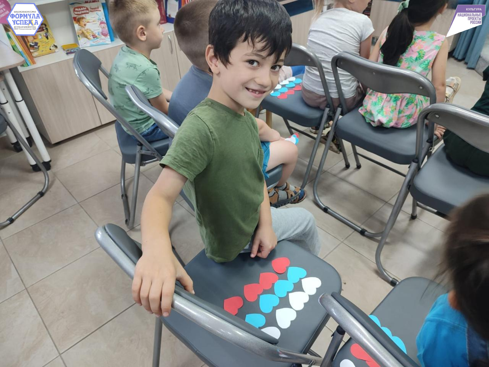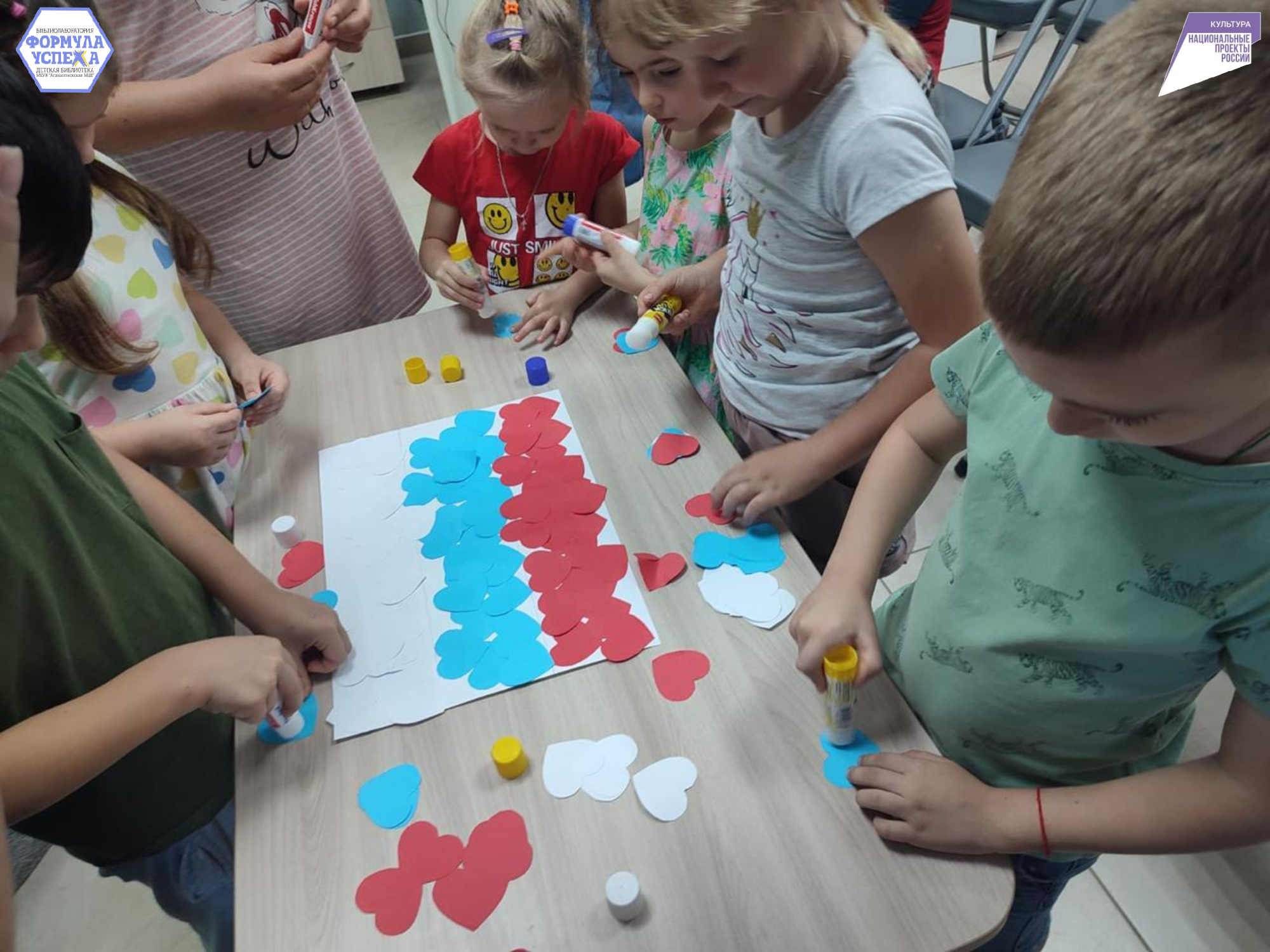 После чего, ребята собрали заработанные сердечки и дружно клеили на большой лист бумаги, так у них получился флаг России.