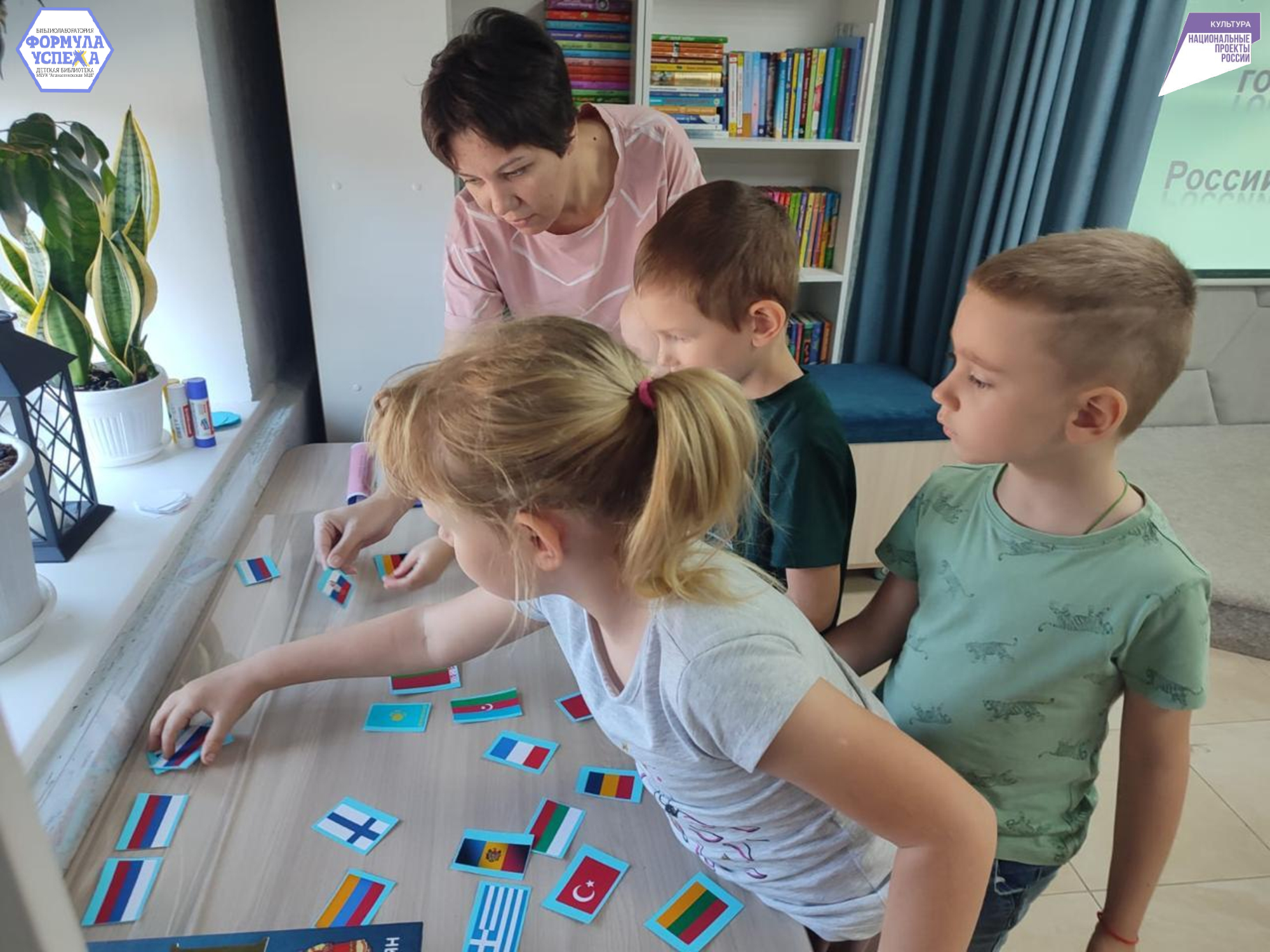 Следующее мероприятие Детской библиотеки посетили ребята из детского сада «Малыш». Мальчишки и девчонки попали на мини-квиз. Перед ними стояла задача освободить цвета русского флага, потому что злой и непослушный Бармалей украл. Чтобы пройти испытания нужно было отгадать загадки за это дети получали сердечки, а в конце станции выполнить задание, например, среди множества разных флагов найти наш триколор или правильно сложить детали разрезанной картинки.