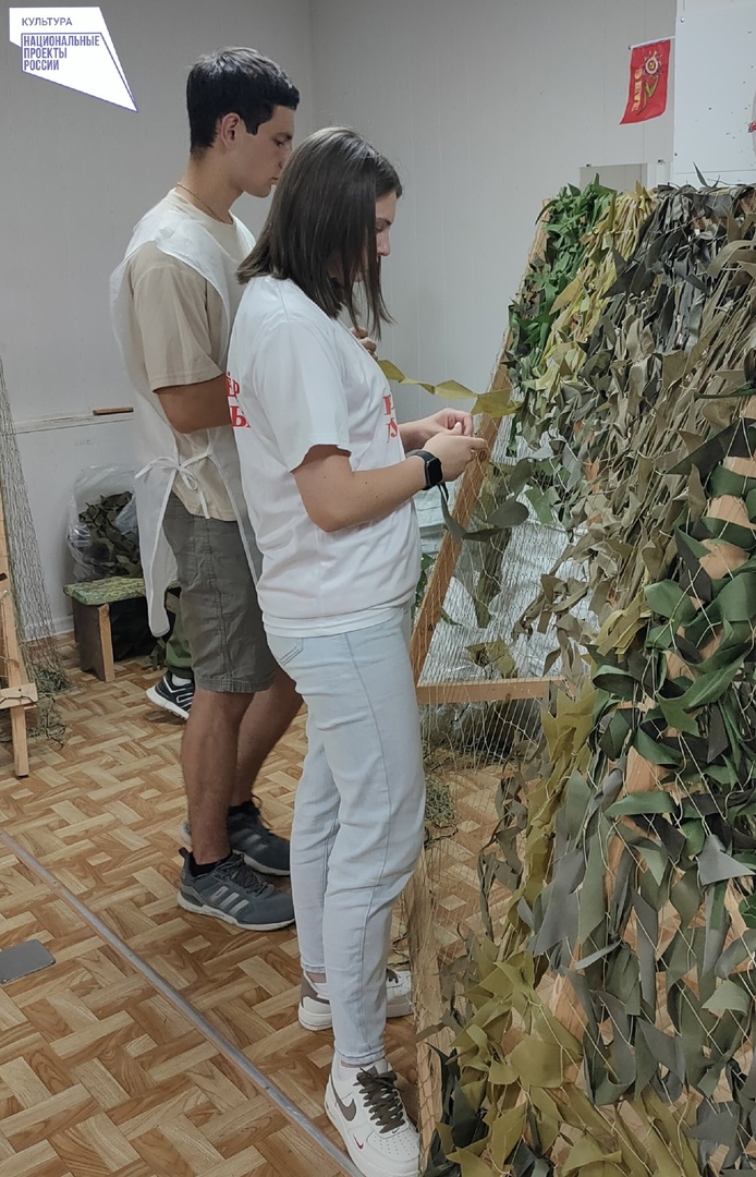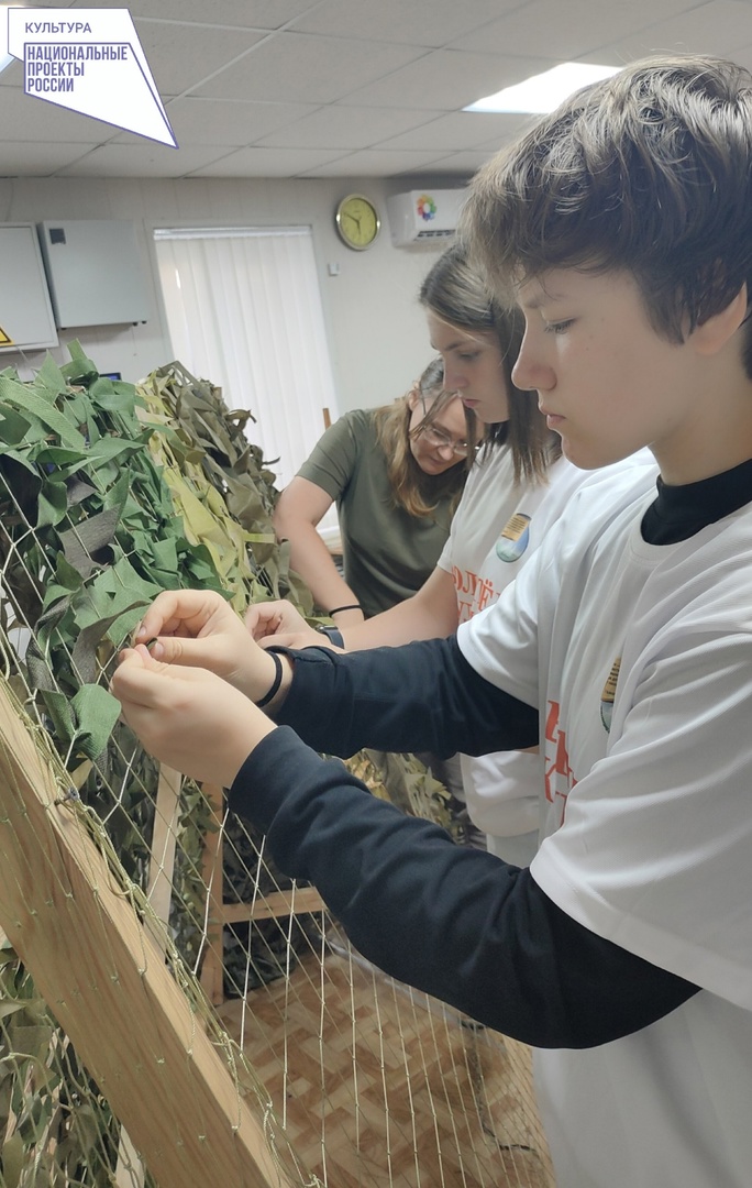 В период летних каникул разделившись на группы ребята помогают старшим товарищам в изготовлении маскировочных сетей, которые затем передаются в зону СВО.