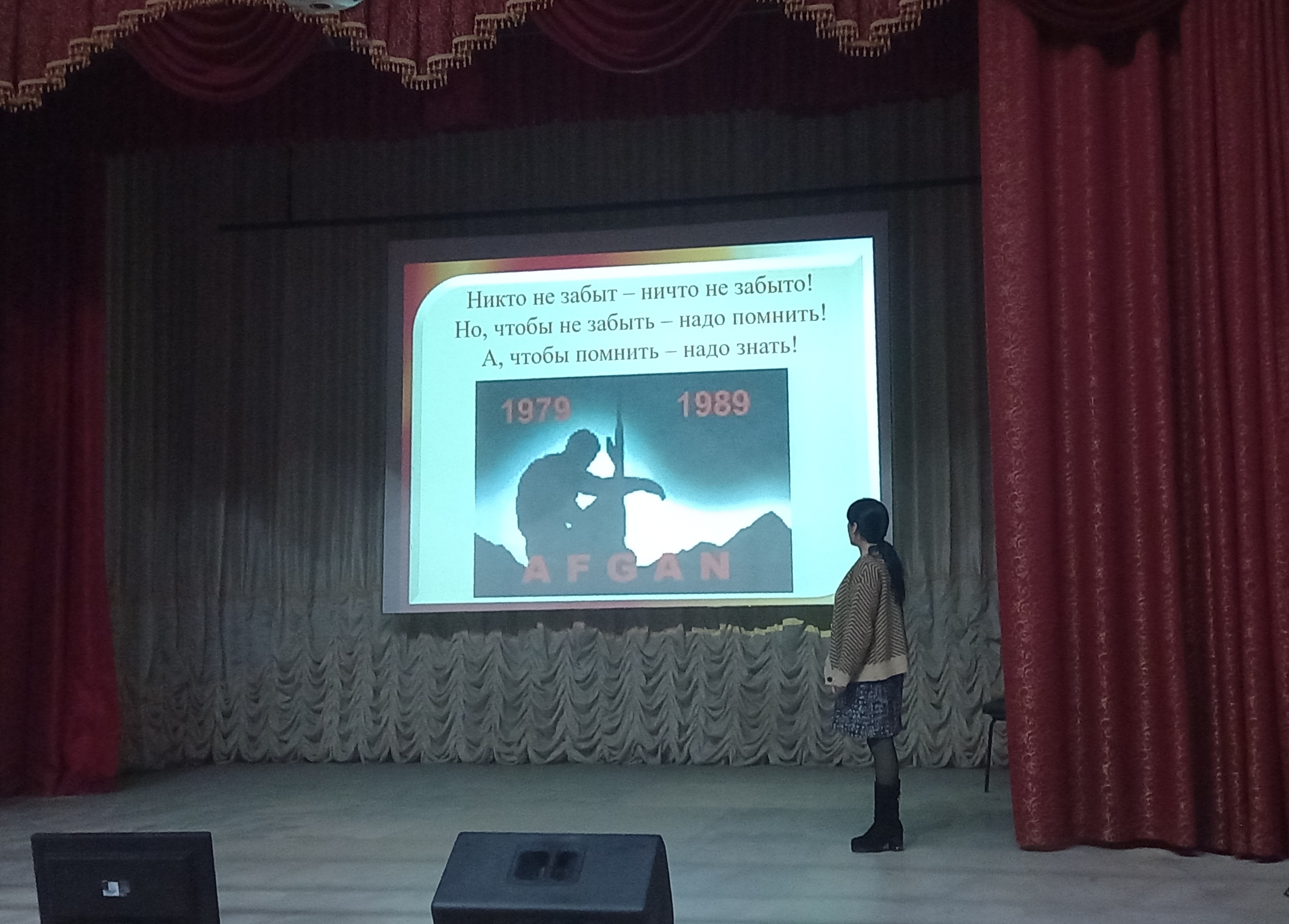 15 февраля — день вывода советских войск из Афганистана, день памяти воинов интернационалистов. Проведённый патриотический час «Имя подвига - Афганистан» с учащимися школы МКОУ СОШ №11– это дань памяти всем, кто причастен к героическим и трагическим событиям войны в Афганистане. В ходе мероприятия посмотрели видеоролик «Хроника событий Афганской войны», узнали историю «необъявленной войны», которая десять лет была болью нашей страны, о мужестве и отваге советских воинов и о помощи, оказываемой ими местным жителям. Мероприятие сопровождалось показом презентации «Афганистан – это память и боль». Всех погибших в «горячих точках» участники мероприятия почтили минутой молчания.
