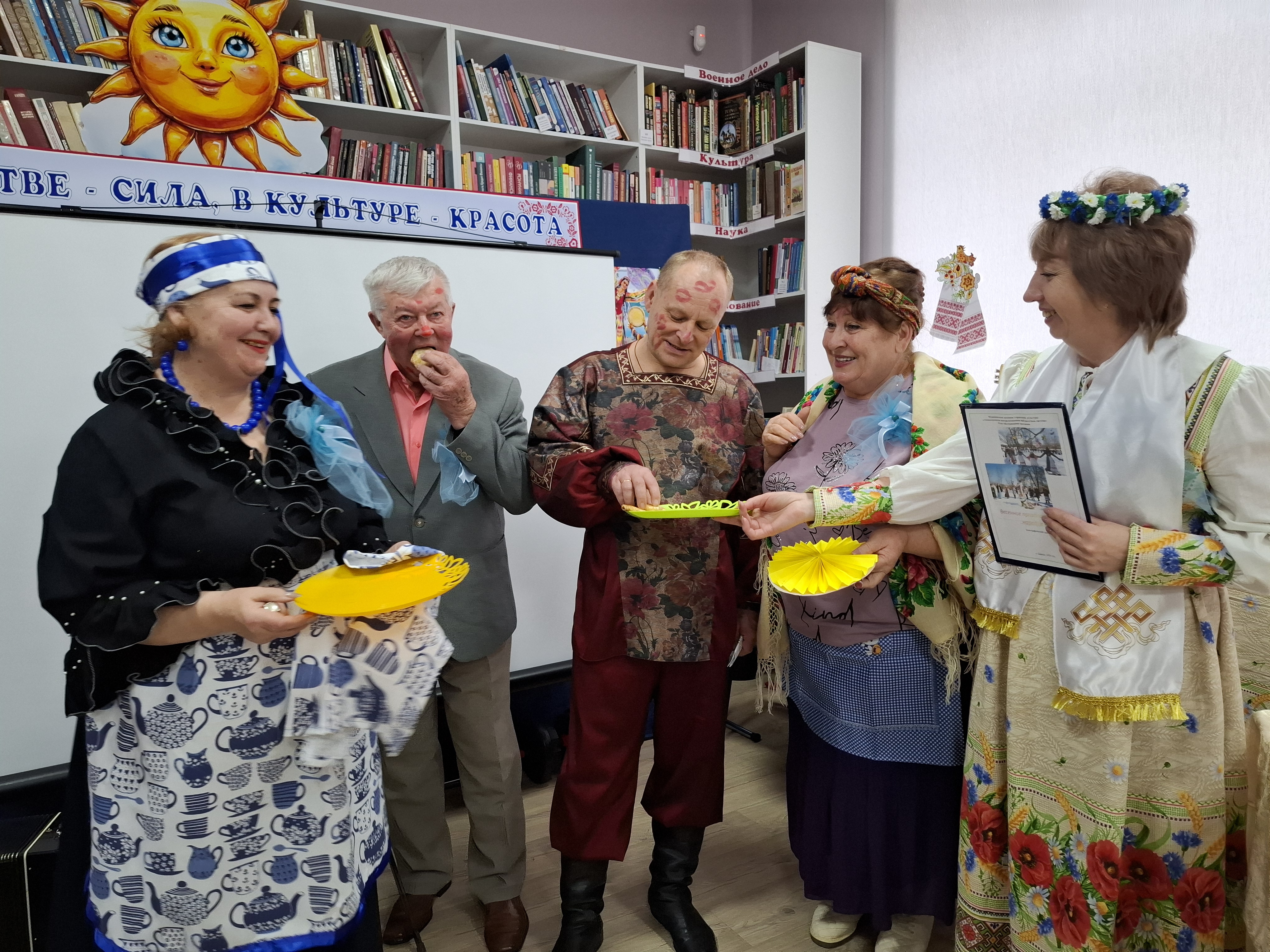 Театрализованное представление праздника Масленицы участниками клуба «Добрые встречи», в роли кумушек были Павлова Надежда Михайловна, Фаюстова Светлана Алибулатовна, теща – Шевченко Лидия Андреевна и зять – Билько Виктор Яковлевич.