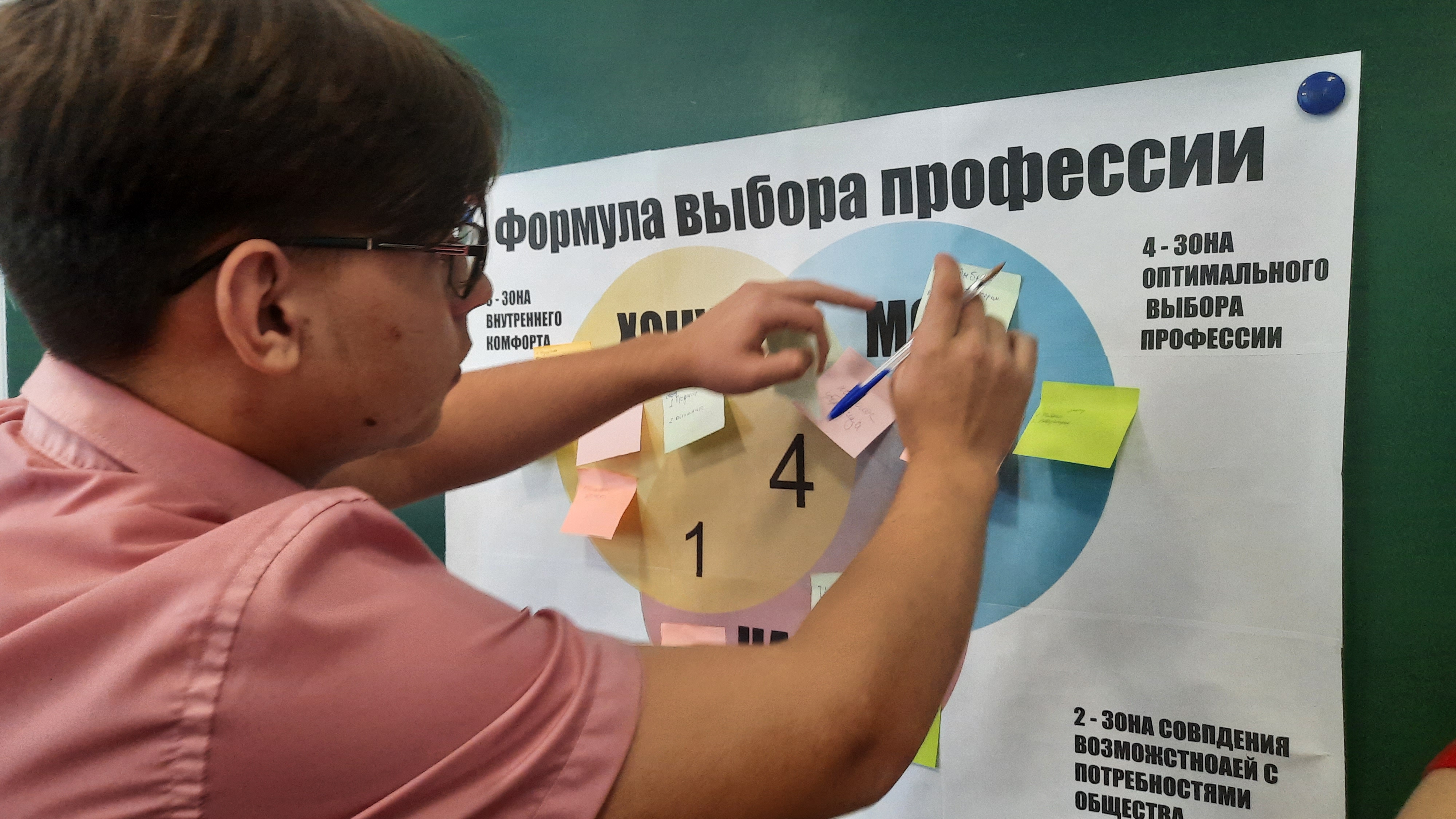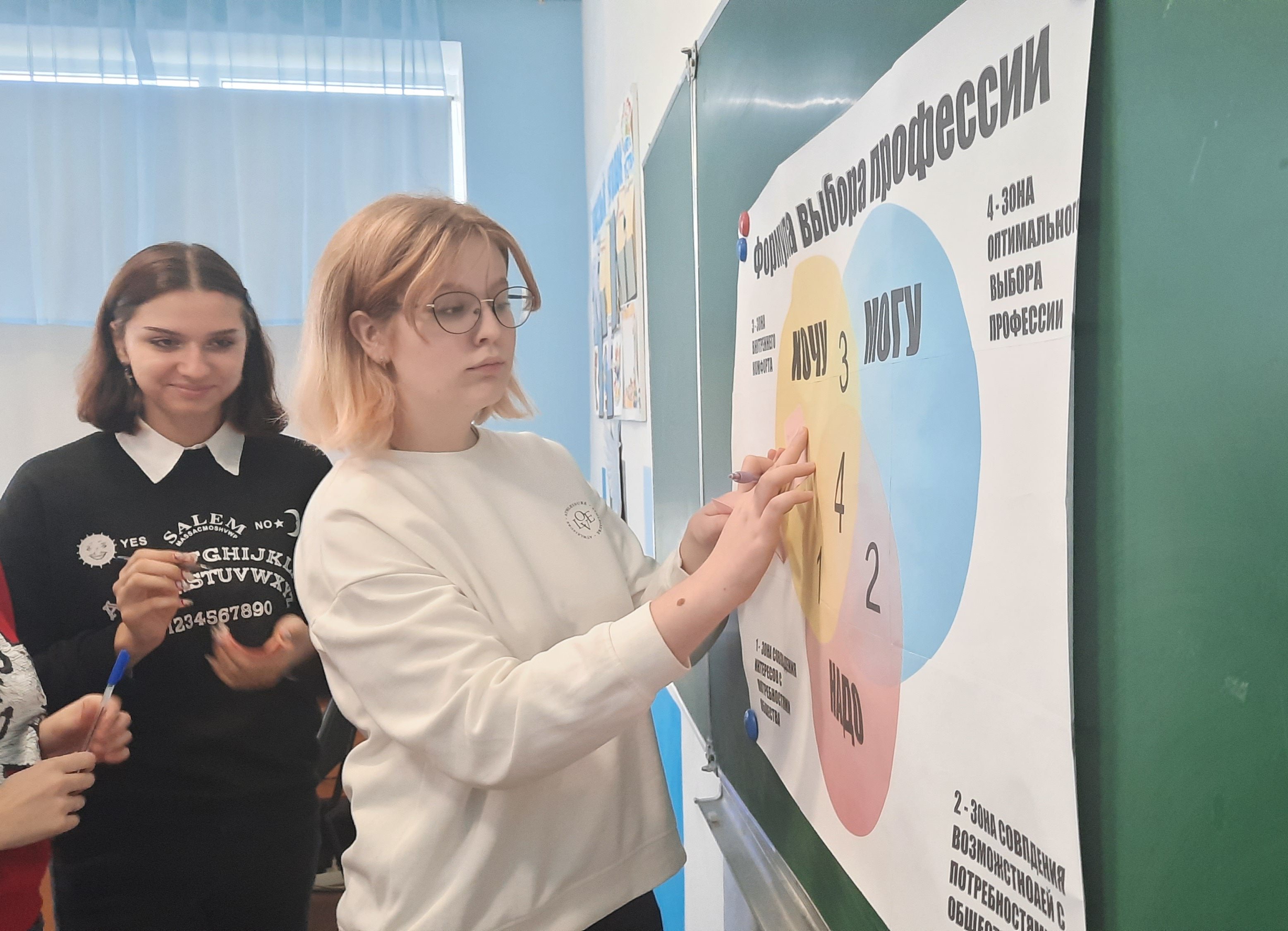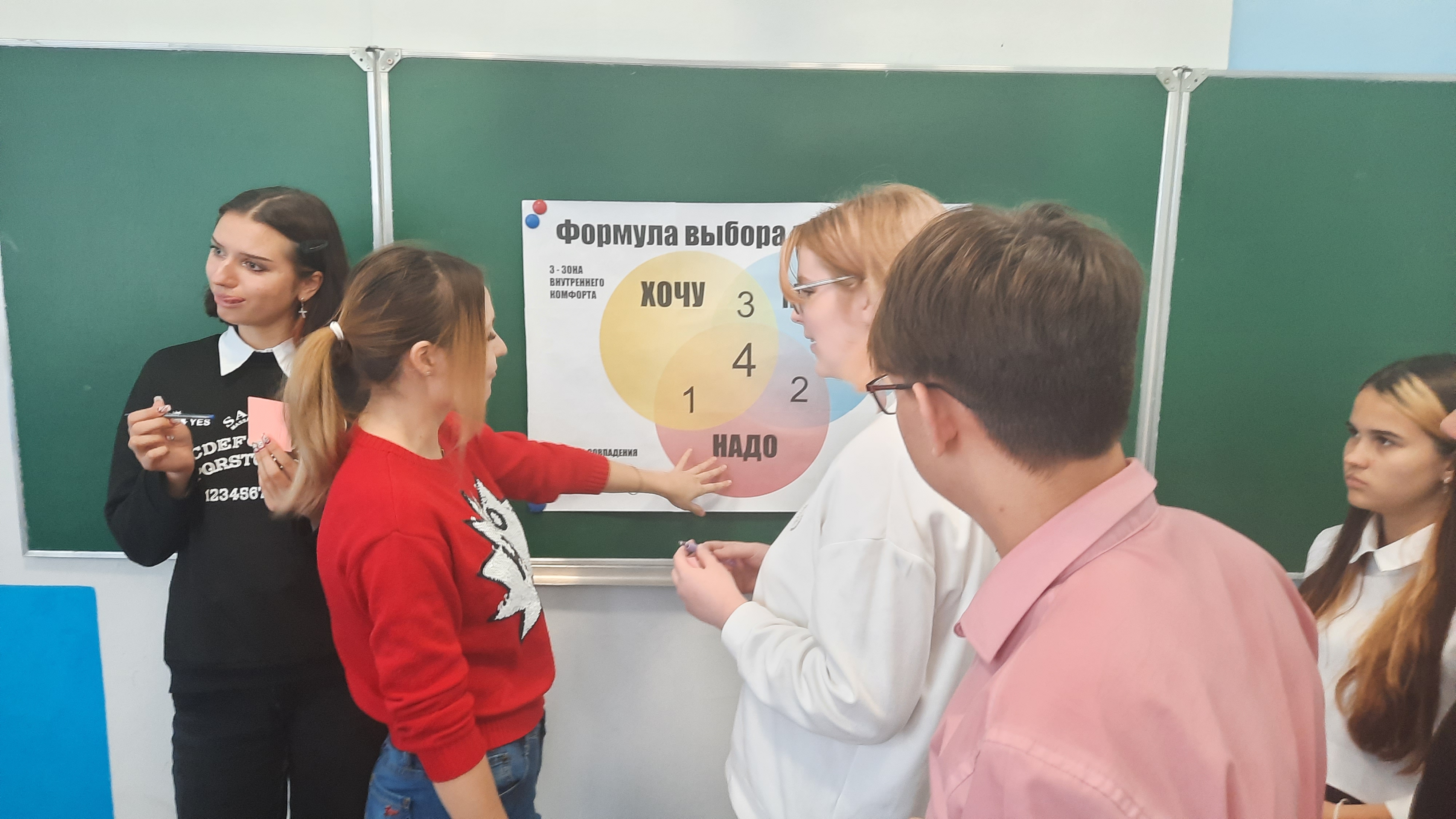 Ведущие рассказали о формуле осознанного выбора профессии: «хочу» + «могу» + «надо», и как она работает. Далее ребята составили свою формулу осознанного выбора профессии и выяснили, что, если у человека есть мечта и он твердо идёт к своей цели, он обязательно её достигнет. Но для этого нужно разобраться в себе, узнать свои сильные и слабые стороны, свои способности и недостатки.