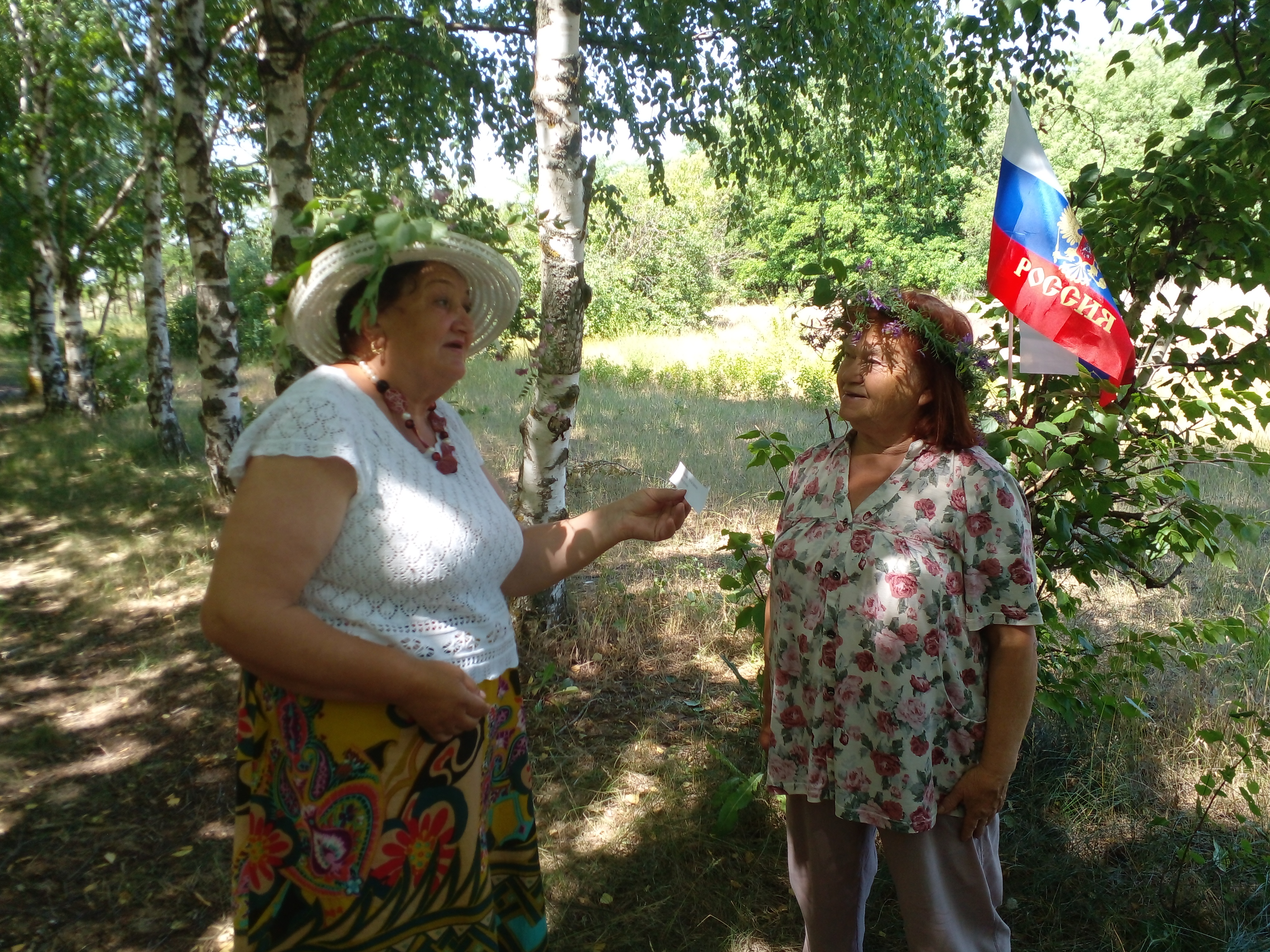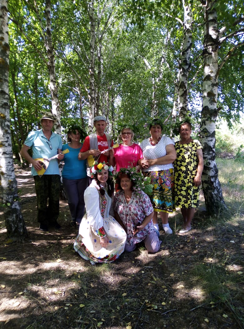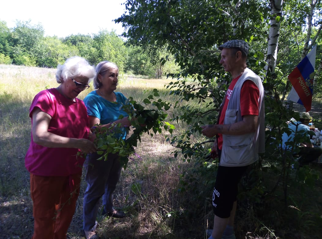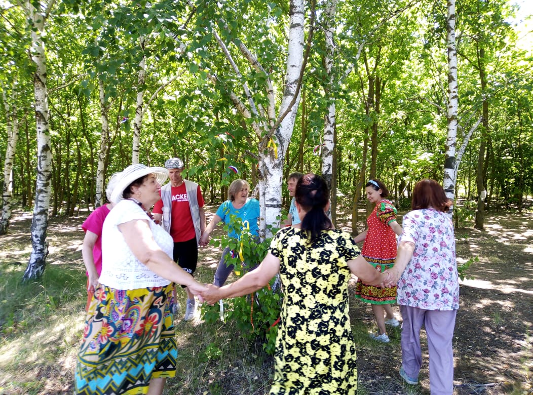 Участники получили интересную информацию об истории праздников, о символах России, вспомнили пословицы, поговорки и песни о Родине, о берёзе. Не обошлось и без традиционного проведения обрядов, проводимых на Троицу – обряд кумления, после которого устанавливаются временные отношения духовного родства. Провели и обряд завивания берёзки, украсив деревья ленточками и загадав желания. После обрядов водили хороводы, играли в русскую народную игру «Трынцы-брынцы, бубенцы», на ощупь доставали из корзинки предметы и отгадывали из какой сказки. Участники клуба получили массу положительных эмоций от встречи.