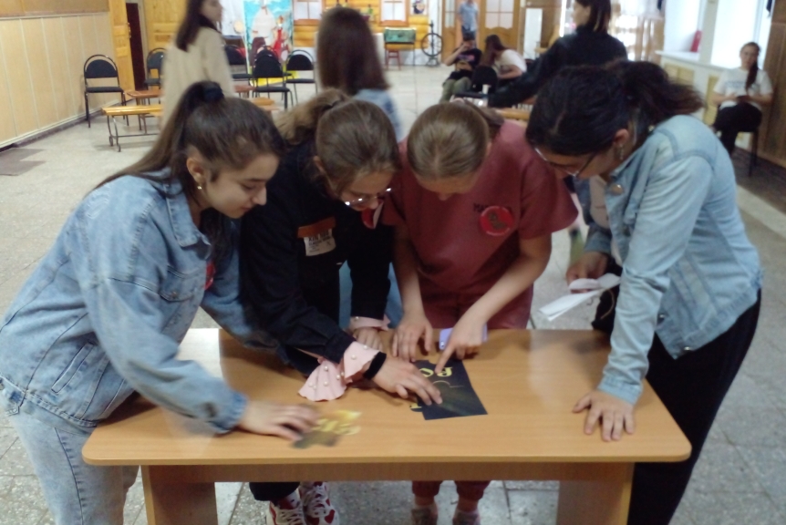 В зале абонемента библиотеки ребят встретила самая известная няня России Арина Родионовна, разделив участников мероприятия на команды, выбрав капитанов, загадывала загадки. Для перехода на следующую станцию Арина Родионовна предложила ребятам собрать пазл с иллюстрациями сказок А. С. Пушкина, а на обратной стороне пазла найти подсказку для своей команды.