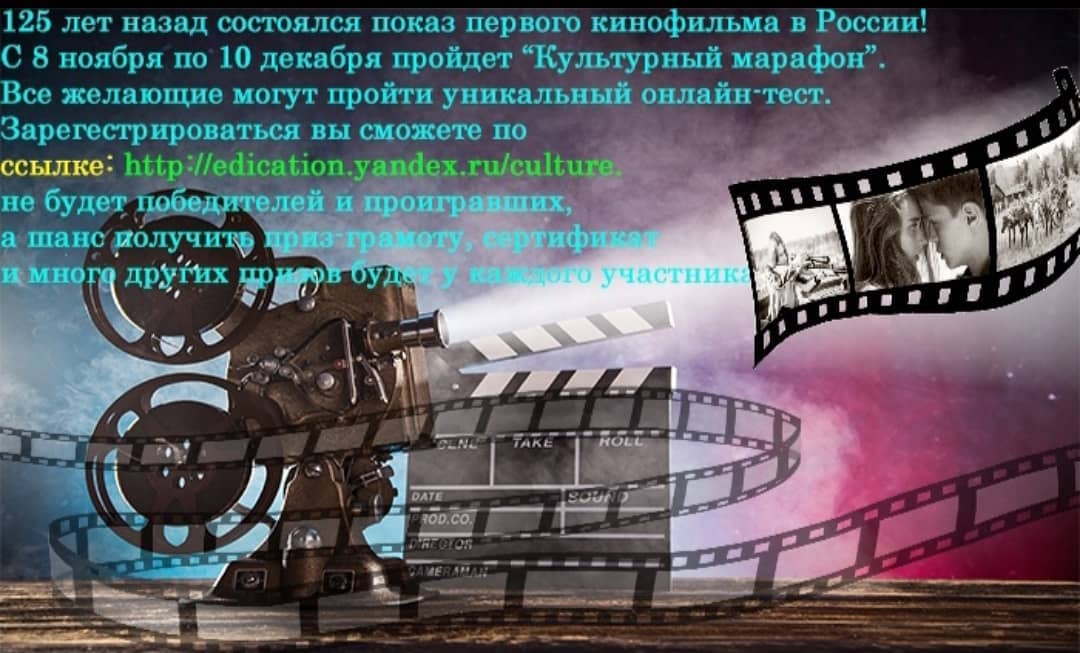 В рамках проекта «Культура для школьников» с 8 ноября по 10 декабря 2021 года стартовала ежегодная акция «Культурный марафон», которая приурочена к важной дате в истории кино — 125 лет назад в России состоялся первый киносеанс. Организаторами проекта выступили Министерство культуры Российской Федерации, Министерство просвещения Российской Федерации и Яндекс.