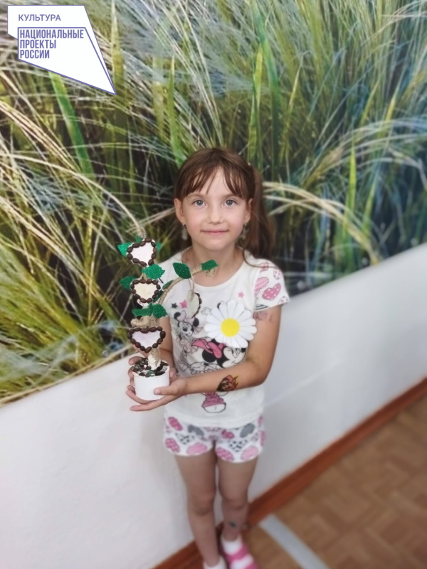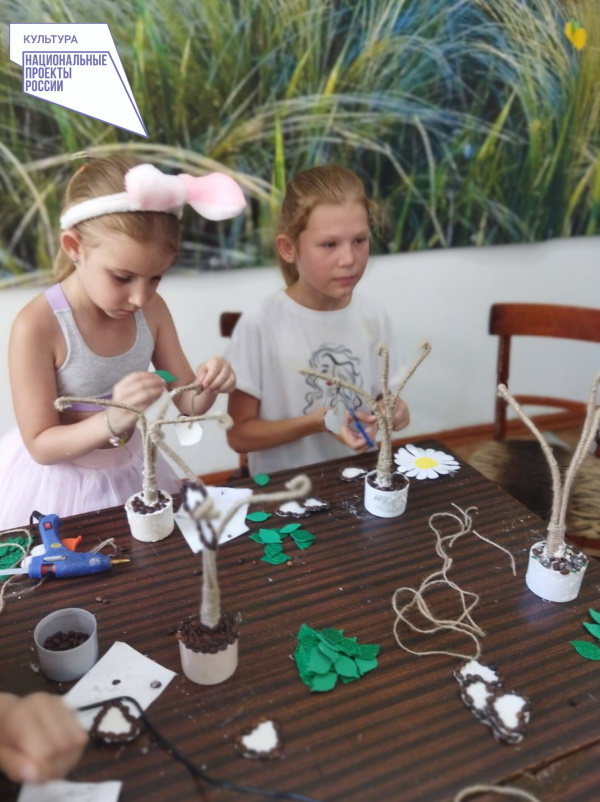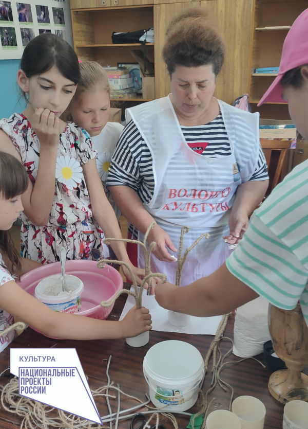 Во второй части мероприятия волонтёр культуры и по совместительству педагог дополнительного образования Центра детского творчества Мироненко Наталья Анатольевна провела для подростков мастер-класс по изготовлению семейного древа в технике «топиарий».