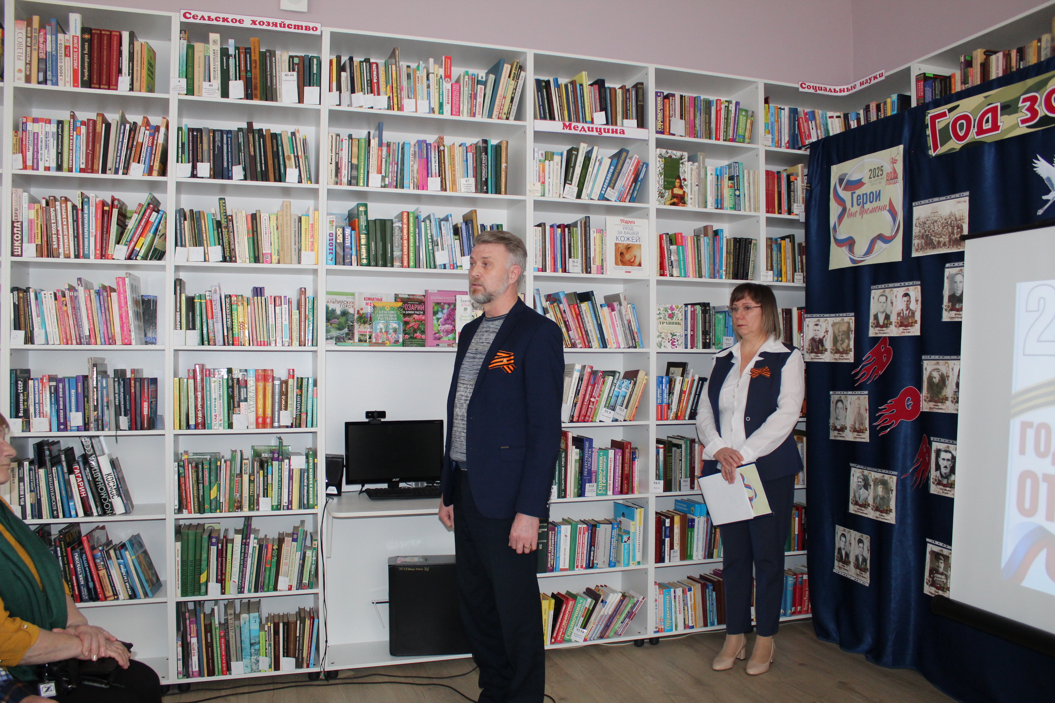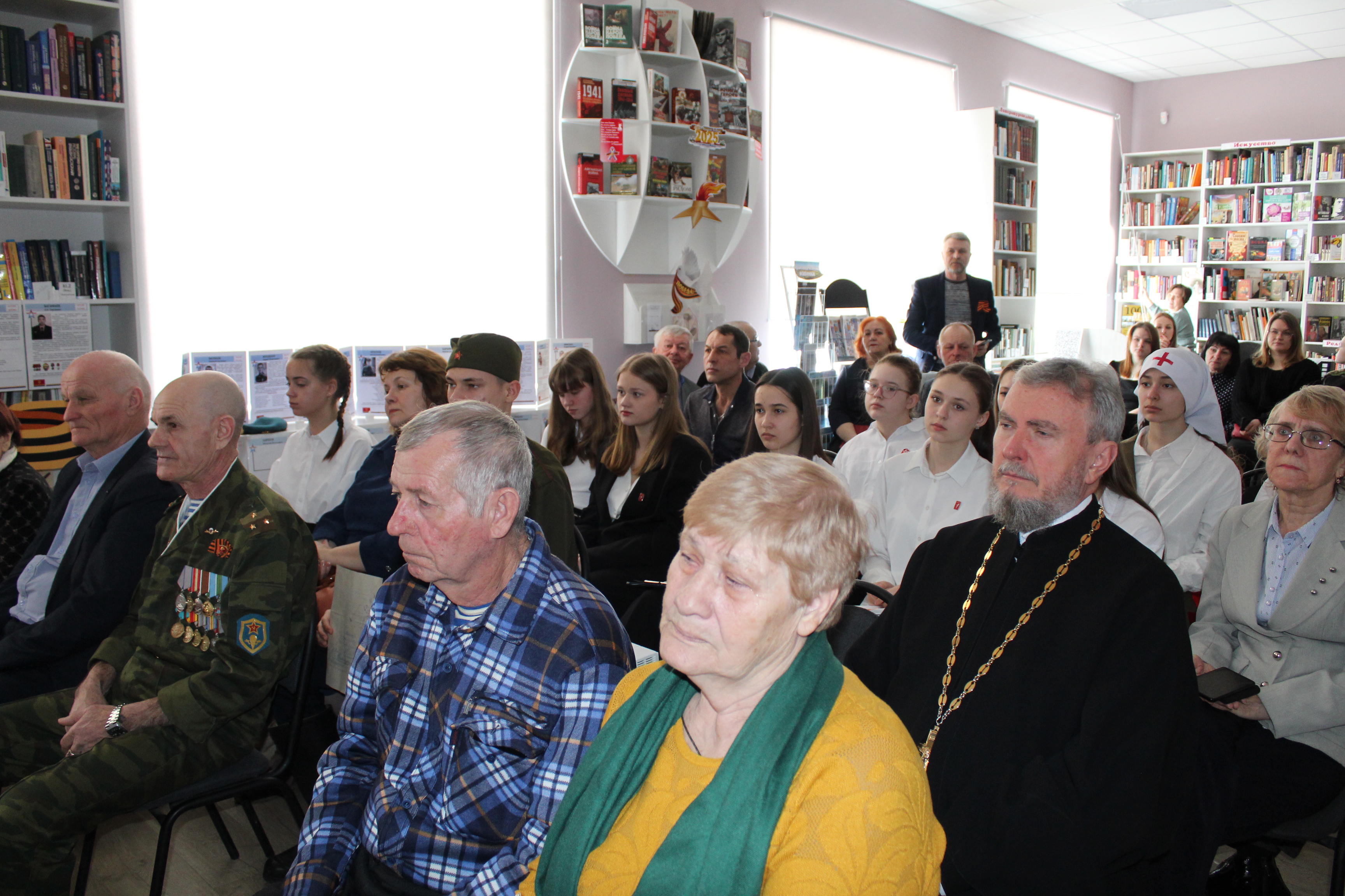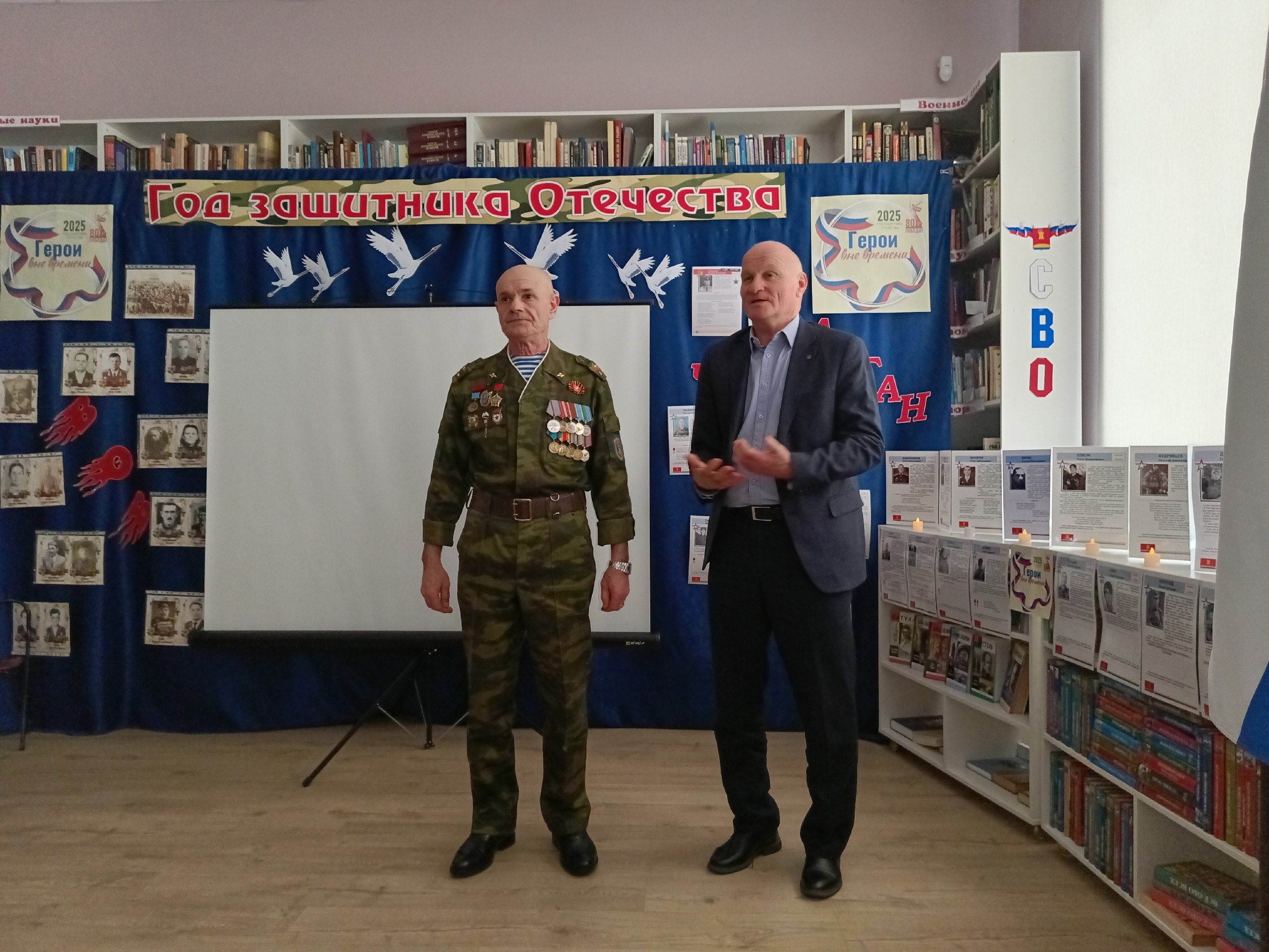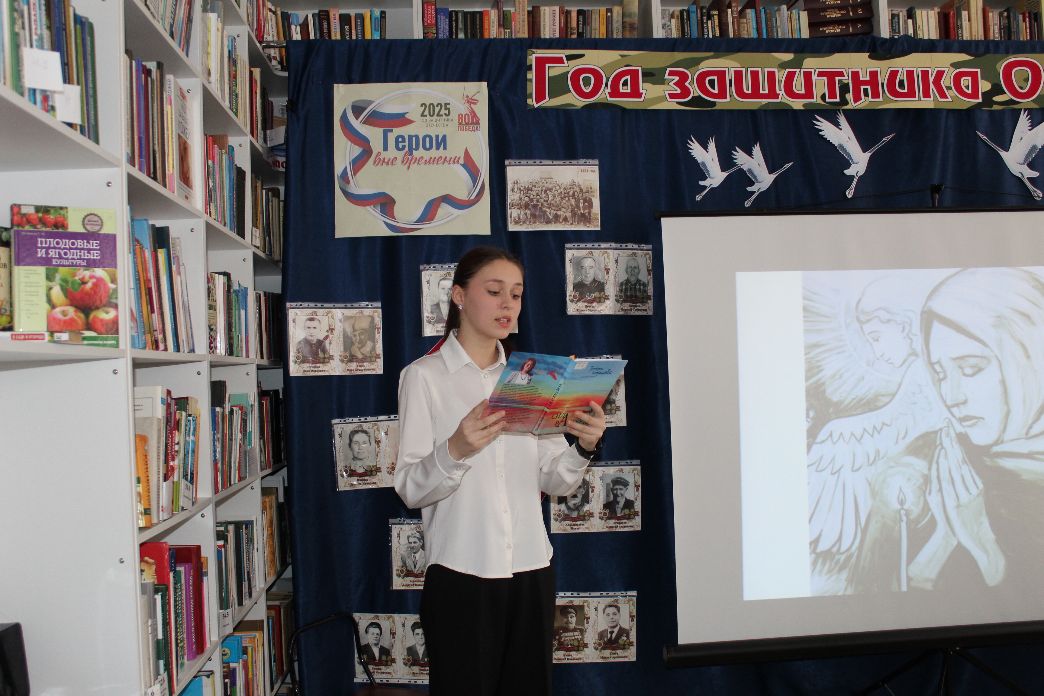 Своеобразным фоном для разговора о мужестве наших современников, молодых защитников России, о подвигах наших предков, о событиях Великой Отечественной войны и специальной военной операции стала военная лирика Степана Кадашникова. Его стихи прозвучали в исполнении ведущих и гостей сельской библиотеки.