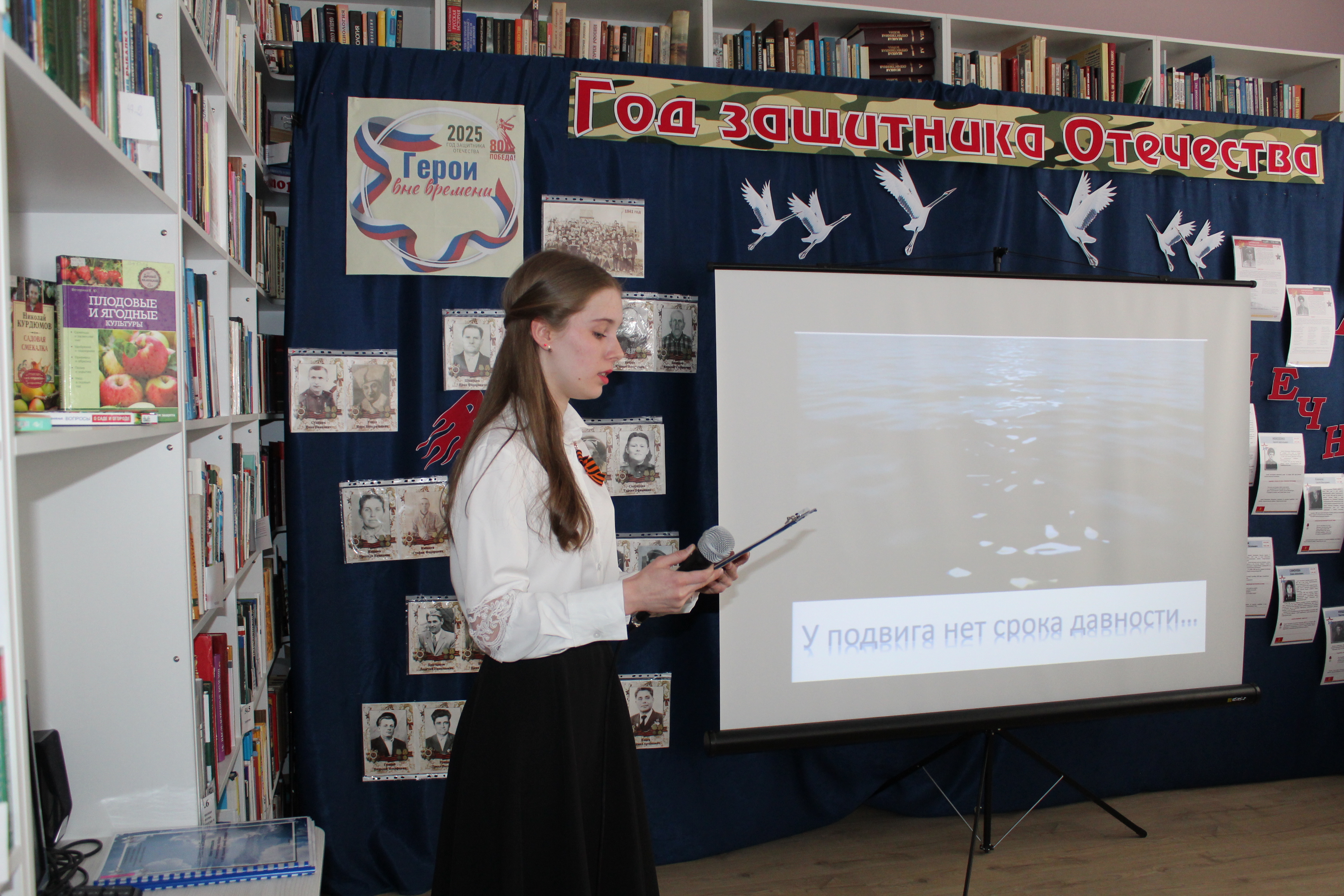 24 февраля в Центральной библиотеке с. Дивное прошёл литературно-исторический экскурс «Героизм вне времени», ставший открытием Года Защитника Отечества и данью уважения и памяти героям всех поколений: от солдат Великой Отечественной до бойцов, которые сейчас выполняют свой долг в зоне СВО.