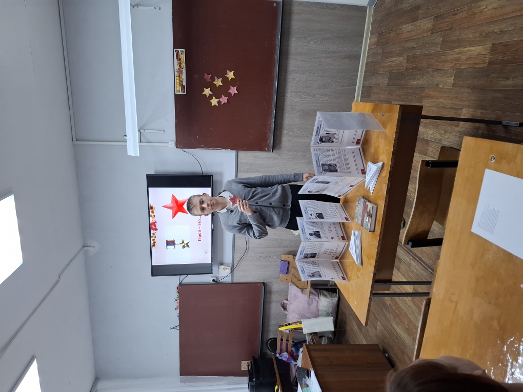 9 декабря мы отмечаем День Героев Отечества — особую дату, когда мы вспоминаем тех, кто проявил отвагу и самоотверженность на благо нашей страны. В этот день сотрудники центральной библиотеки МКОУСОШ №1 для школьников 10 «А», «Б» класса (преподаватель Коваленко С.В.) проведено литературное обозрение «Возьми в пример себе героя», посвященное памяти и подвигам защитников Родины. Участники окунулись в атмосферу героизма и мужества, узнали много нового о выдающихся личностях, которые внесли значительный вклад в защиту и развитие нашей Родины. Ребята, отлично справились с заданием, нужно было на звездочках закончить предложение «Герой это…».