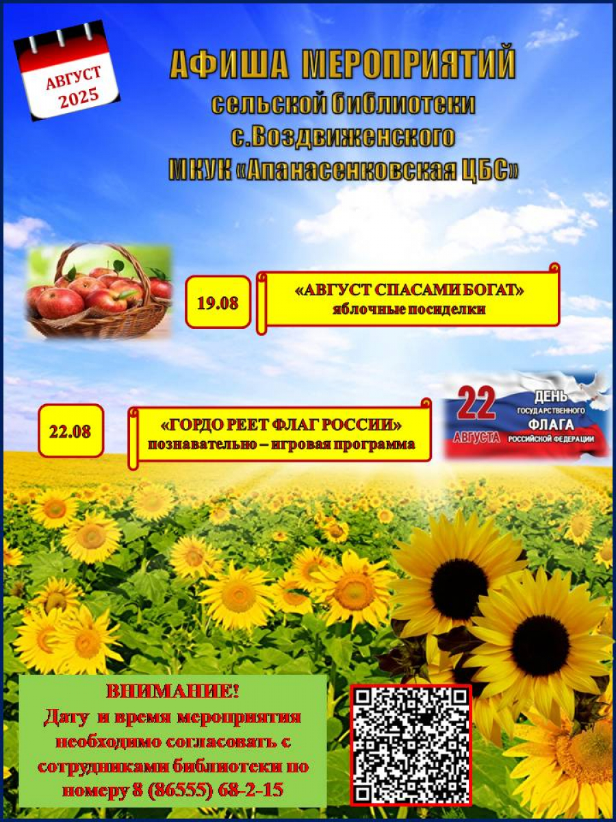 Афиша мероприятий на август сельской библиотеки села Воздвиженского МКУК "Апанасенковская ЦБС"