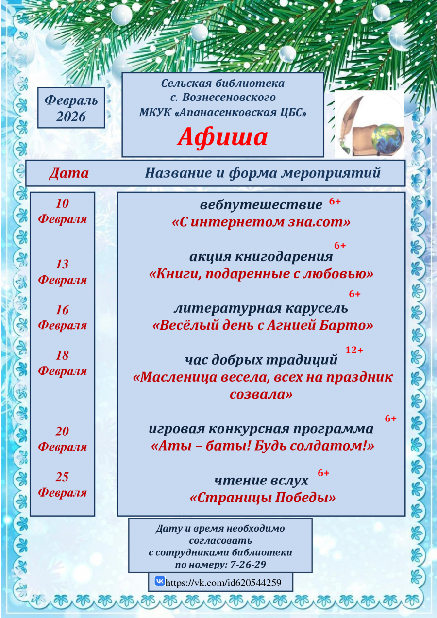 "Афиша на февраль" сельская библиотека с. Вознесеновского МКУК "Апанасенковская ЦБС"