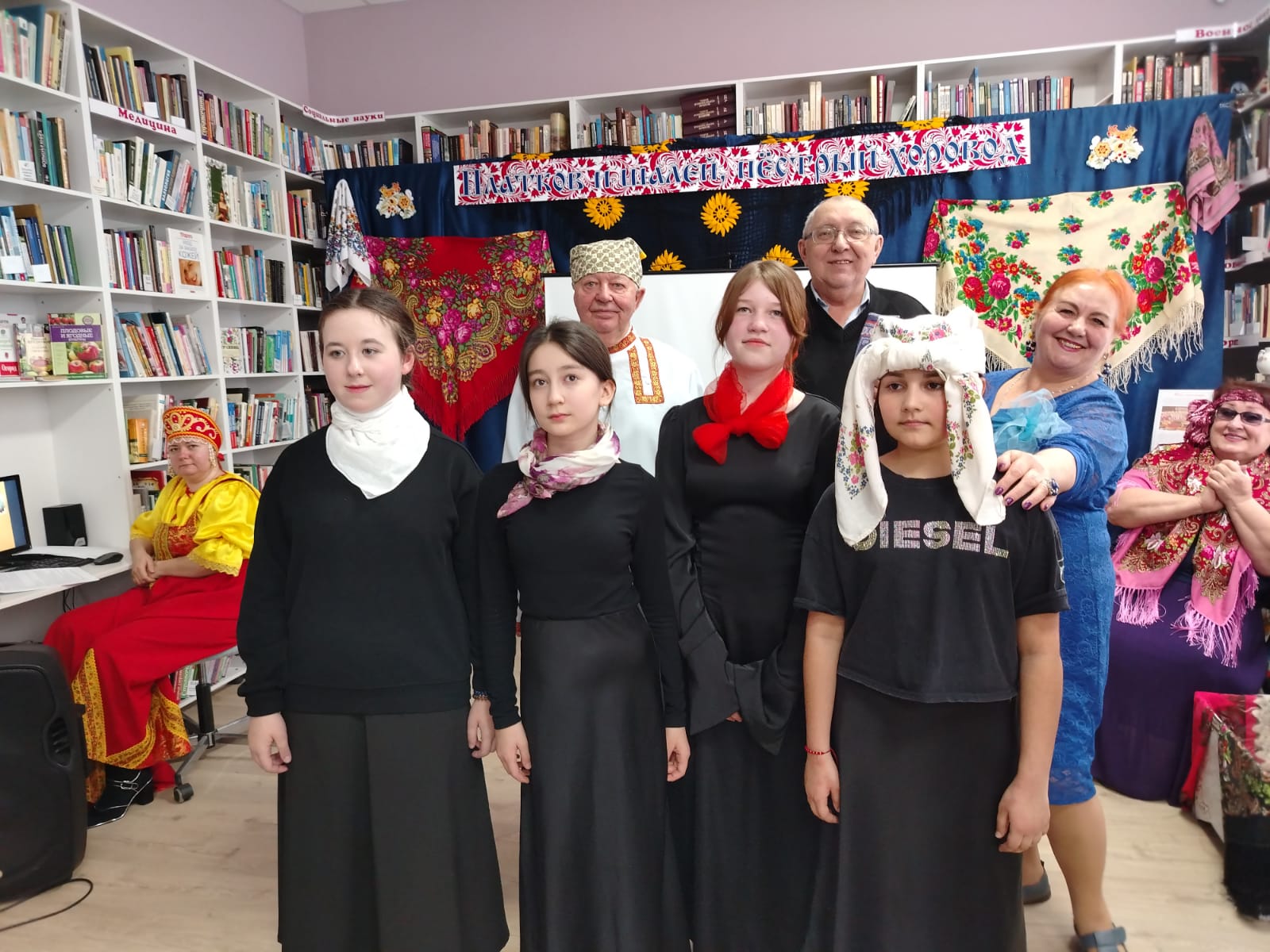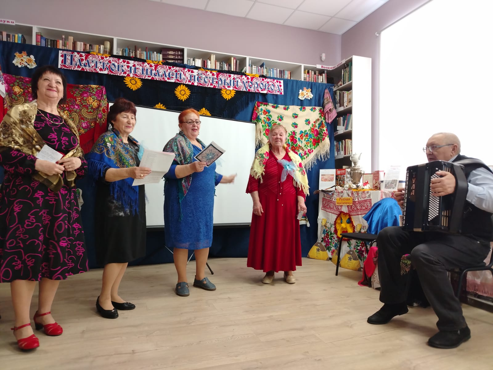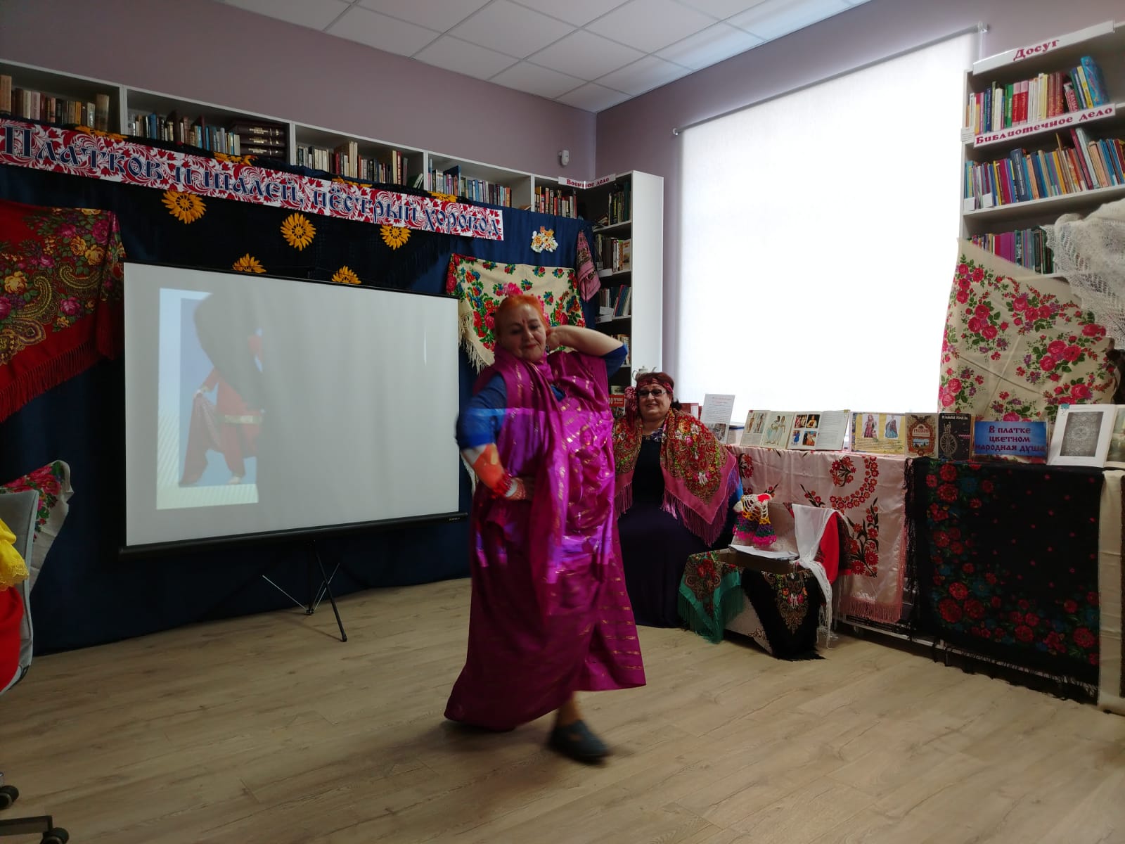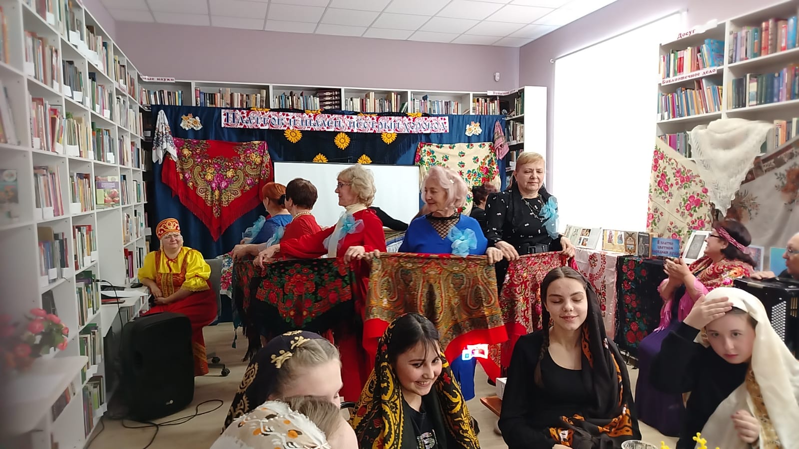 К мероприятию в библиотеке была оформлена выставка-инсталляция «В платке цветном народная душа» с красочными платками, шалями, книгами.