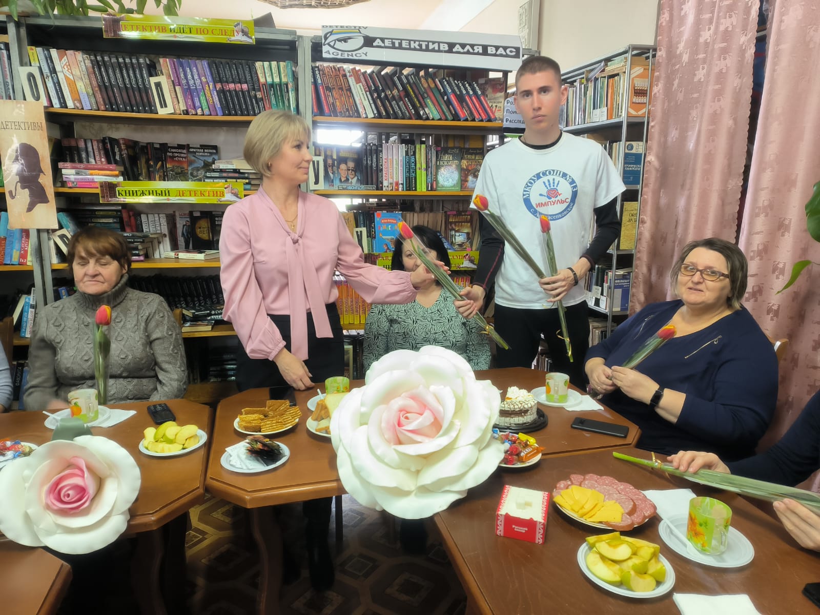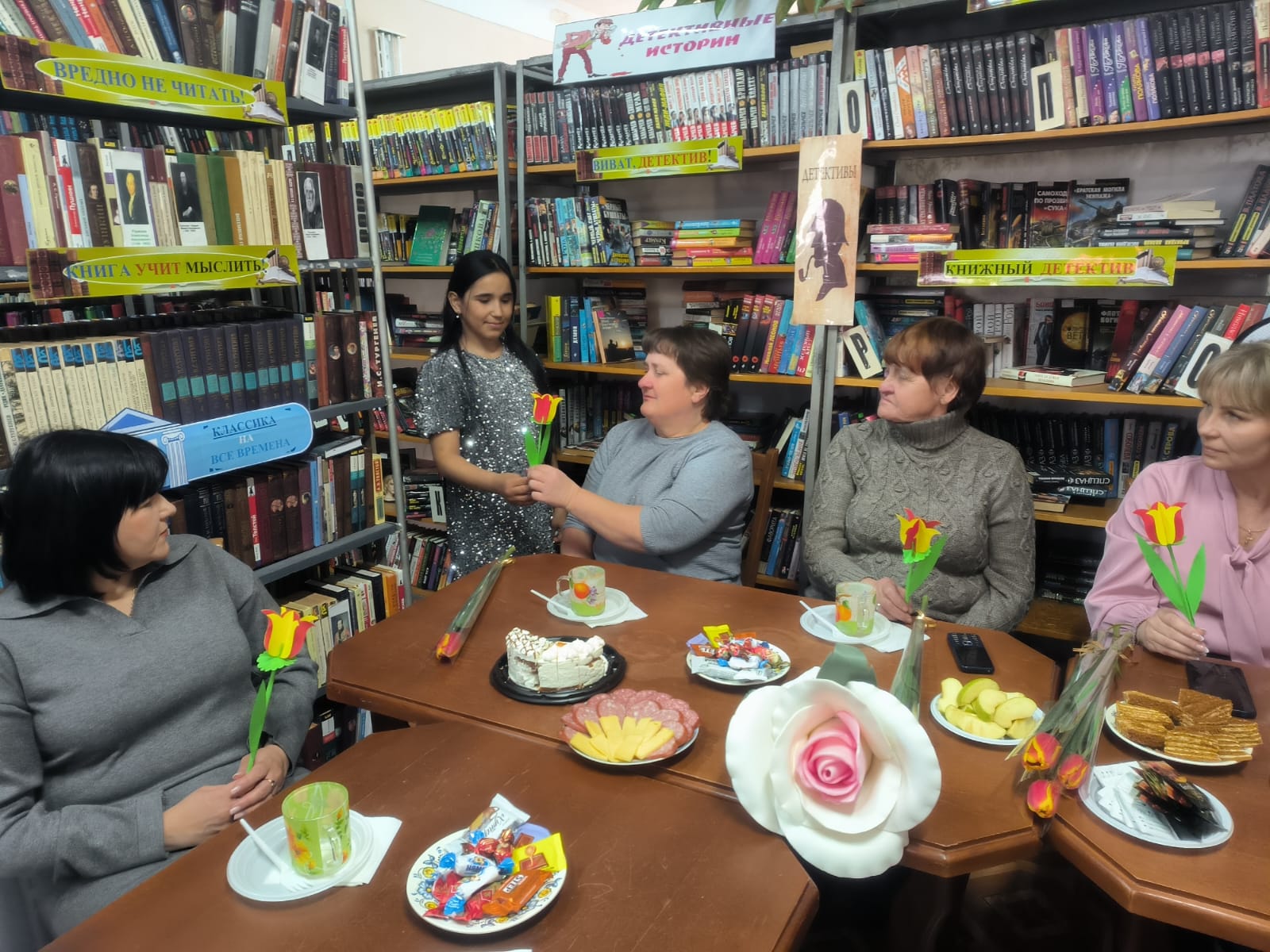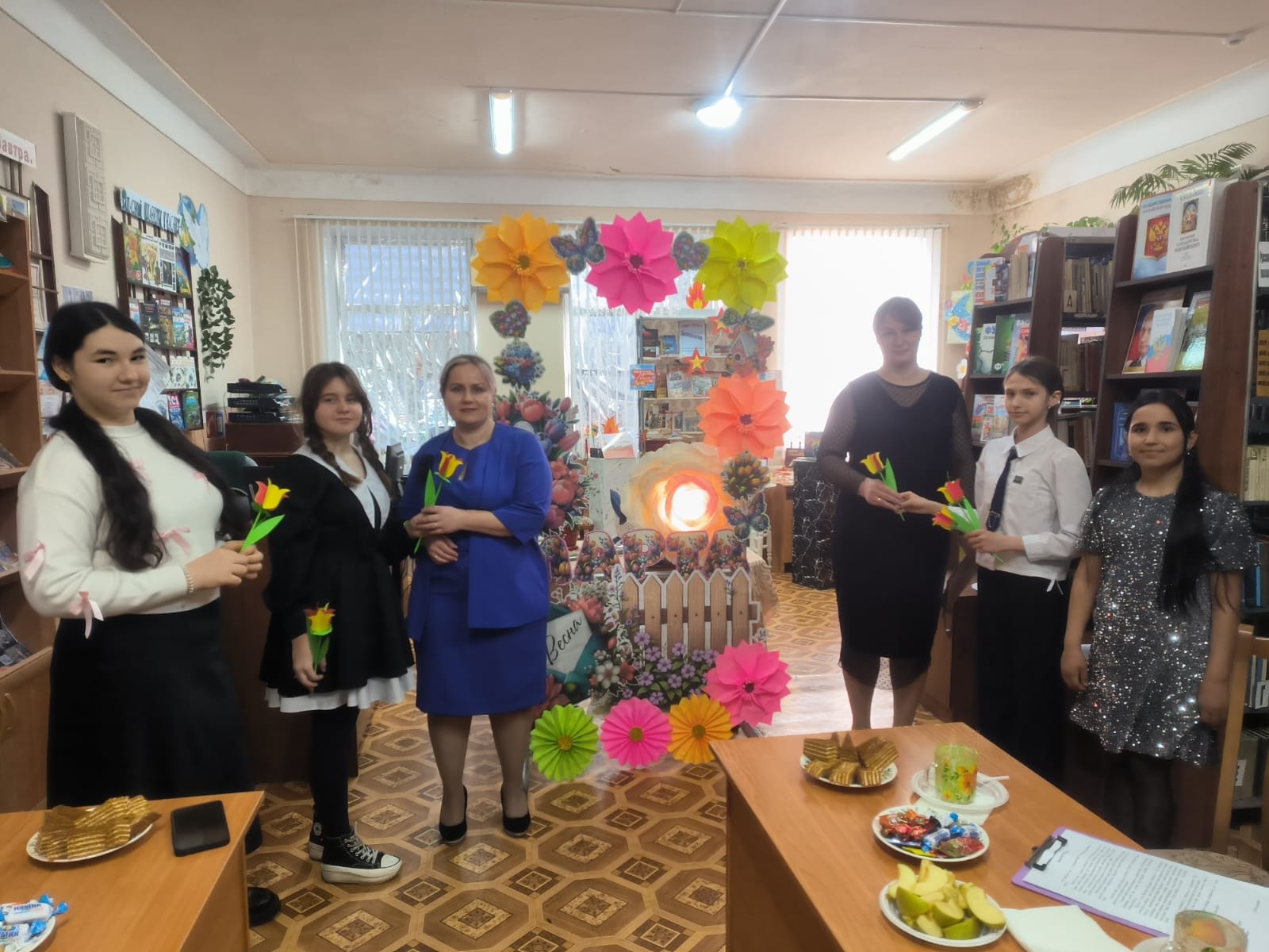 «Живите сердцем!» под этим названием в Апанасенковской сельской библиотеке прошло праздничное мероприятие в честь жен и матерей участников специальной военной операции, приуроченное к международному женскому дню 8 марта. 06 марта специалисты библиотеки совместно с сотрудниками дома культуры подготовили литературно – музыкальную встречу, создавшую теплую атмосферу, подарив участникам мероприятия возможность отвлечься от повседневных забот и почувствовать поддержку. Для поздравления дорогих женщин слово предоставили члену совета «Женщины России» и начальнику территориального отдела села Апанасенковского Мардвинцевой Н.Я., участникам волонтерского движения Поправка Д. и Аполонскому Т. (ученики 10 кл.), а ученицы 6 класса исполнили для гостей музыкальную композицию «Мама» и зачитали стихотворение о бабушке. Чтобы порадовать и объединить присутствующих библиотекарь Капшук Н.В. с ребятами 6 кл. организовала мастер – класс по изготовлению тюльпанов из бумаги, которые после подарили приглашенным гостям. Ведущие встречи сумели создать теплую, проникновенную атмосферу. В знак признательности и уважения волонтеры культуры подарили женщинам цветы. #МЫВМЕСТЕ #8Марта