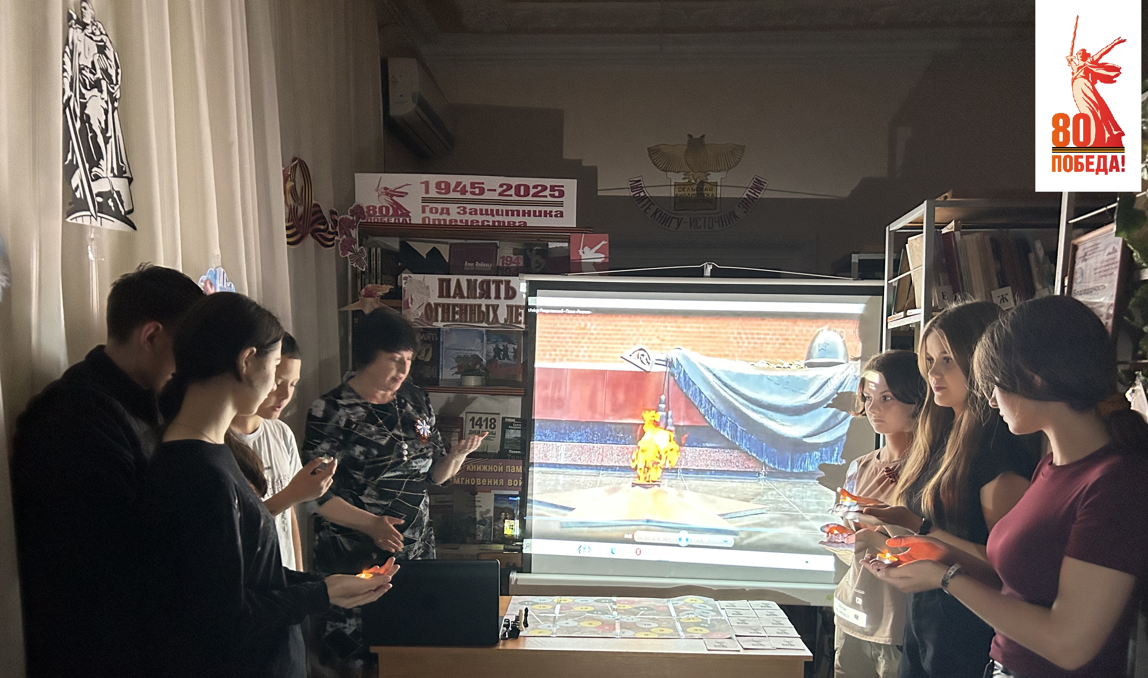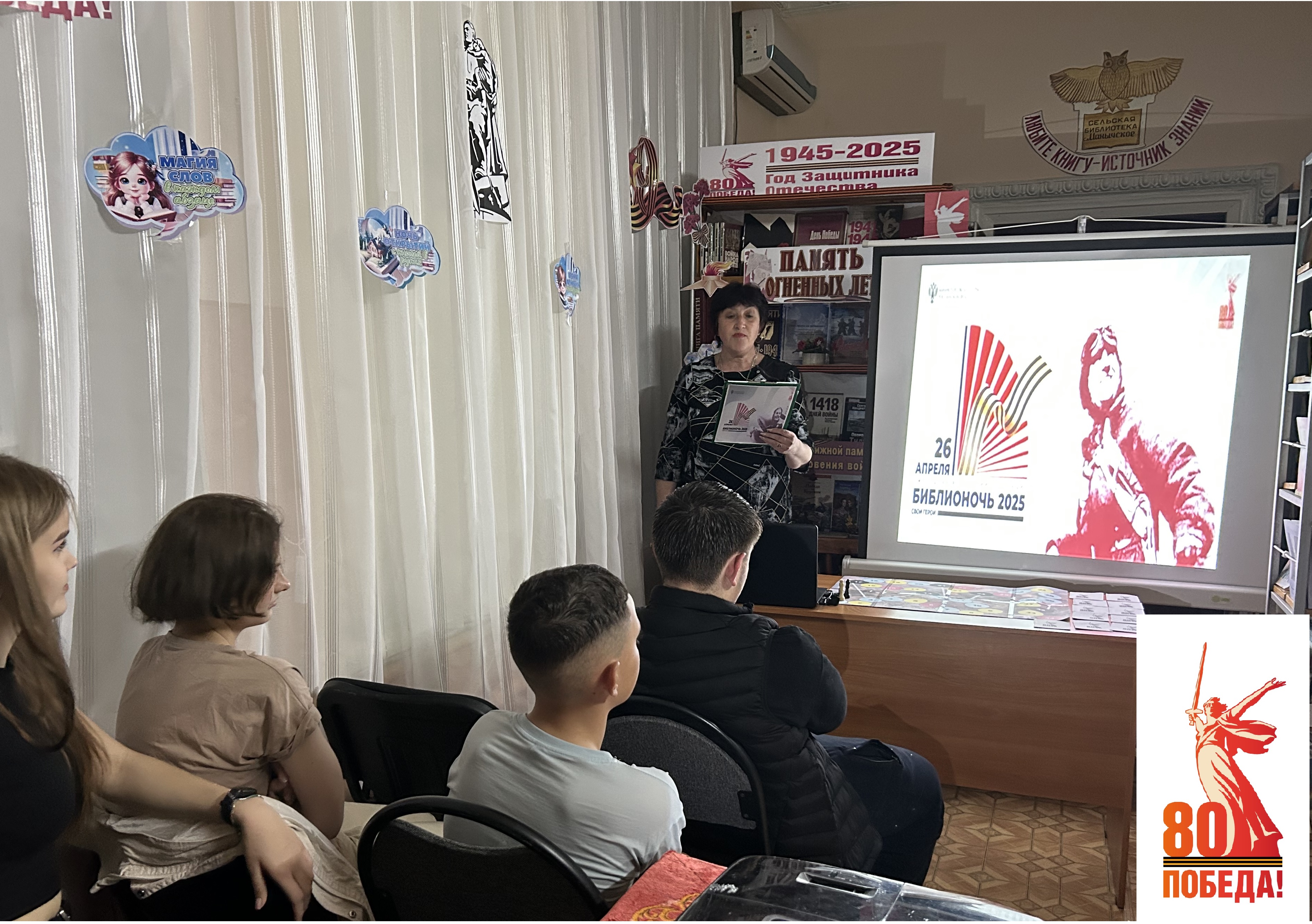 26 апреля Манычская сельская библиотека в очередной раз пригласила читателей своей библиотеки, учащихся 8 класса МБОУСОШ №8, на ежегодную Всероссийскую акцию « Библионочь 2025» , в Год защитника Отечества и 80-летия Великой Победы тема акции – «Свои герои». Мероприятие прошло насыщенно и интересно. Открылось событие литературно-историческим экскурсом «Священные страницы навеки в памяти людской», погружающим ребят в атмосферу военной эпохи через чтение стихов, прозы и документов тех времен. Ведущая мероприятия рассказала о подвигах героев, о жизни на фронте и в тылу, создав ощущение сопричастности событиям далекого прошлого. Выступления ведущего сопровождались видео роликами военных лет и мелодиями военных песен. Затем гостей ожидала увлекательная настольная игра «Дорогами войны», где участники могли почувствовать себя разведчиками, солдатами, медсестрами и командирами, принимая решения и преодолевая трудности военного времени. Следующим этапом стало участие в музыкальной игре «Эти песни спеты на войне». Посетители окунулись в мир фронтовых мелодий. Завершилось мероприятие минутой молчания в память обо всех погибших солдатах Великой Отечественной войны. Библиотека вновь напомнила гостям о важности сохранения исторической памяти и передачи её будущим поколениям.