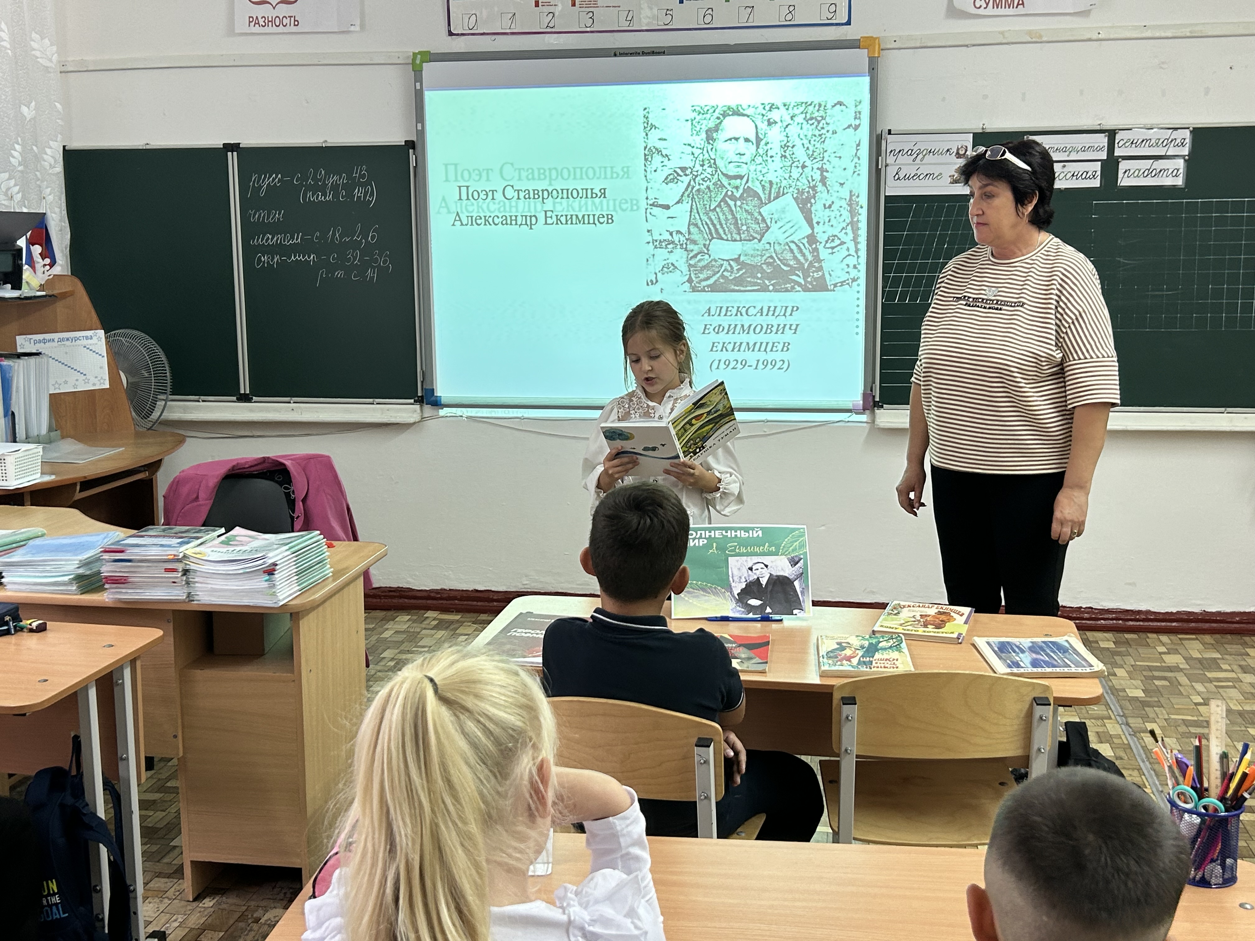 В рамках мероприятий посвящённых празднованию Дню Ставропольского края специалист сельской библиотеки с. Манычское для учащимся 3 класса МБОУ СОШ№8 провела литературный ералаш « Я с тропинками дружу», целью которого было донести детям ту светлую и добрую поэзию, которая поможет расширить кругозор, сделать детство задорным и радостным. Ведь добрые книжки Екимцева открывают детям лучшие стороны мира, воспитывают человека чуткого, отзывчивого, любящего свой край Александр Ефимович Екимцев широко известен на Ставрополье как автор стихов для детей. Своим творчеством он стремился вселить в душу детей чуткую любовь к миру. Его стихи добры, образны, красочны, полны детской непосредственности. Как чудо предстаёт перед детьми мир, где лепечут ручьи, разъезжает на коне дождик, дружат между собой звери и люди. Библиотекарь рассказала ребятам о жизни и творчестве поэта, о том, что кроме стихов им были созданы две поэмы для детей о войне. Ребята с удовольствием слушали поэму « Брянский лес», читали стихи: «Дедушка туман», «Ехал дождик на коне», «Десять добрых тропок» и разгадывали загадки о природе.