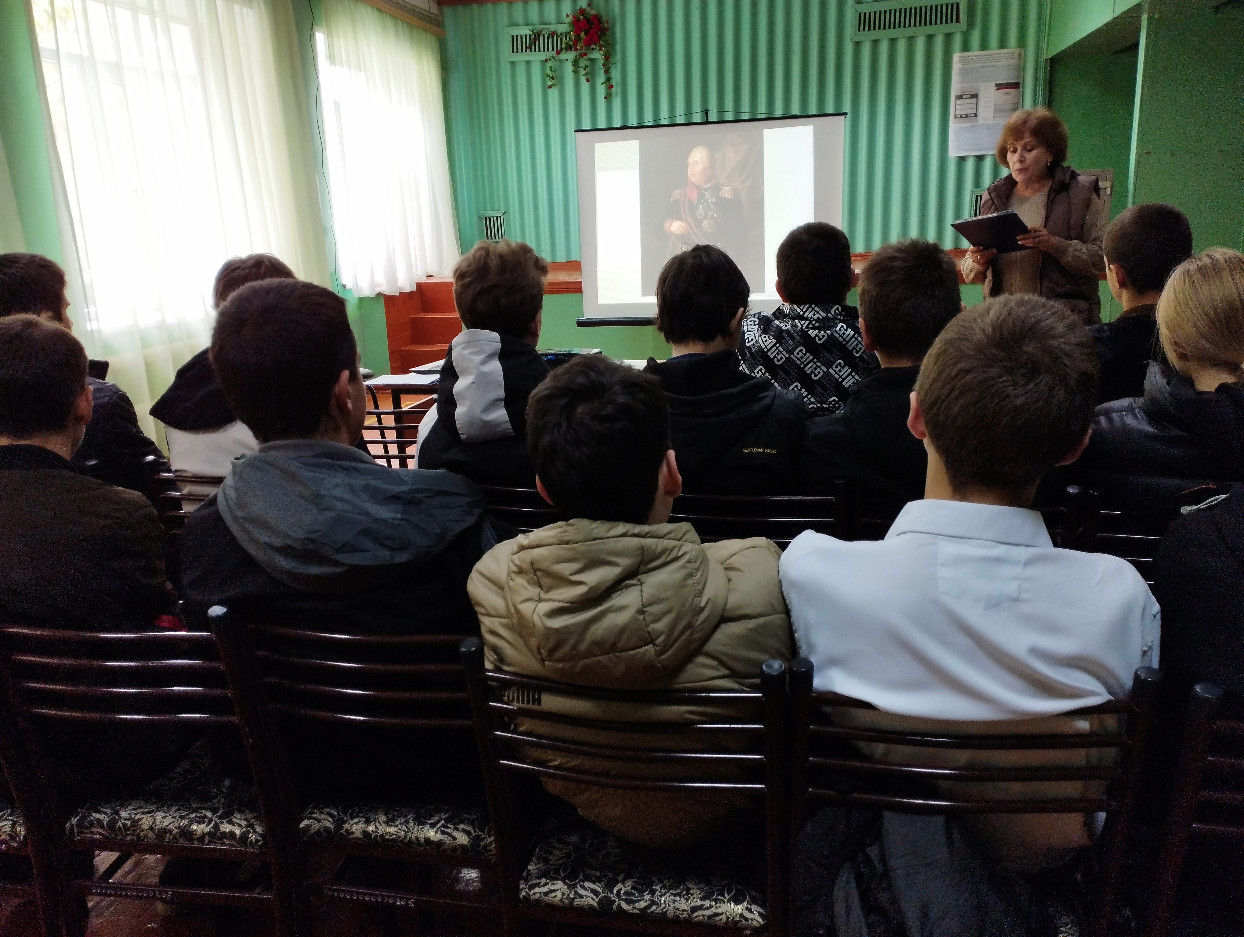 Сотрудники библиотеки, используя презентацию, познакомили ребят с жизнью и подвигами русского военачальника, рассказали о ключевых сражениях, в которых он участвовал, о его стратегическом гении, проявившемся во время русско-турецких войн и Отечественной войны 1812 года, о его роли в защите Отечества. Особое внимание было уделено личности Кутузова, его мудрости и преданности делу. Открытием для ребят стало то, что Михаил Илларионович стал первым полным кавалером ордена Святого Георгия. Девятиклассники узнали, как благодарные потомки увековечили имя полководца в памятниках, в названии ордена, крейсера ВМФ России и астероида 2492, названиях проспекта и станции метро в Москве, улиц городов страны.