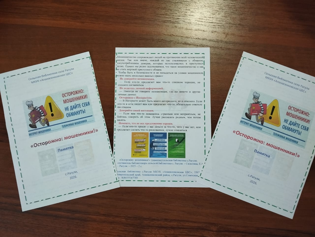 С целью повышения правовой грамотности и для профилактики случаев мошенничества в отношении граждан пожилого возраста в сельской библиотеке с. Рагули был подготовлен час информации для зрелого возраста «Не дай себя обмануть». Тема не простая, но очень актуальная в наши дни. Не секрет, что именно люди пенсионного возраста, ввиду своей доверчивости, чаще всего становятся жертвами этих неправомерных действий. Рассказали собравшимся об основных видах мошенничества, о наиболее распространенных приёмах мошенников, о правилах безопасного поведения и о том, как защитить себя и свою семью от мошенников, по каким признакам их можно распознать и что делать, если тебя все-таки обманули? Участники мероприятия поделились своими личными ситуациями. В завершении участникам мероприятия вручили памятку «Осторожно: мошенники!». Предупрежден, значит – вооружен: всегда важно знать о возможной угрозе обмана, чтобы не стать его жертвой.