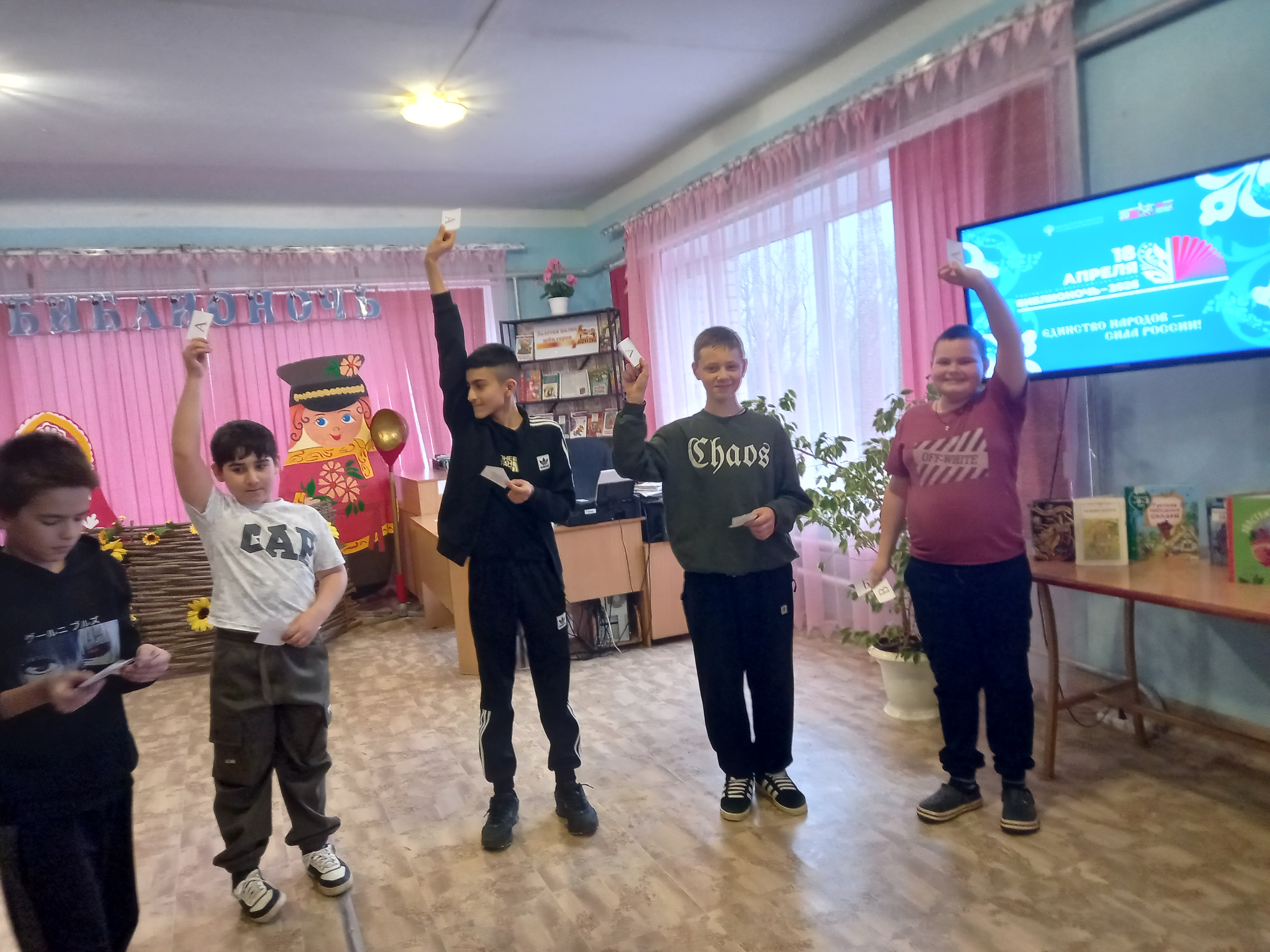 В рамках Всероссийской акции «Библионочь – 2026» в сельской библиотеке была организованна литературно - познавательная программа «Народов много – страна одна», чтобы показать, насколько богата и многолика наша страна. В начале мероприятия заведующая библиотекой рассказала присутствующим об истории "Библионочи", ее традициях, а также об особенностях акции 2026 года. Волонтер культуры представила подборку сказок народов России, рассказав, что Россия–многонациональная страна, а книга — это нить, связывающая нас, таких разных, но мы с удовольствием читаем книги разных народов. Участники мероприятия познакомились с богатым культурным наследием, традициями, обычаями и костюмами народов нашей многонациональной Родины, приняв участие в интеллектуальной игре «Многоликая Россия». Затем они отгадывали загадки, собирали пазлы, играли в настольные игры, отвечали на вопросы викторины и приняли участие в народных играх. Мероприятие прошло в тёплой и дружеской атмосфере и завершилось чайными посиделками. В наше время очень важно, чтобы молодое поколение выросло патриотами своей страны, знающими историю и культуру своей Родины.