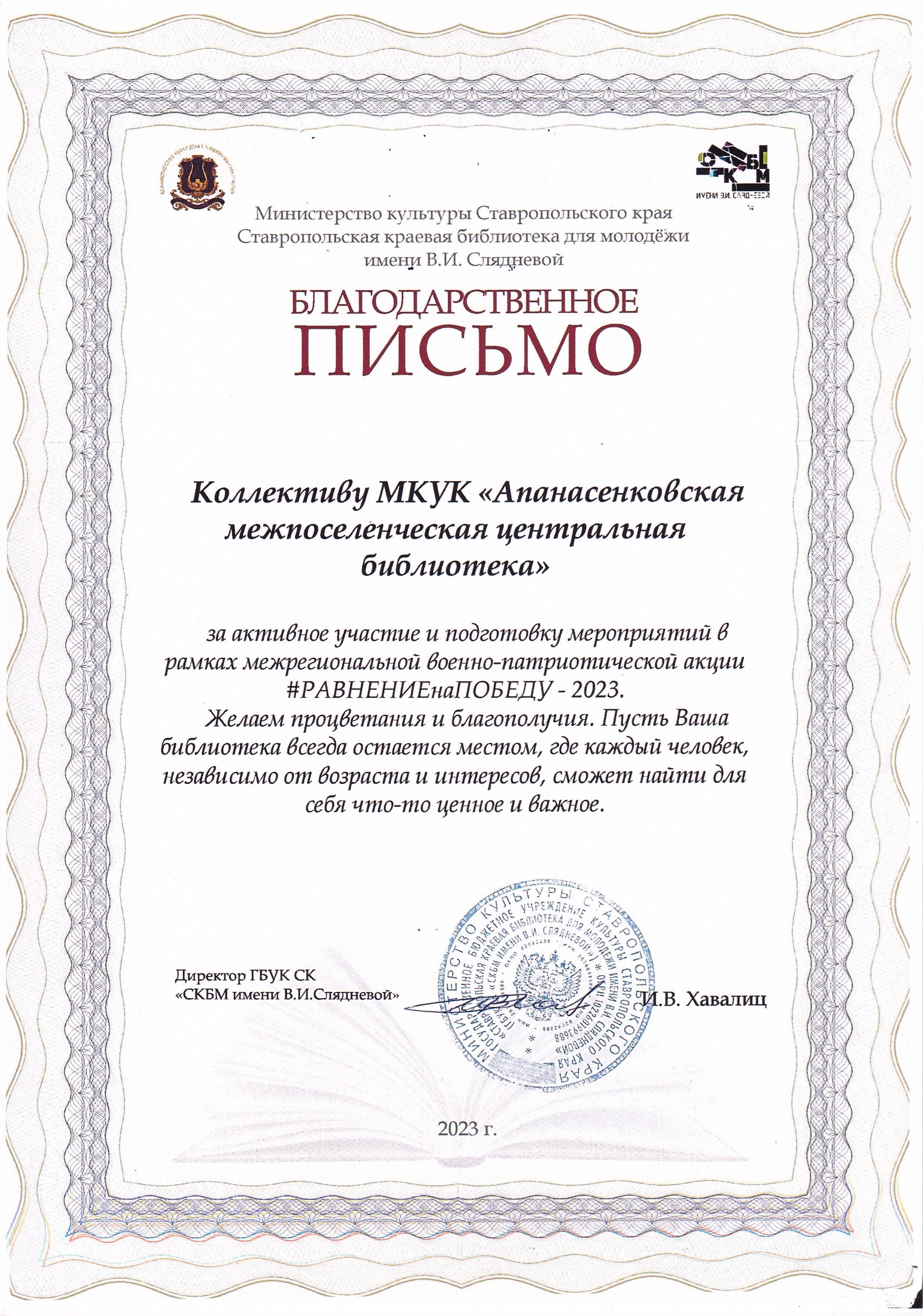 Достижения Центральной библиотеки МКУК "Апанасенковская МЦБ" за 2023 год