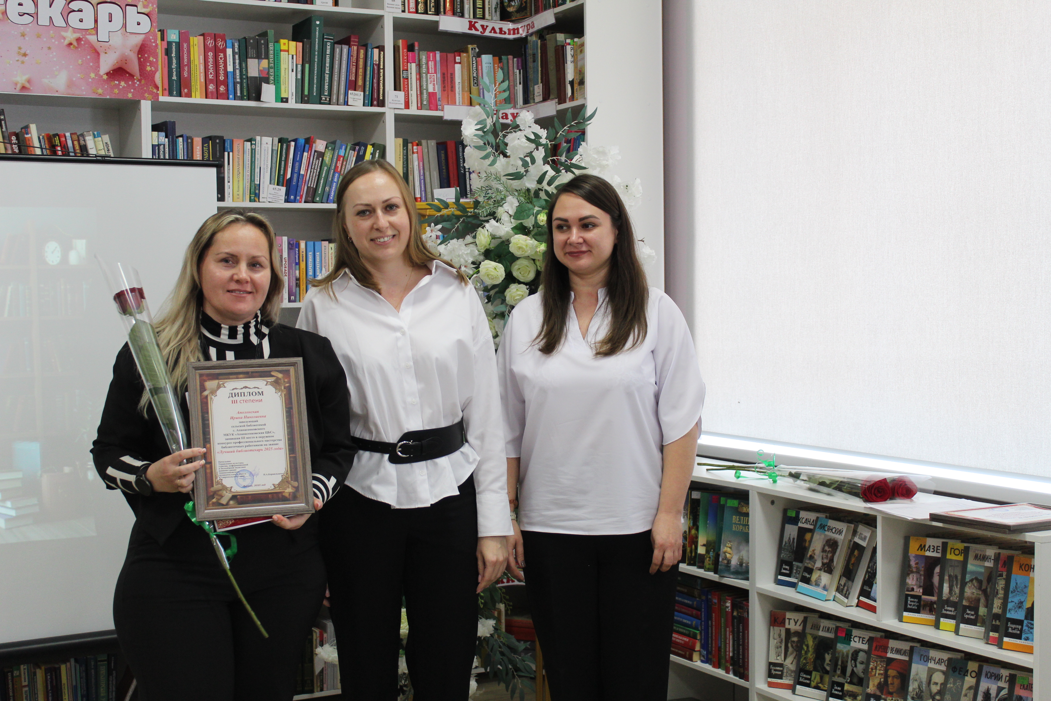 Третьего места удостоена Аполонская Ирина Николаевна – заведующий сельской библиотекой села Апанасенковского МКУК «Апанасенковская ЦБС». К призовым местам прилагались подарки: МФУ и бесперебойник, брошюратор и офисное кресло.