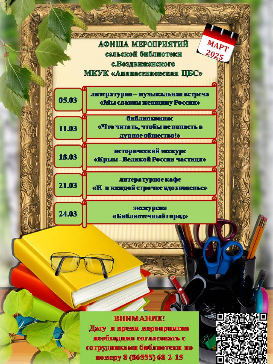 Афиша мероприятий на март сельской библиотеки с. Воздвиженского "Апанасенковская ЦБС"