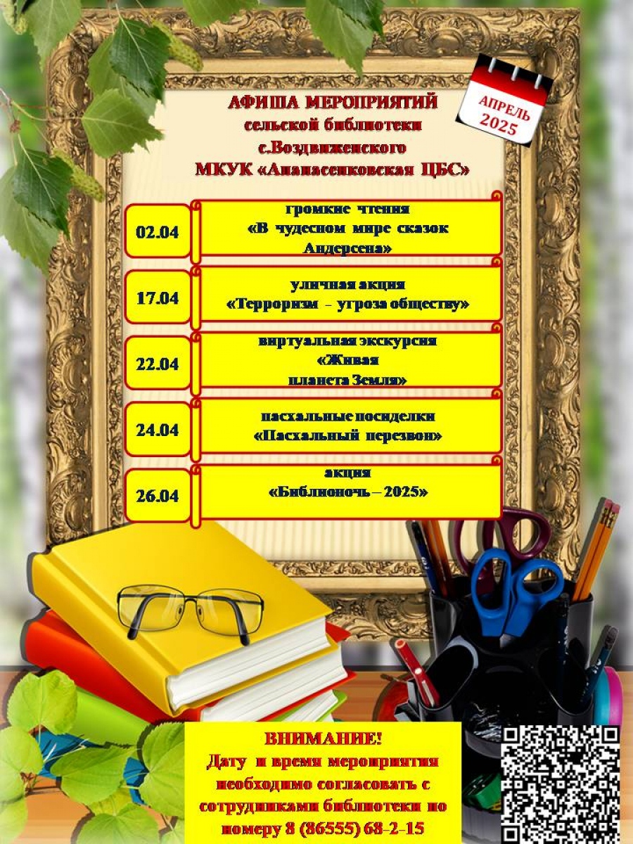 Афиша мероприятий на апрель сельской библиотеки села Воздвиженского МКУК "Апанасенковская ЦБС"