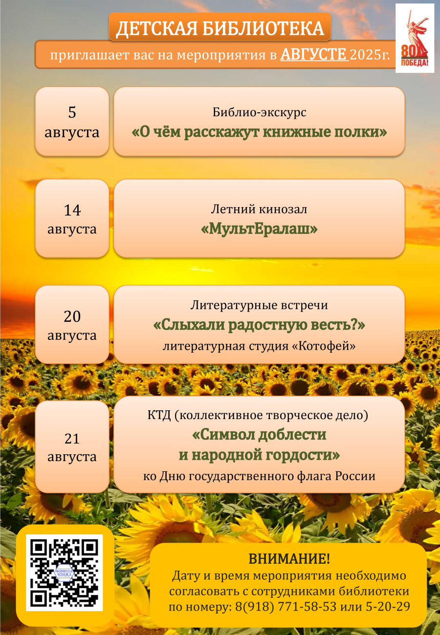 Вы находитесь здесь:Главная|Афиша|Афиша детской библиотеки на август 2025г.