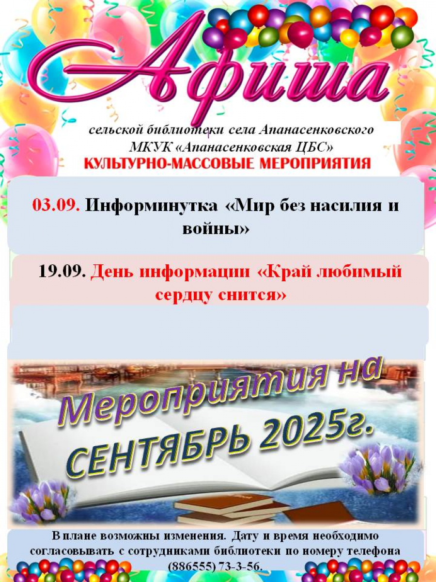 Другие материалы в этой категории: « Афиша на сентябрь Центральной библиотеки с. Дивное Афиша мероприятий на сентябрь сельской библиотеки села Воздвиженского МКУК "Апанасенковская ЦБС" »
