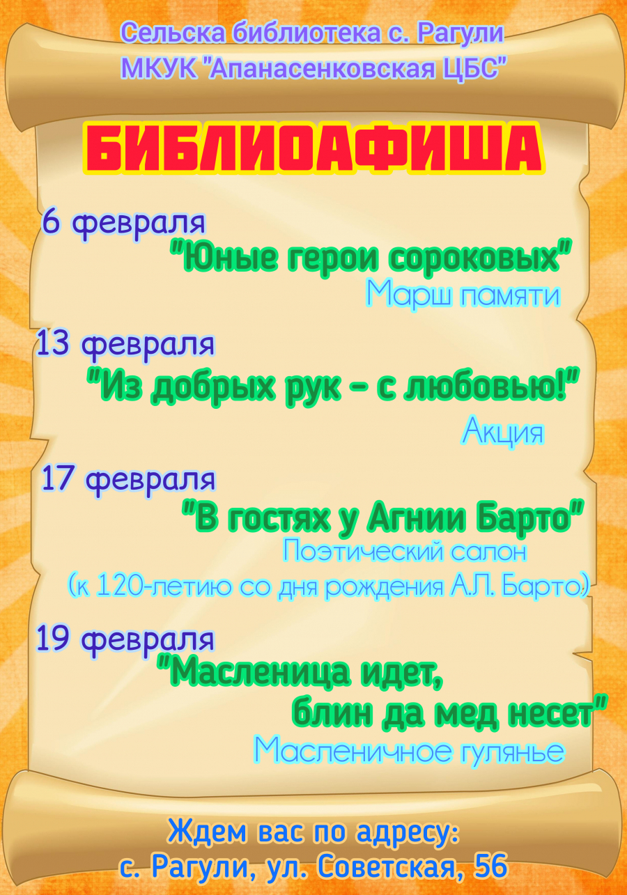 Афиша мероприятий на февраль сельской библиотеки с. Рагули